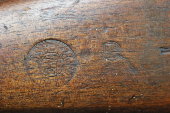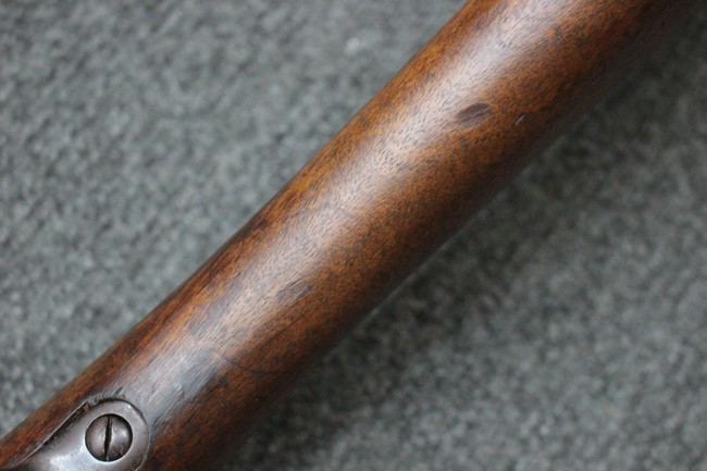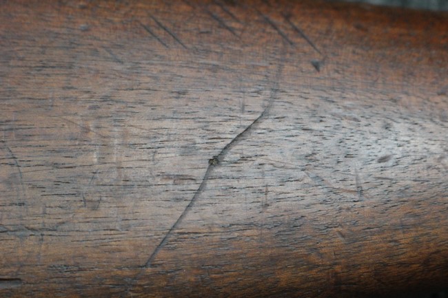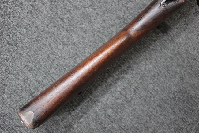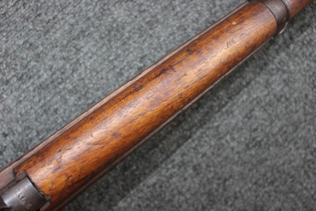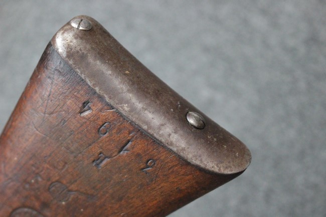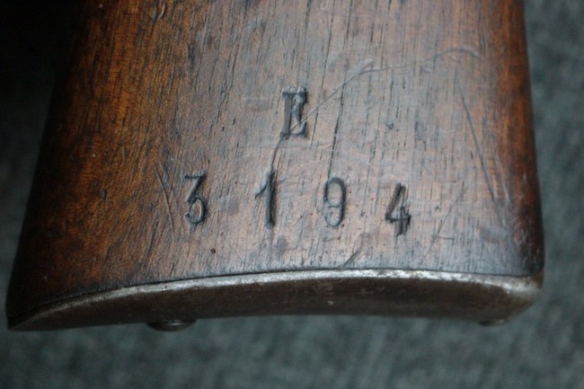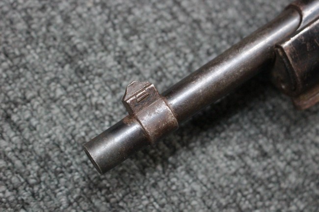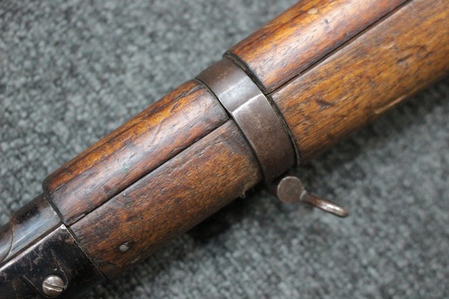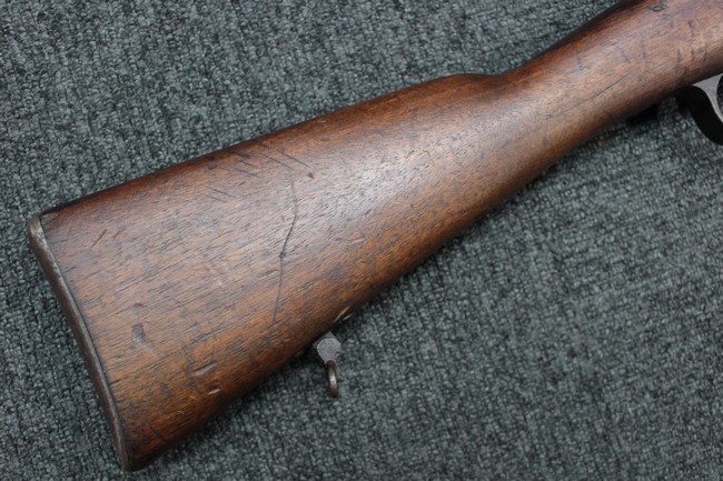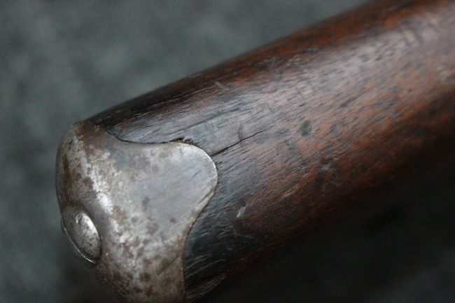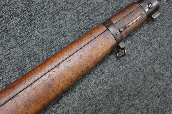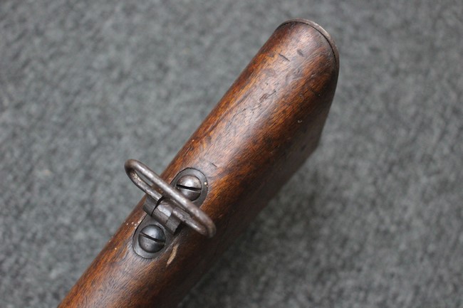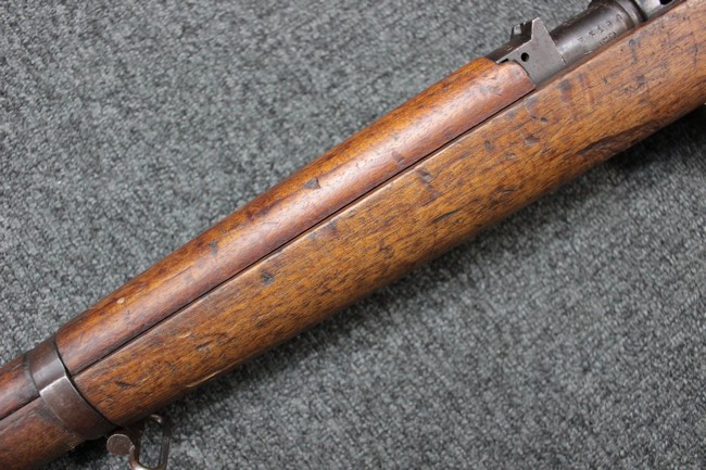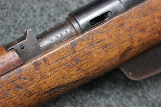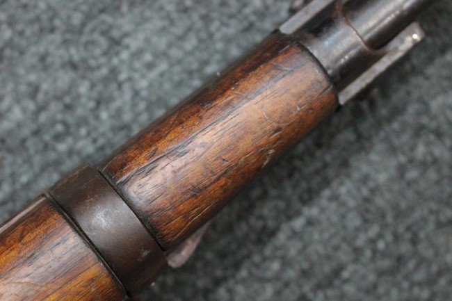 金属部は各部にブルーイングは比較的残っている印象ですが所々に擦れや小錆も見受けられます。 また若干の歪みが見られるスリングループや角部分等には経年や擦れによる銀地が見られます。 木部は全体に落ち着いた色味で、アッパー・ハンドガードとストックの色調や質感もよくマッチしています。 全体的に小傷、打ち傷が見られますが大きな破損は見られません。 銃床部左側面には見難いですがシリアルと同じE3194や1941などの刻印が確認でき、経年感は見られるもののおおむね良好な状態の品です。 傷み易いバット・プレート部については、擦れや小傷、銀地も見られますが銃床への取り付けもがたつきもなくしっかりとしています。 尚、さく杖は付属致しません。