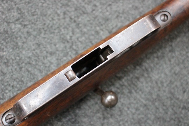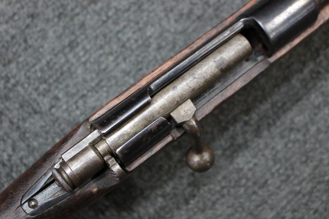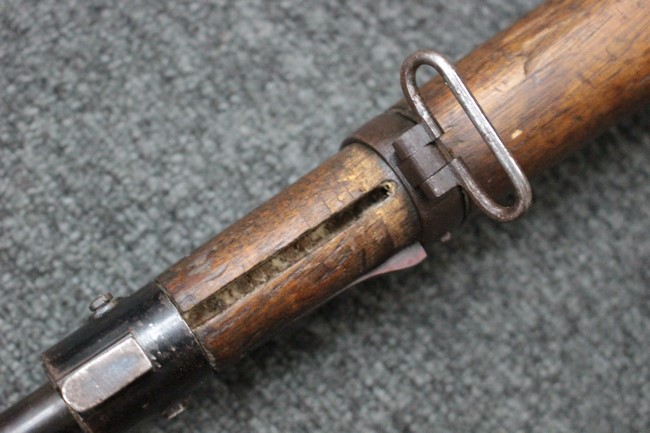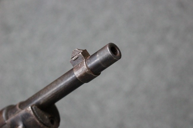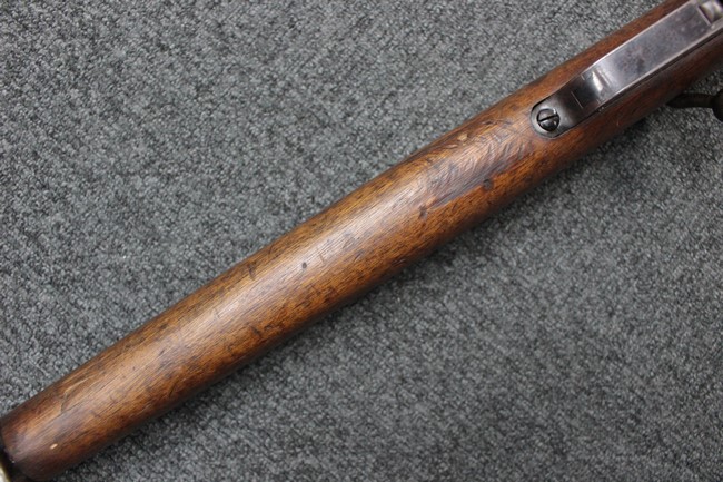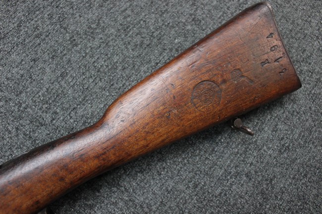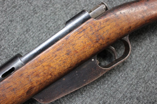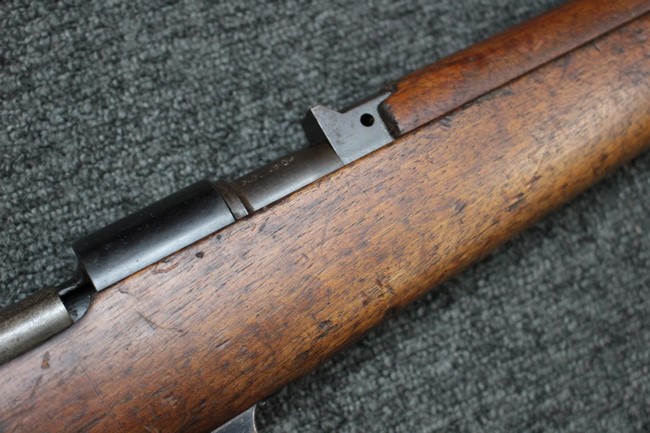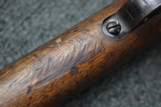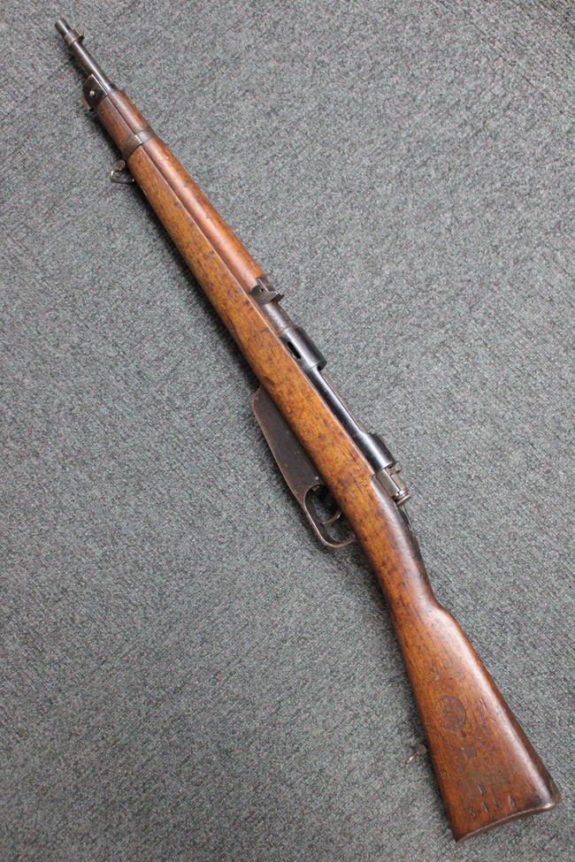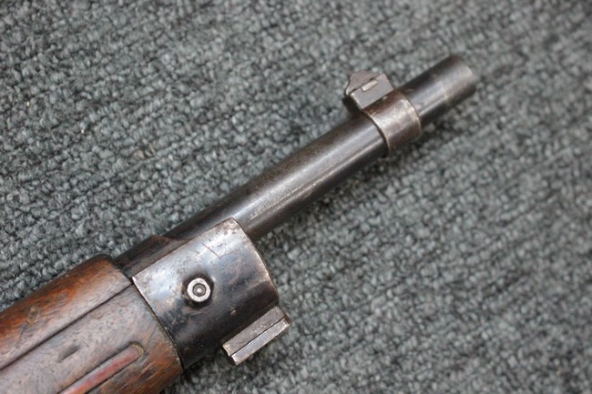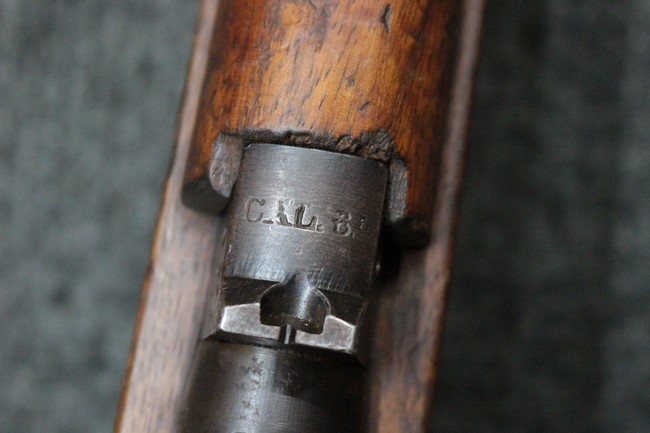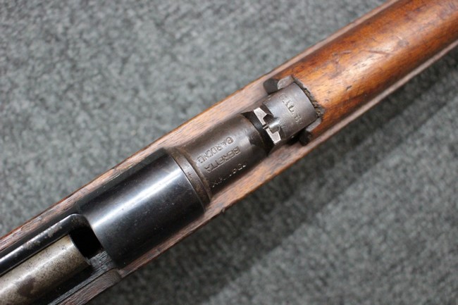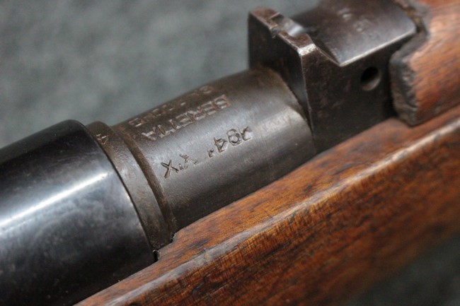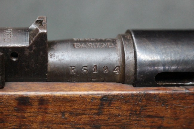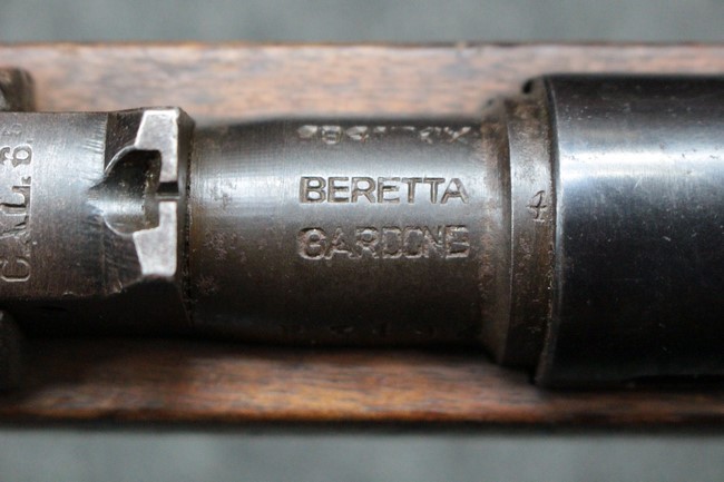 カルカノ小銃には通常の騎兵銃や短小銃とは別に「TS (Truppe Speciali)」と呼ばれる、砲兵や工兵、輜重兵といった部隊向けにM1891 歩兵銃を短縮したモデルが存在し、海軍部隊や民兵組織等にも供給されました。 通常のM1891 騎兵銃とは異なり、フロント・バンド下部に着剣ラグが設けられているのが特徴です。 M1891/38 TS 短小銃はTSモデルの最終型で、1938年から1940年にかけて7,35mm弾仕様のタイプが製造されていましたが、1940年以降はM1938 短小銃と同様に、口径を6,5mm仕様としたモデルが製造されました。 リア・サイトについてもM1938 短小銃と同様に固定式のタイプが装備されており、リア・サイト前部には使用弾薬の口径を示す「CAL. 6,5」の刻印が入っています。 6,5mm仕様のM1891/38 TS 短小銃の製造はベレッタ社及びF.N.A. Brescia社のみで行われ、約198,000挺が製造されたと言われています。