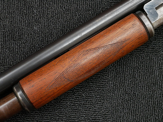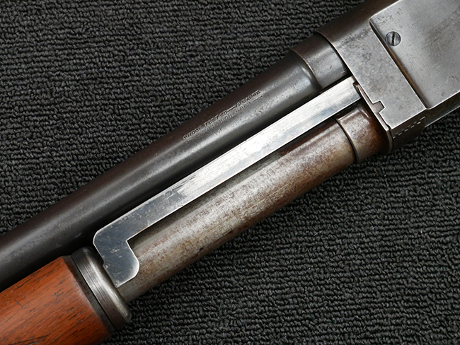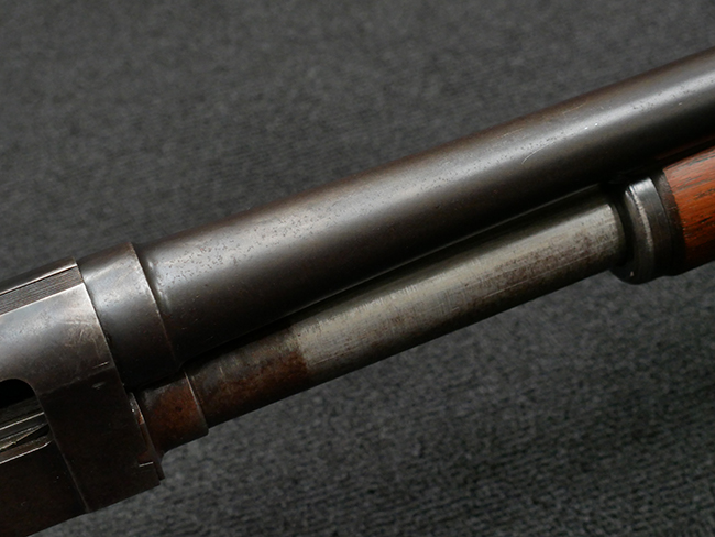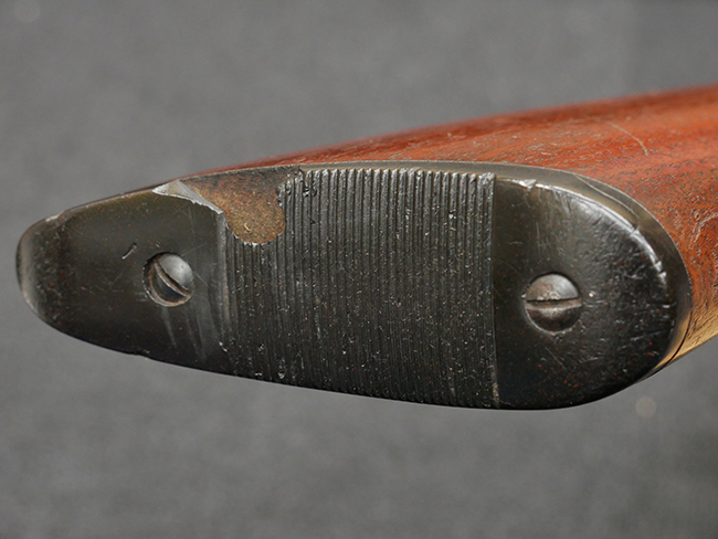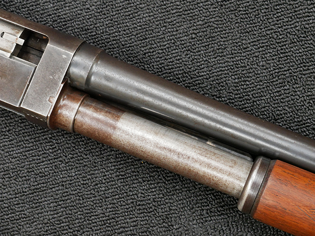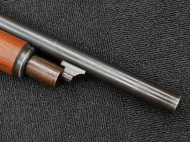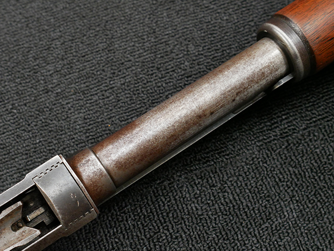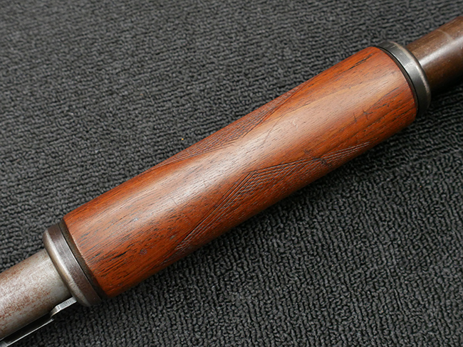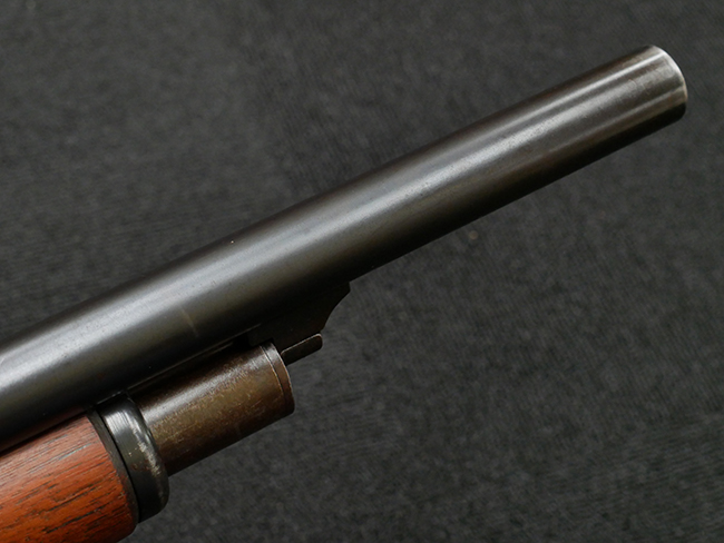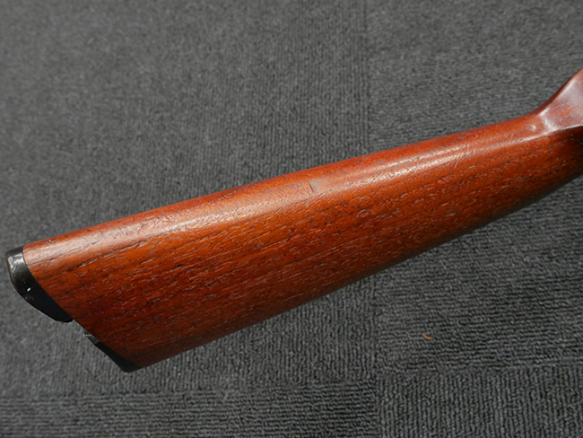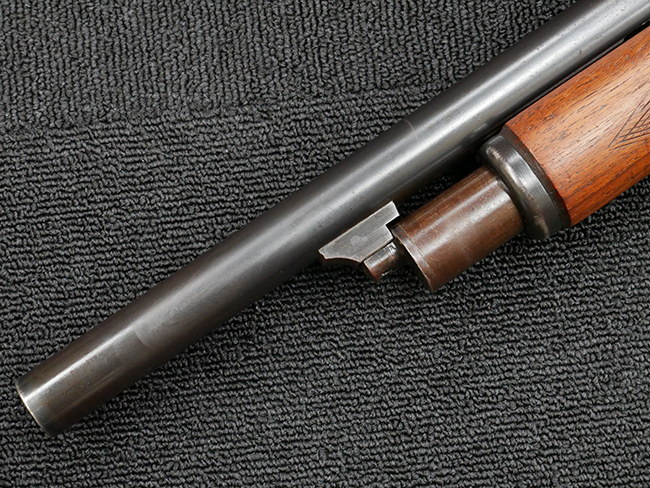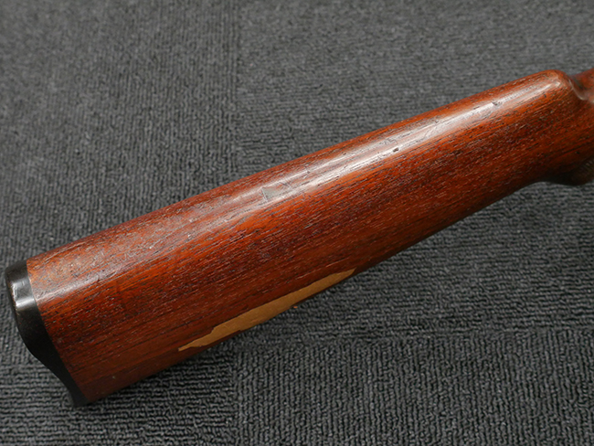 本品の金属部は全体に打ち傷や擦れ、経年による褪色の他、一部に表面錆が見受けられるものの、いずれも大きな欠損やがたつきも見受けられず、概ねしっかりとした状態が保たれています。木製のフォア・エンドは全体に良好な状態ですが木製のバット・ストックについては、一部に打ち傷や線傷が見られる他、強度的には問題無いものの右側面には長さ8cm程に渡って樹脂によると思われる補修痕が見られます。 尚、こちらも強度に問題は無いもののバット・プレートに左側に2.5cm程の欠けが見受けられます。