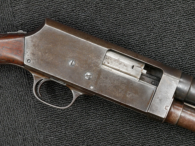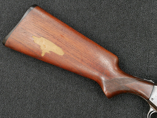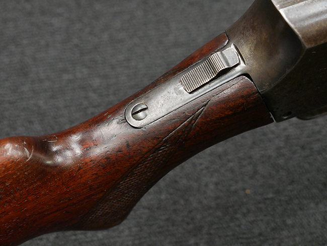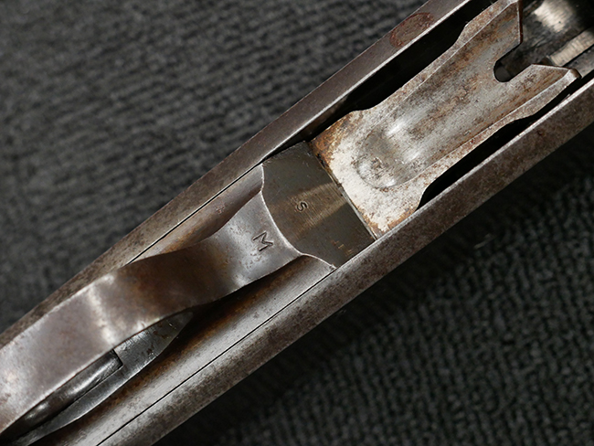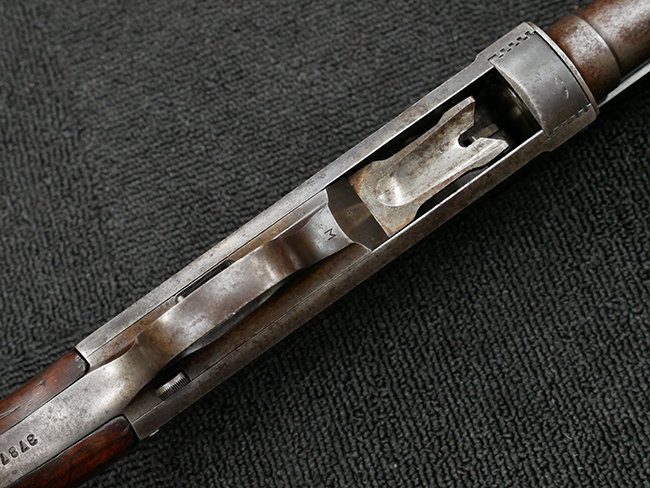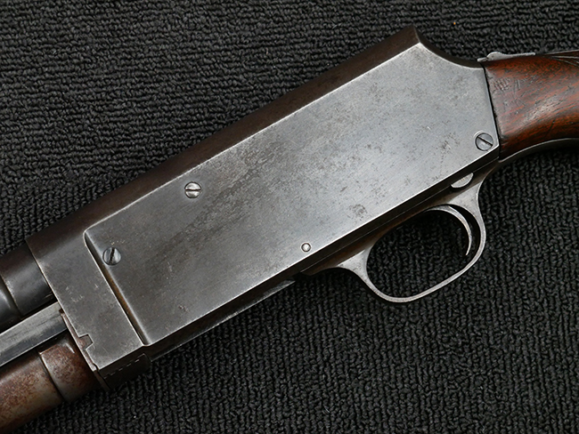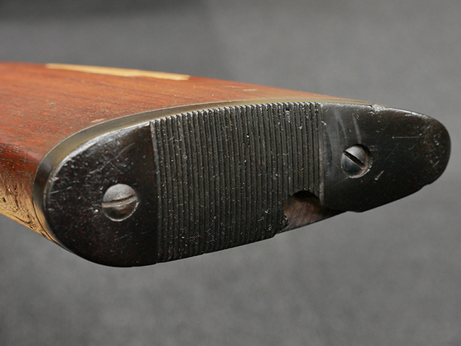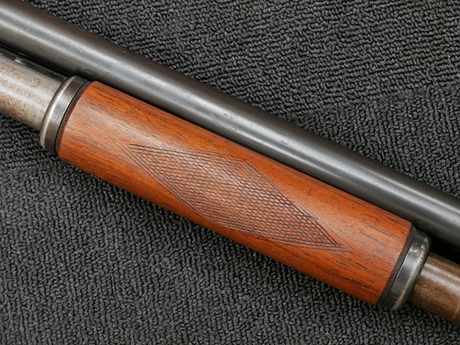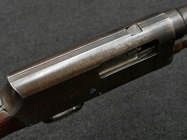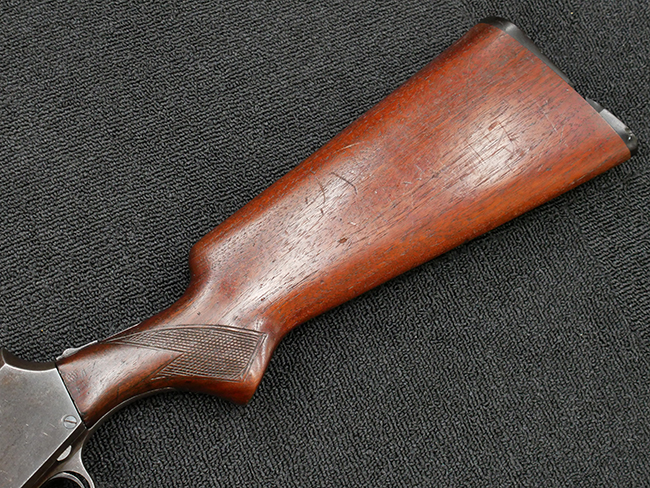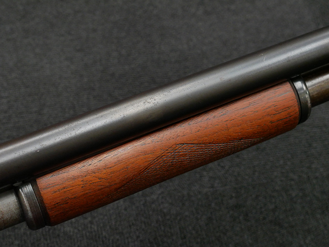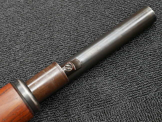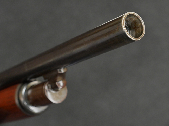 本品の金属部は全体に打ち傷や擦れ、経年による褪色の他、一部に表面錆が見受けられるものの、いずれも大きな欠損やがたつきも見受けられず、概ねしっかりとした状態が保たれています。木製のフォア・エンドは全体に良好な状態ですが木製のバット・ストックについては、一部に打ち傷や線傷が見られる他、強度的には問題無いものの右側面には長さ8cm程に渡って樹脂によると思われる補修痕が見られます。 尚、こちらも強度に問題は無いもののバット・プレートに左側に2.5cm程の欠けが見受けられます。