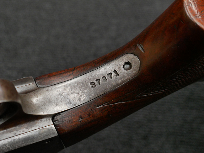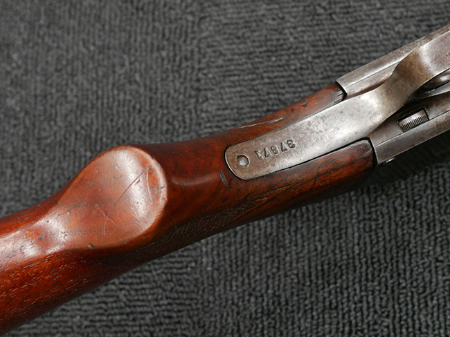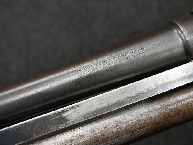 本品は12GAのスティーブンス モデル520Aショットガンです、銃身長は約20インチとなっています。 トリガー・ガード前方にSやM、後方にシリアル37871が打刻されている他、銃身左側面にはPROOF TESTED-12GAUGE-2 3/4INCH CHANBERの刻印が確認出来ます。