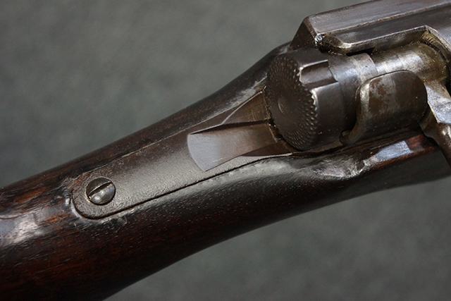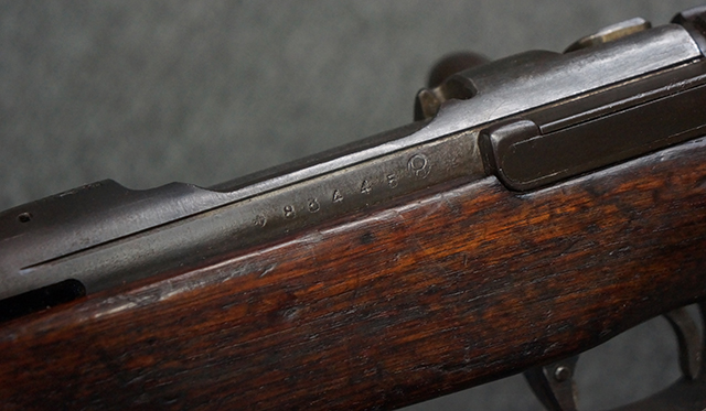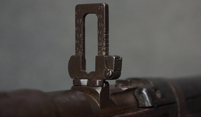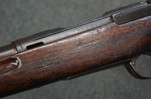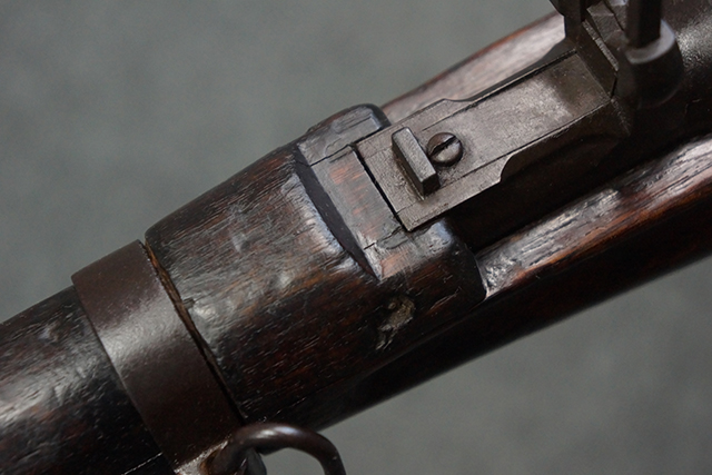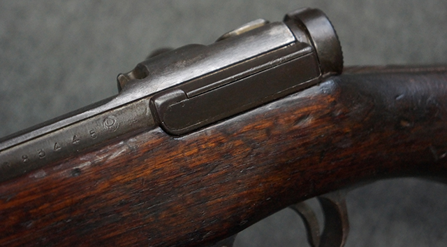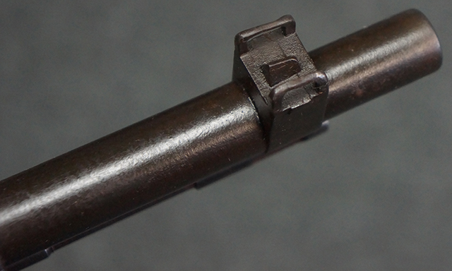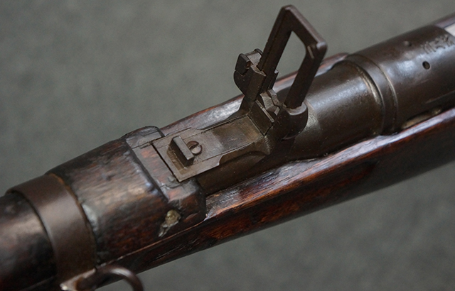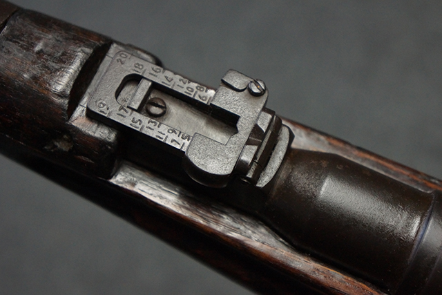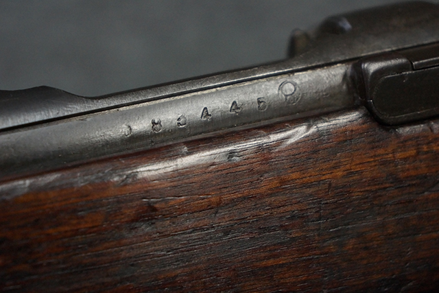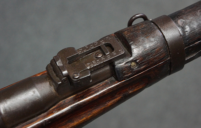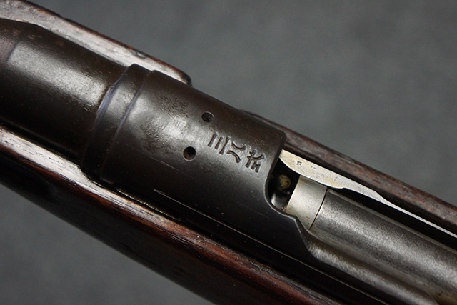 本品のシリアルNo.は83445で、機関部左側面にはシリアルNo.及び名古屋工廠製を示す刻印の他、<ホ>のシリーズ刻印が入っています。 その他、上帯下部に機関部とマッチした「445」の番号が入っています。 薬室上面の「三八式」のモデル名刻印ははっきりと残っていますが、菊花紋章は削られています。 照星は前中後期型に共通するガードが付いており、安全子は窪みの有る後期型、床尾板もカップ型の後期型です。 照門は前~後期共通のVノッチ型です。