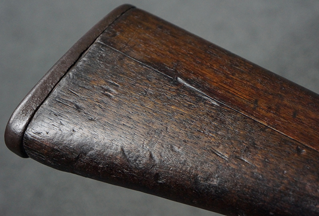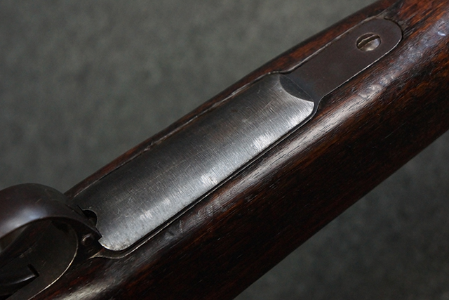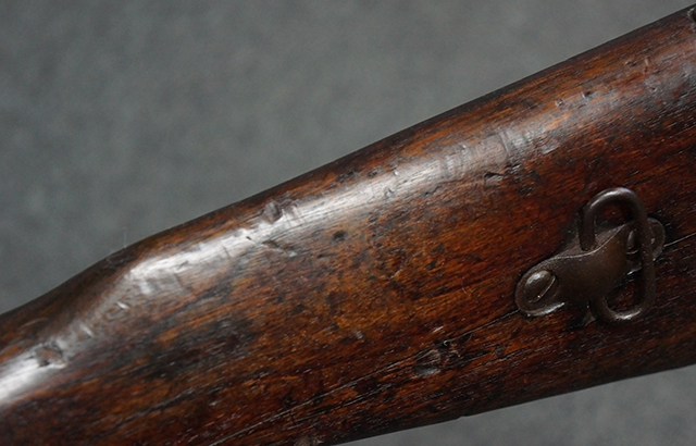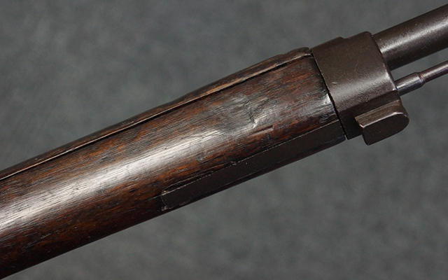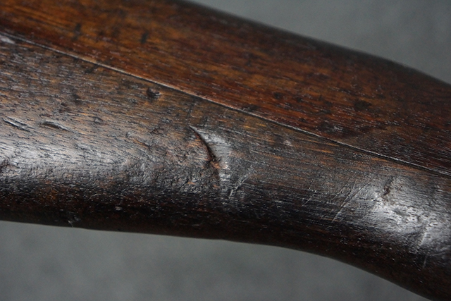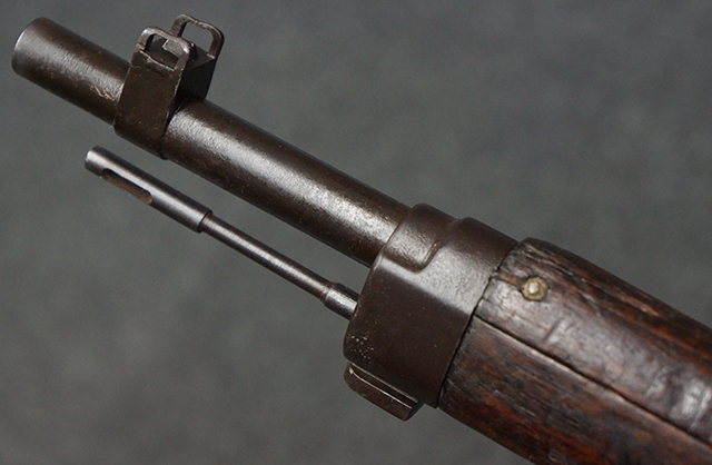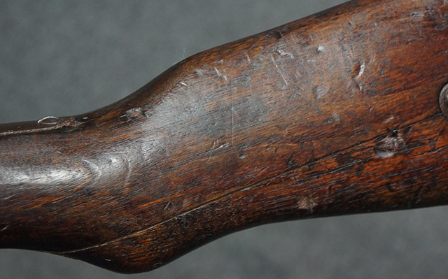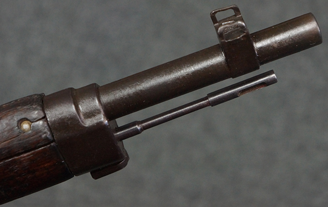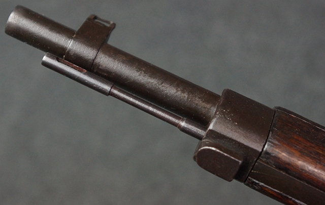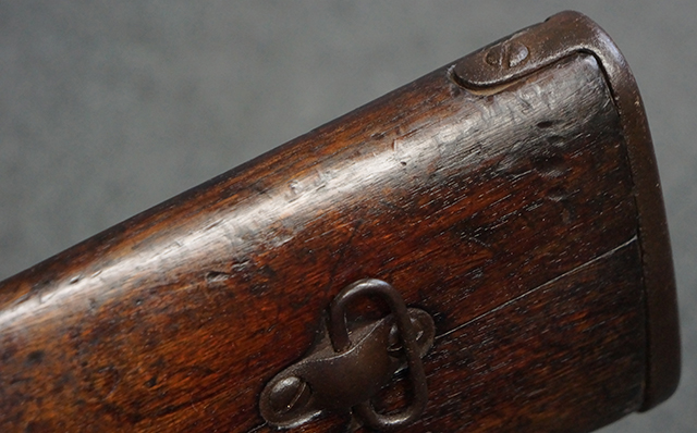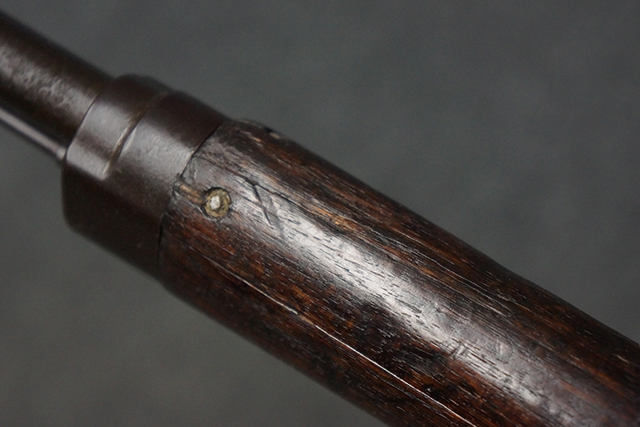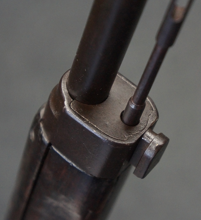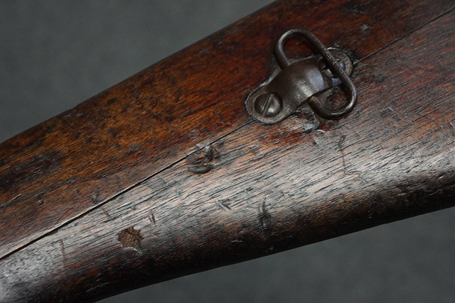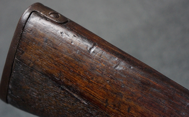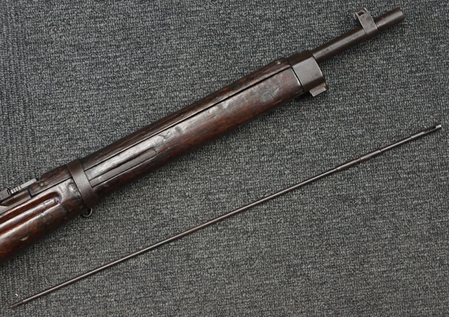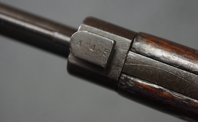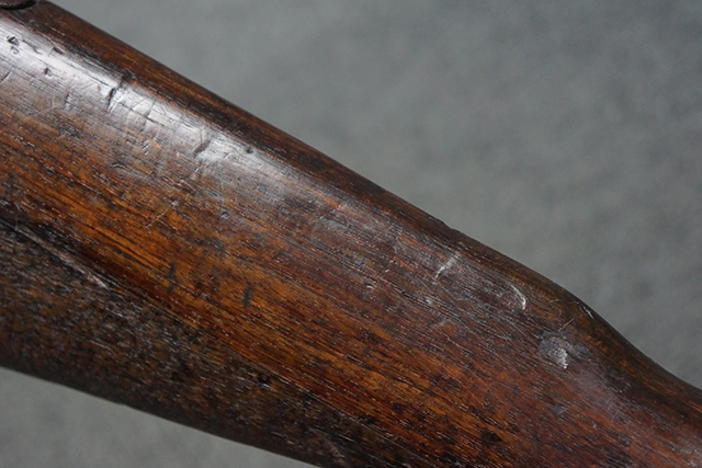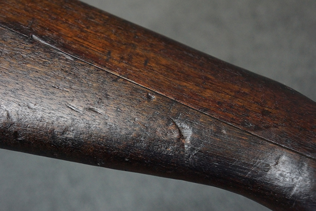 本品は全体に適度に使い込まれたコンディションとなっており、金属部はやや擦れや経年による褪色の他、槓桿や上/下帯、上/下支鉄等にやや表面錆や朽ち込み痕が見受けられますが、全体としては大きな欠損は見受けられず、概ねしっかりとした状態が保たれています。 照星のガード部分や下帯の負革止にやや歪みが見られます。 木部については、銃床側面にやや深い打ち傷や線傷が見られる他、木被の前後端にクラックが見られますが、全体としては大きな欠損は見られず、強度的にも比較的しっかりとした状態が保たれています。 銃床上下の継ぎ目については、やや隙間が見られますが、現状目立ったがたつきは見られません。 床尾板取付部周辺の木部にやや痩せが見られます。 傷み易い床尾板についても、全体に時代錆や表面錆痕が表れており、銃床への取り付けに若干のがたつきが見られますが、それほど気にならないレベルのものです。 照尺の既倒・調整や弾倉底板の着脱については問題なく行う事が可能です。 弾倉内の弾受 (フォロワー) 及び撥条は入っています。 復刻品のさく杖が付属致します。