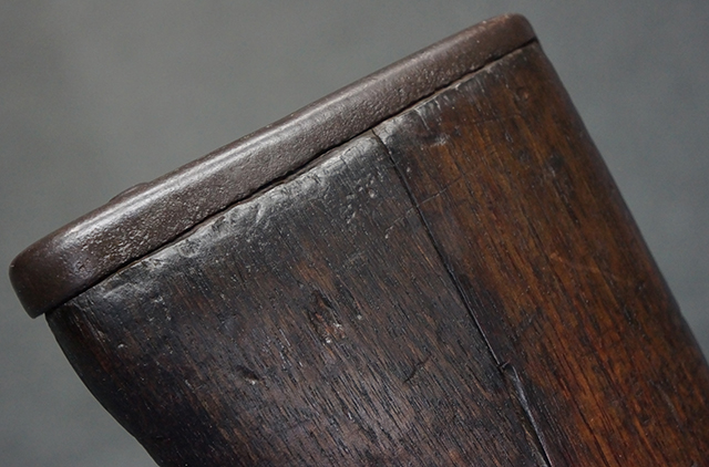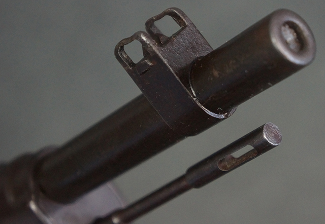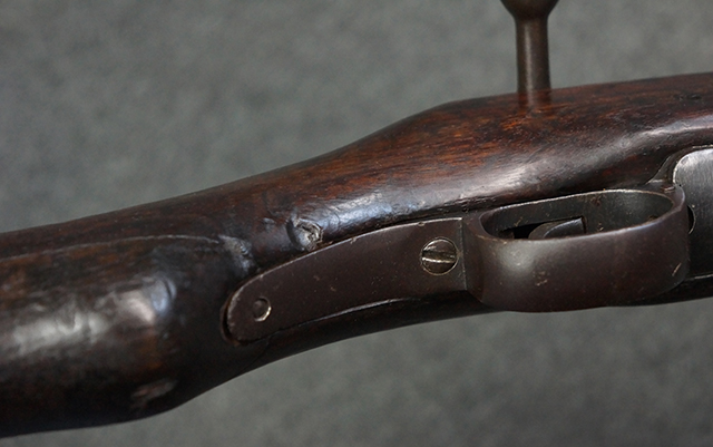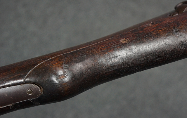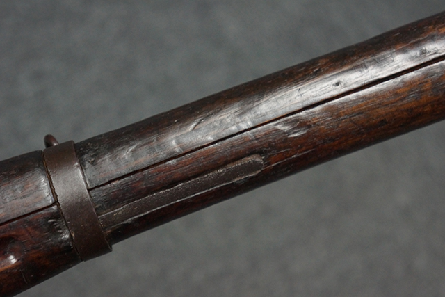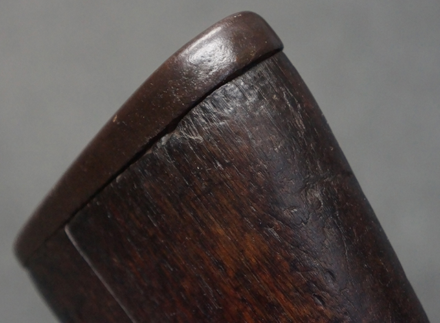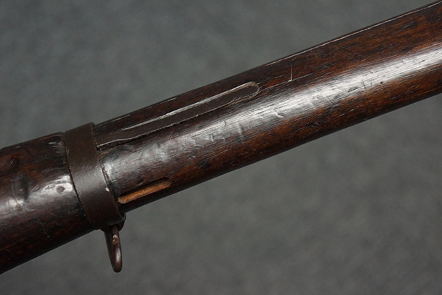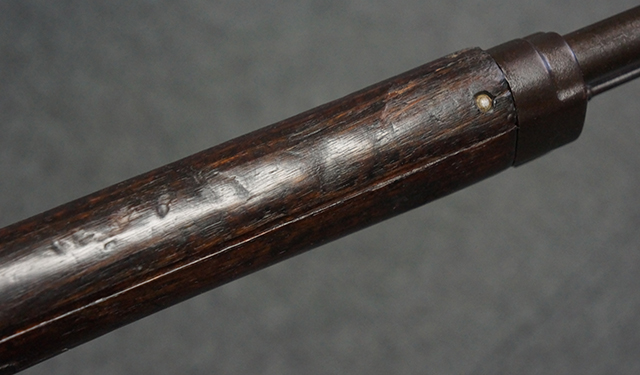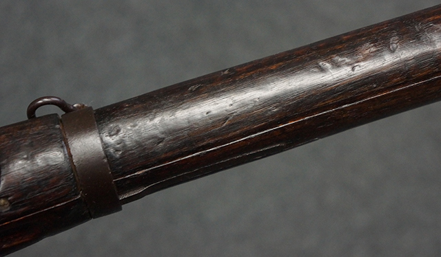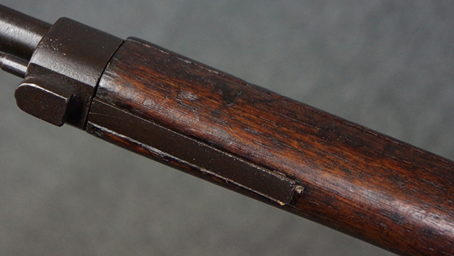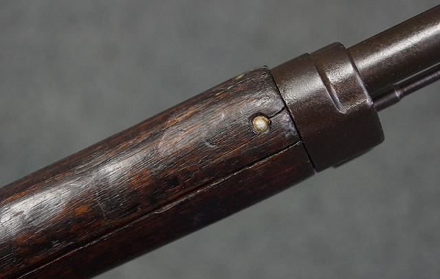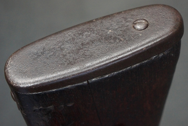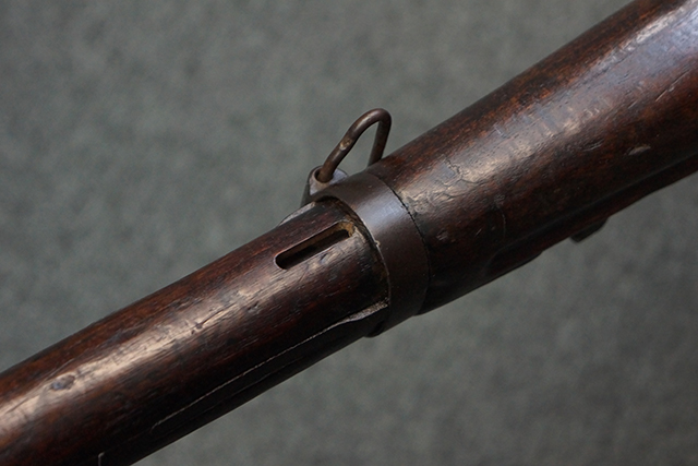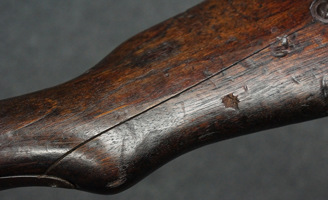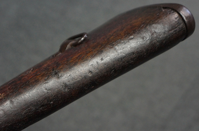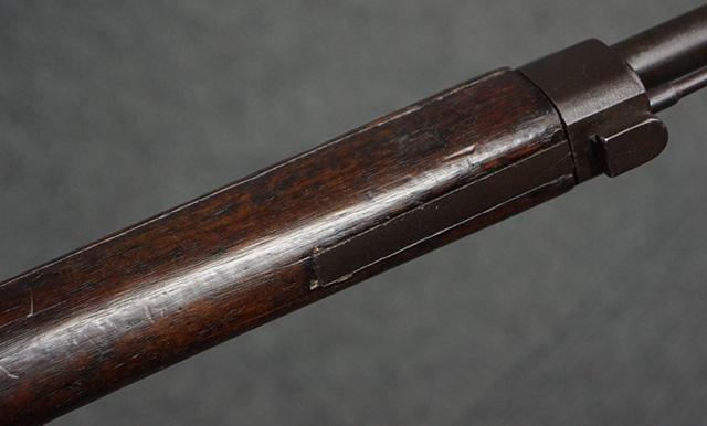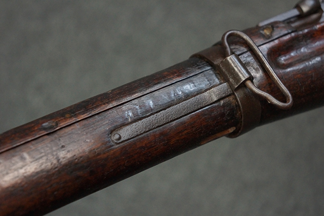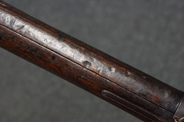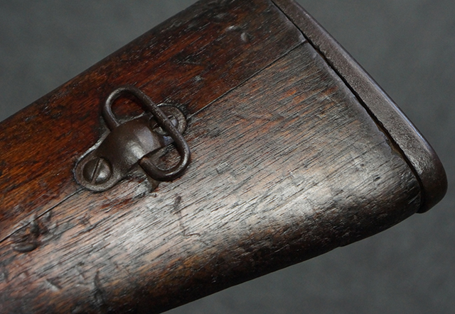 本品は全体に適度に使い込まれたコンディションとなっており、金属部はやや擦れや経年による褪色の他、槓桿や上/下帯、上/下支鉄等にやや表面錆や朽ち込み痕が見受けられますが、全体としては大きな欠損は見受けられず、概ねしっかりとした状態が保たれています。 照星のガード部分や下帯の負革止にやや歪みが見られます。 木部については、銃床側面にやや深い打ち傷や線傷が見られる他、木被の前後端にクラックが見られますが、全体としては大きな欠損は見られず、強度的にも比較的しっかりとした状態が保たれています。 銃床上下の継ぎ目については、やや隙間が見られますが、現状目立ったがたつきは見られません。 床尾板取付部周辺の木部にやや痩せが見られます。 傷み易い床尾板についても、全体に時代錆や表面錆痕が表れており、銃床への取り付けに若干のがたつきが見られますが、それほど気にならないレベルのものです。 照尺の既倒・調整や弾倉底板の着脱については問題なく行う事が可能です。 弾倉内の弾受 (フォロワー) 及び撥条は入っています。 復刻品のさく杖が付属致します。