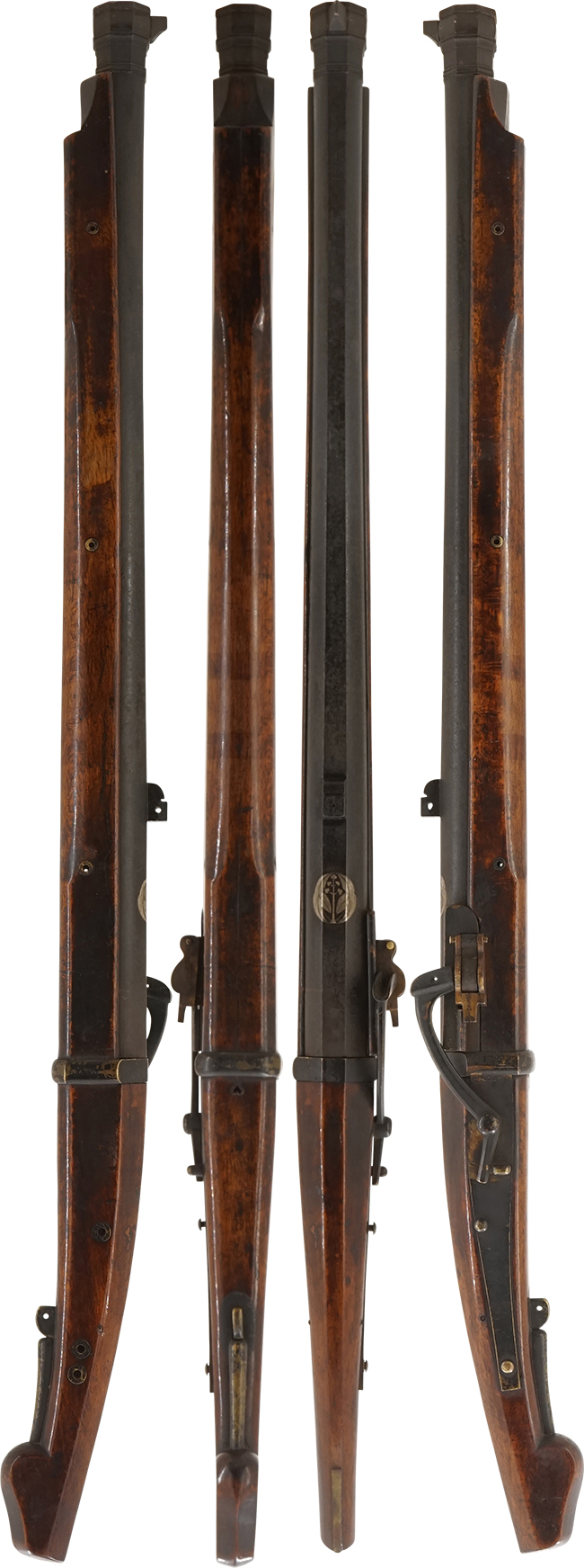 本品の筒 (銃身) は全体に黒錆に覆われていますが、これは当時の日本における防錆方法であった錆付けと同じ処理方法によるもので、欧米のようにブルー仕上げがなかった日本では一般的なものでした。 銃身は若干の表面錆痕や一部鉄地表面の僅かな荒れが見られるものの、製造された時代を考慮すると非常に良好でしっかりとした状態が保たれています。 また、銃身に施された刻印もはっきりと確認出来ます。 銃身下部の目釘金具と台 (銃床) の目釘穴の位置は3箇所とも一致しています。 台 (銃床) についても同様に仕上げが美しく残った良好な状態が保たれており、打ち傷等も最小限となっていますが、経年の使用感はあります。