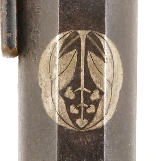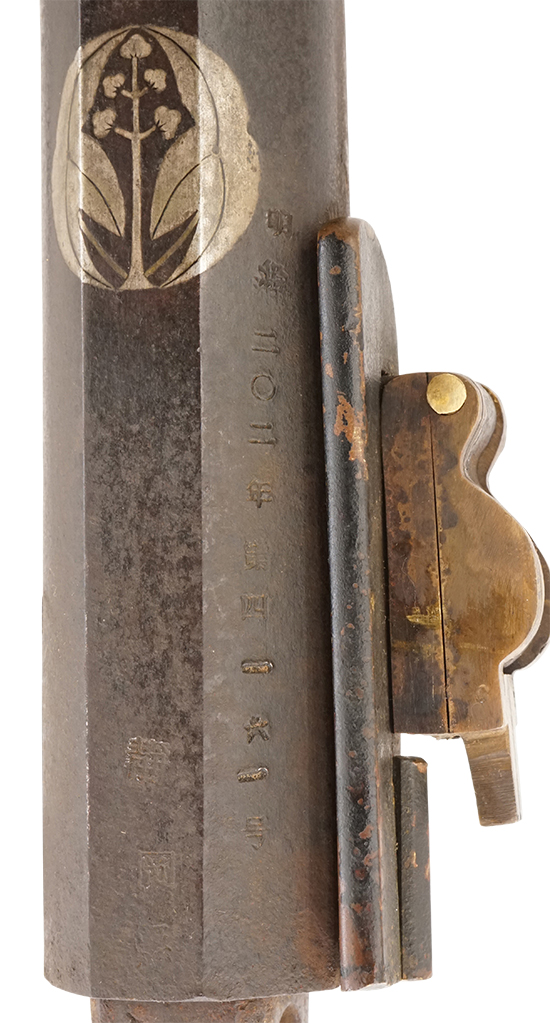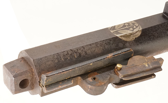 本品の銃身右側には「明治ニ○ニ年第四一六一号」、銃身上面は「静岡縣」の文字が打刻されています。 また元目当後方には作行の良い銀象嵌を施した「抱キ沢瀉紋」の一種である家紋見られ本品の全体的な価値を高めています。 無銘ですが鉄味の良い筒(銃身)は後方に向かって広がった丸銃身で、その上面だけを平らにした「表一角」と呼ばれる形状となっています。 銃口部周りには筋立ての施された八角柑子が設けられています。 先目当はしっかりとした三角形となっており、元目当は筋割となっています。 銃身は銃床に対して3箇所の目釘により固定される構造となっています。