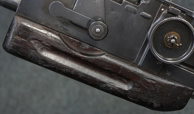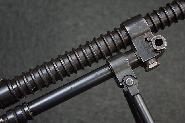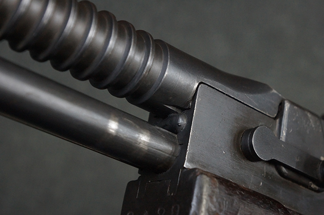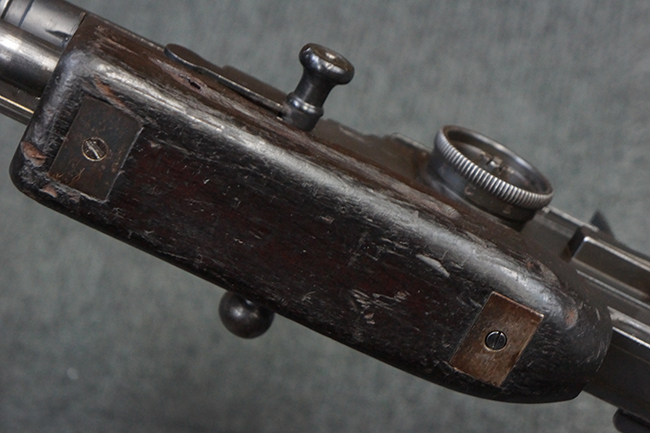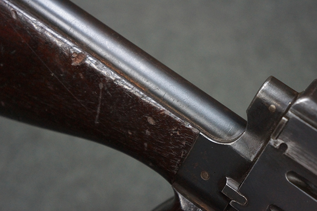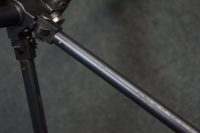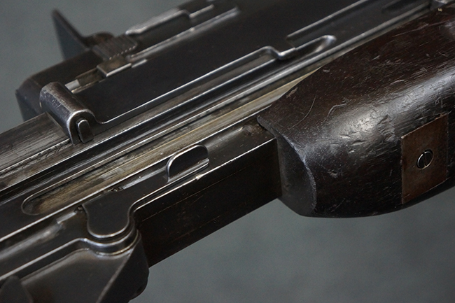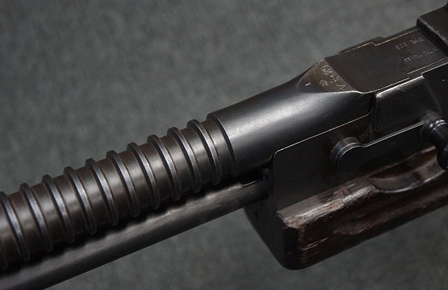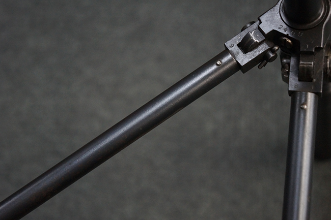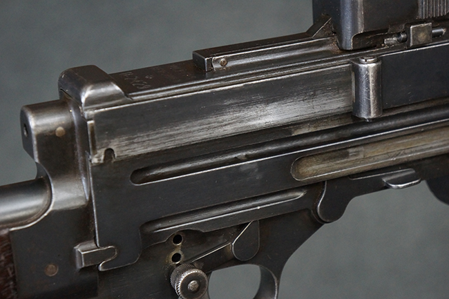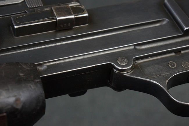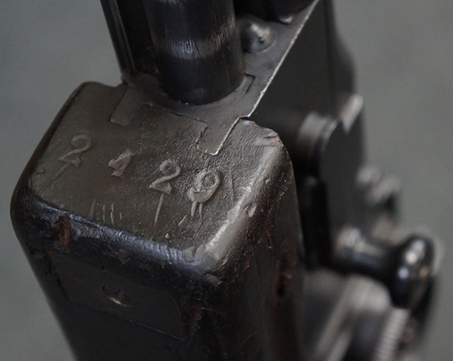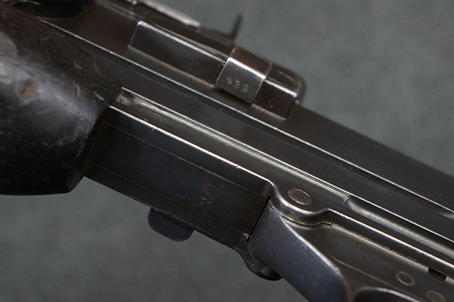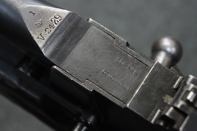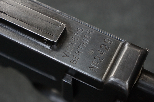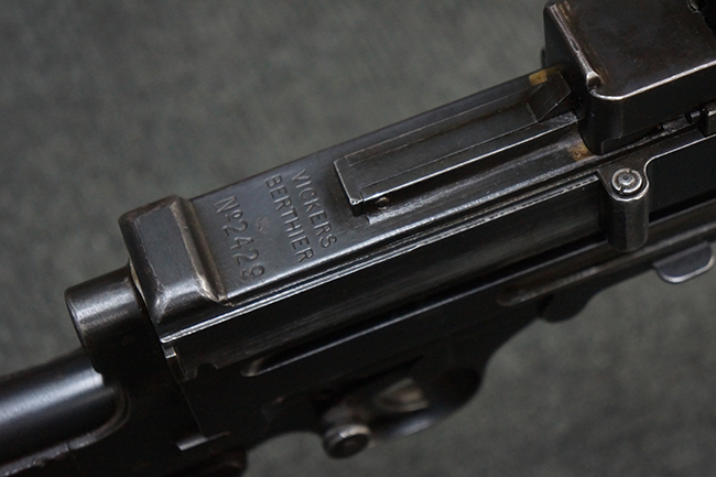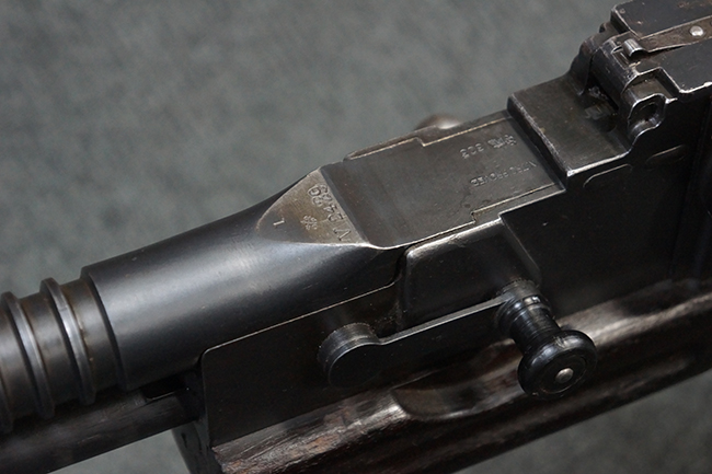 本品の機関部後部上面にはシリアルNo.2429に加えて「VICKERS BERTHIER」の刻印が入っています。 シリアルNo.は機関部、銃身、ハンドガード、マガジン・リリース・レバーでマッチしています。 銃身基部上面には「NITRO PROVED」の刻印及び「303」の口径表示刻印が入っています。 尚、マガジン取付部のダスト・カバーのシリアルNo.は2338、二脚基部は2409となっています。