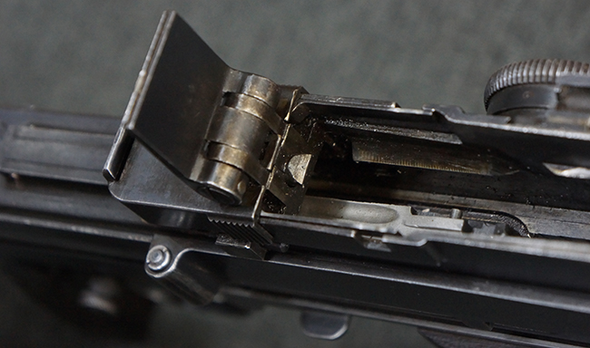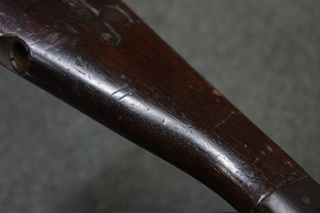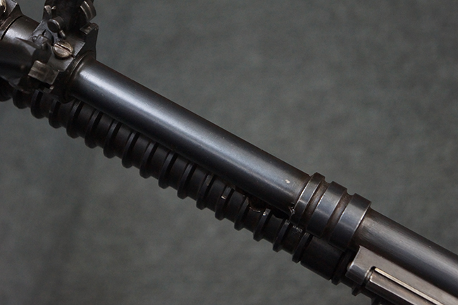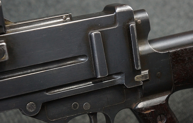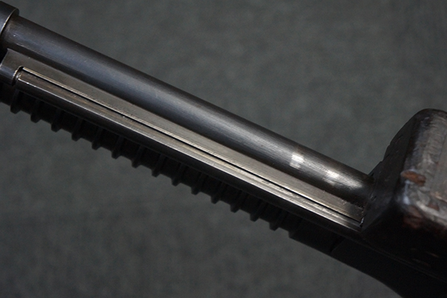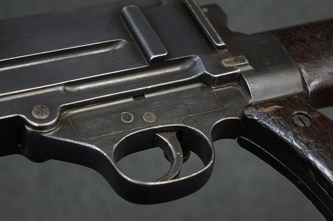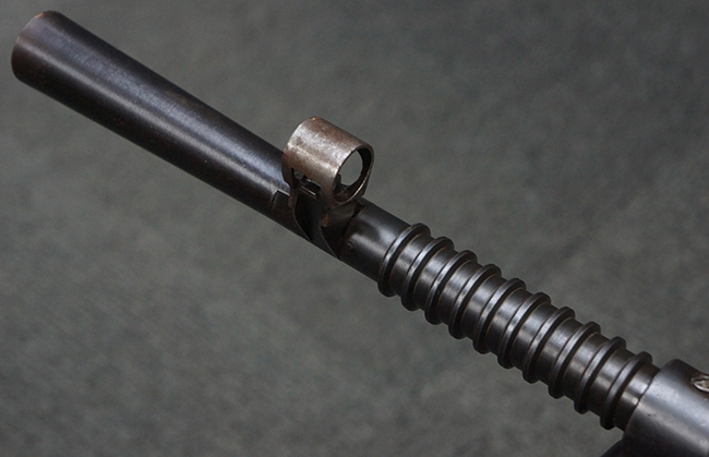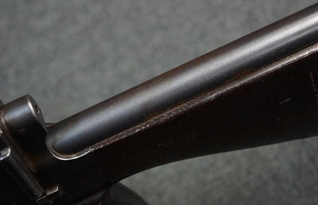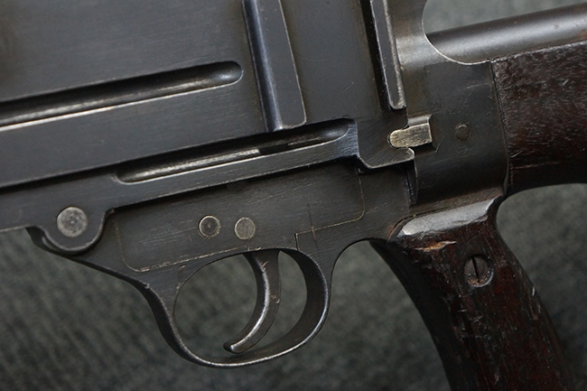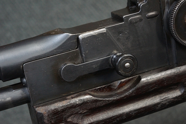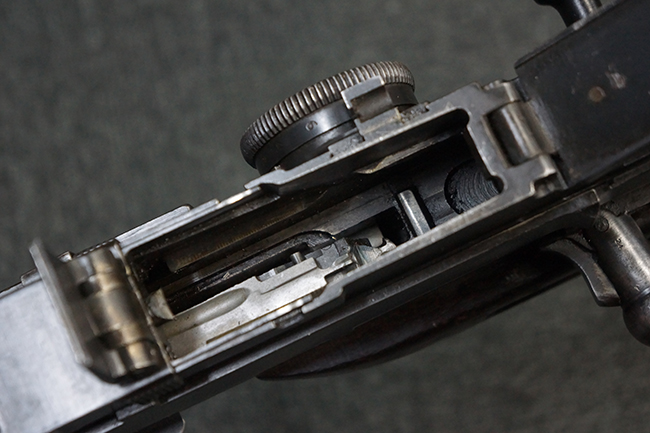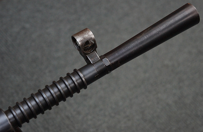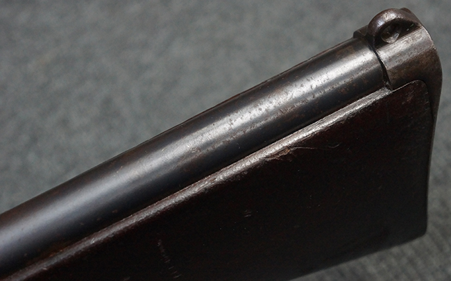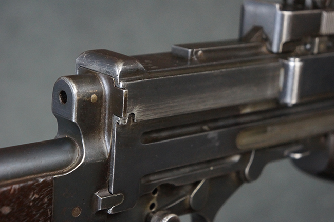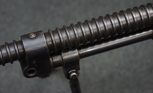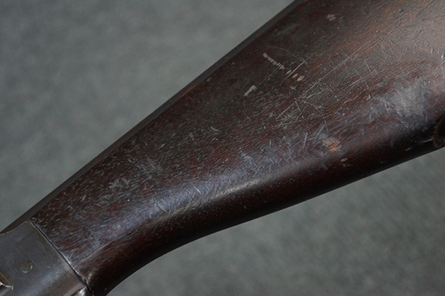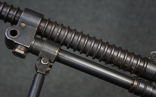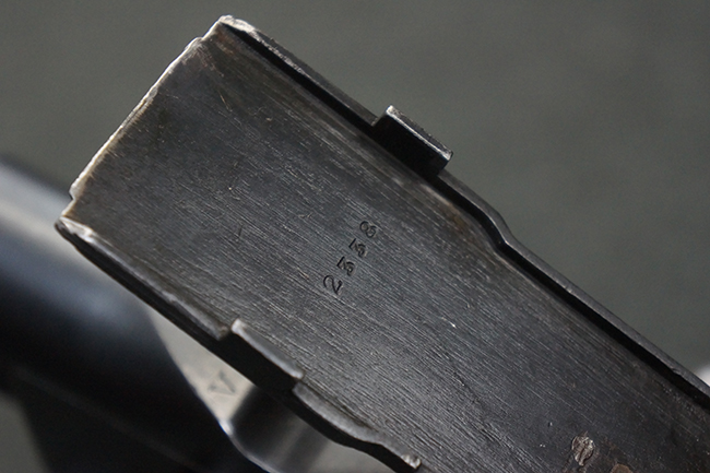 本品の機関部後部上面にはシリアルNo.2429に加えて「VICKERS BERTHIER」の刻印が入っています。 シリアルNo.は機関部、銃身、ハンドガード、マガジン・リリース・レバーでマッチしています。 銃身基部上面には「NITRO PROVED」の刻印及び「303」の口径表示刻印が入っています。 尚、マガジン取付部のダスト・カバーのシリアルNo.は2338、二脚基部は2409となっています。