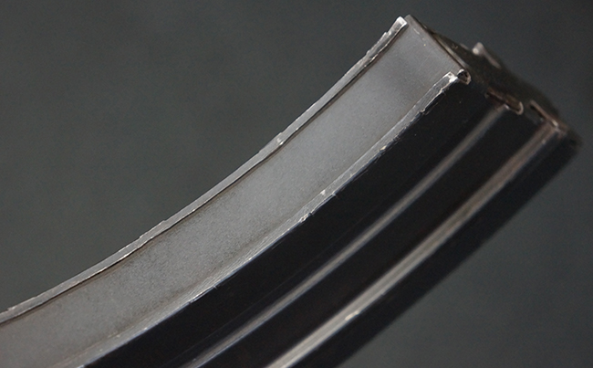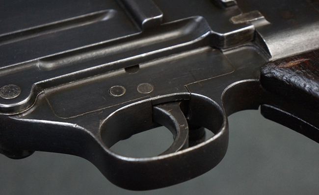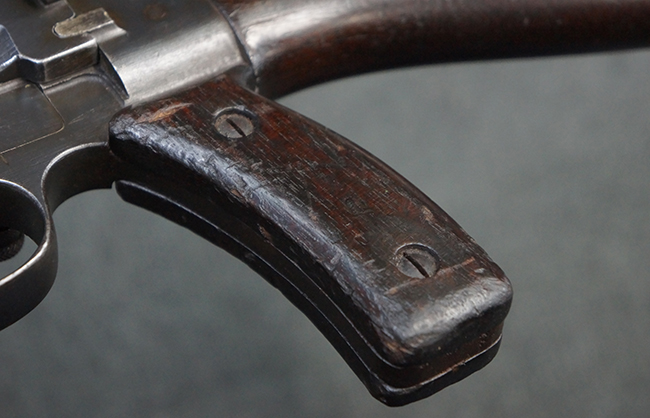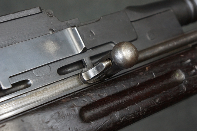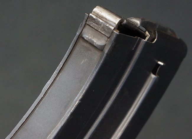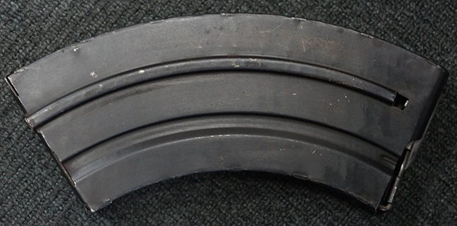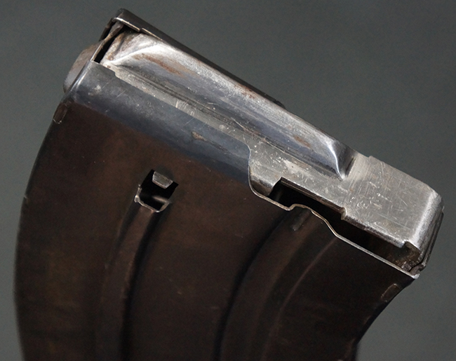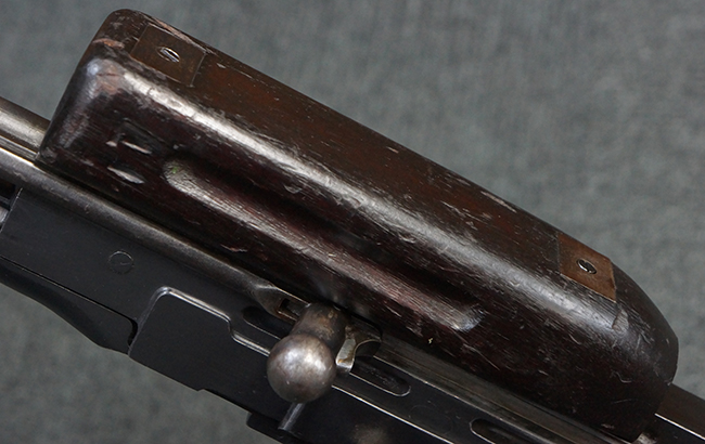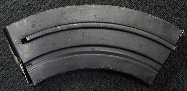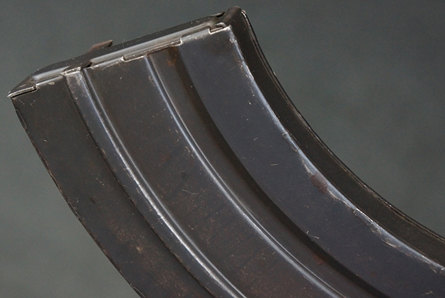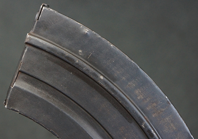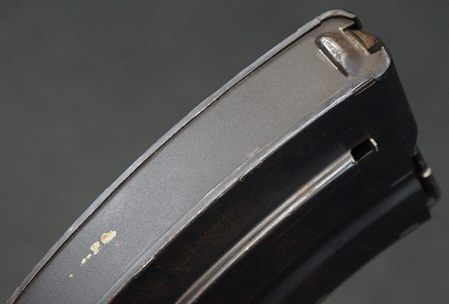 本品は全体に適度な使用感が見受けられ、金属部はやや打ち傷や擦れ、経年による褪色の他、一部に表面錆痕が見受けられますが、目立った欠損等は見受けられず、オリジナルのブルー仕上げも比較的残っています。 木製のハンドガードやグリップ・パネル、バット・ストックについても、やや打ち傷や線傷、一部に僅かな欠けが見受けられるものの、大きな破損は見られず、各部の取り付けについても目立ったがたつきは見られません。 マガジンの着脱やマガジン取付部のダスト・カバーの開閉については問題なく行う事が可能です。 二脚は展開時にやや遊びが見られますが、ロック自体はしっかりと掛かります。 また、トリガーとの連動は有りませんが、セレクター・レバーの切り替えも可能です。 付属のマガジンについてはやや打ち傷や擦れ、若干の表面錆や僅かな変形が見られるものの、大きな凹み等は見られず、概ねしっかりとした状態が保たれています。 尚、マガジン・スプリングは入っています。