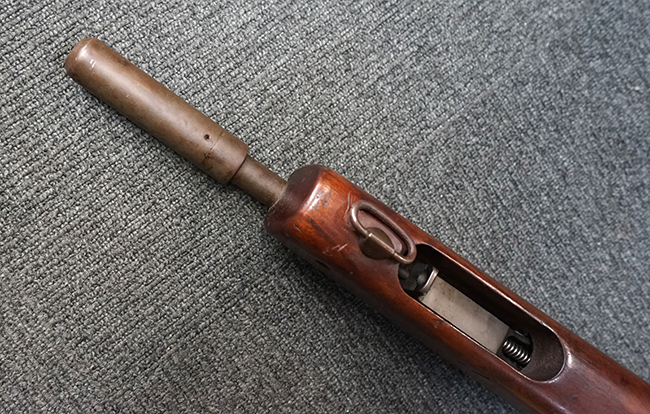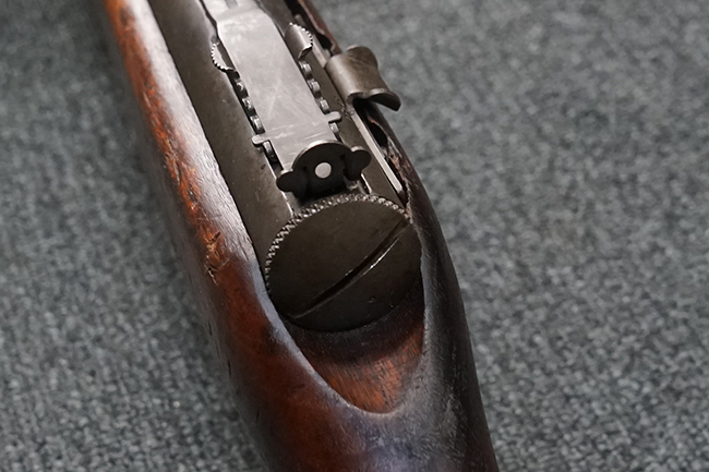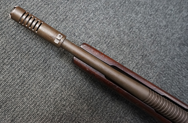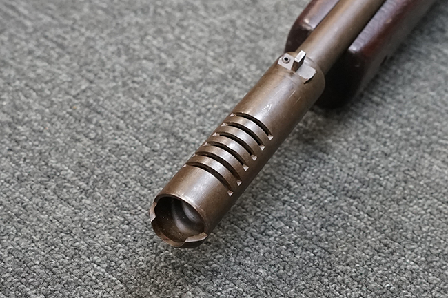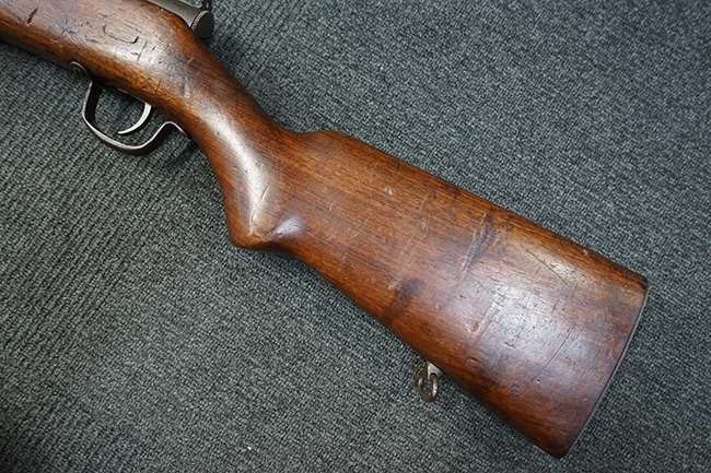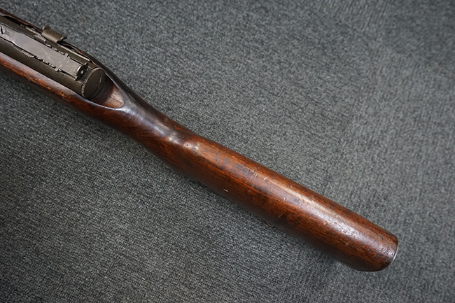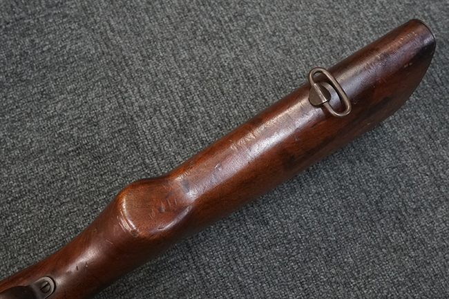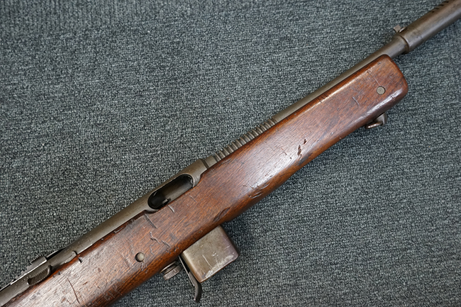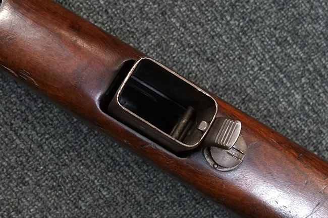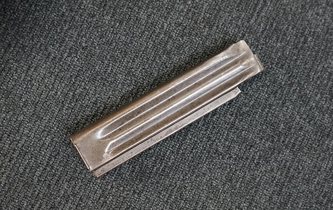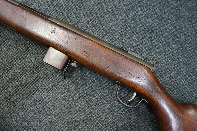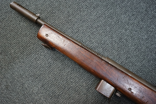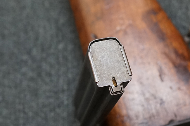 本品は全体に適度な使用感が見受けられ、パーカー仕上げの金属部はやや小傷や擦れ、若干の時代錆が見受けられるものの、目立った欠損等は見受けられず、概ねしっかりとした状態が保たれています。 木製銃床についても全体にやや打ち傷や線傷の他、角の部分に僅かな欠け等は散見されるものの、大きな破損等は見られず、艶のある仕上げも比較的残った良い雰囲気となっています。 唯一、セレクター・レバー部付近にやや欠けが見られるものの、強度的にはしっかりとした状態が保たれています。 傷み易いバット・プレート部についても、角部を中心にやや打ち傷や擦れ、経年による褪色等は見られるものの、大きな変形や目立った腐食等は見受けられず、取り付け自体もガタつきもなくしっかりとしています。 マガジンの着脱やリア・サイトのスライダー調整については問題なく行う事が可能です。 セレクターの切り替えについても可能ですが、トリガーとの連動等は有りません。 付属のマガジンは本体と同じくH&R製で、通常の20連のダブル・カラム・マガジンの両側面に深いリブを入れて12連に装弾数を落とした珍しいタイプとなっています。 マガジンは全体に若干の朽ち込み痕や仕上げが薄くなり金属の地肌が表れている箇所が見受けられるものの、大きな変形等は見られず、概ねしっかりとした状態が保たれています。 マガジンは装着時にやや横方向への遊びが見られますが、概ね許容レベルです。 尚、マガジン・スプリングは入っていません。 ボルトが開いた状態で固定された新加工品です。(TK)