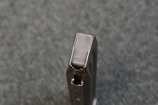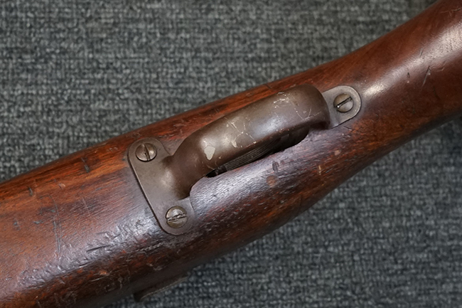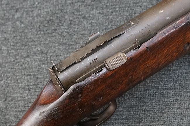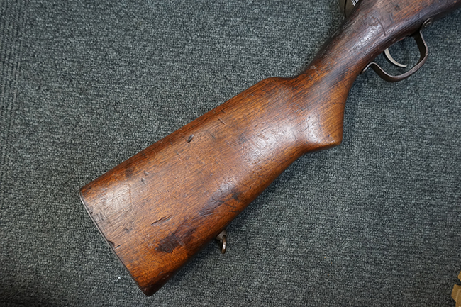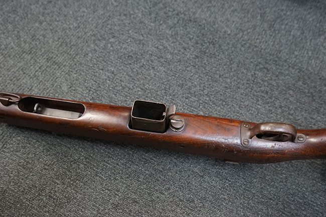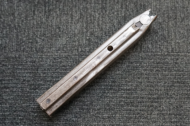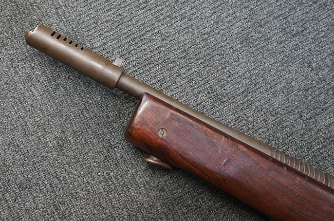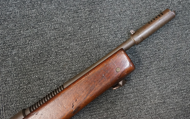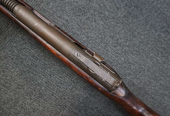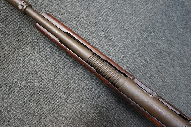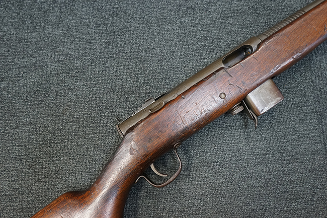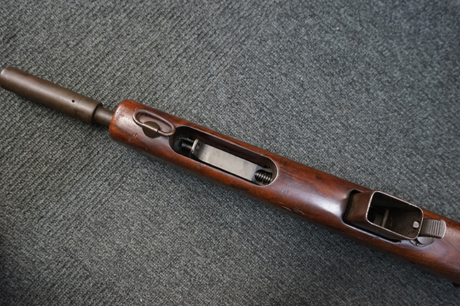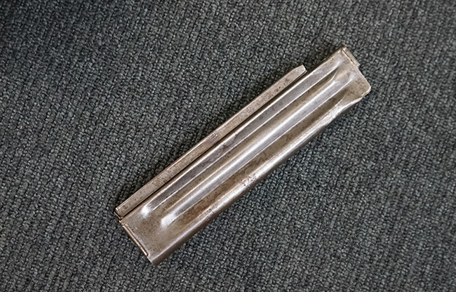 本品は全体に適度な使用感が見受けられ、パーカー仕上げの金属部はやや小傷や擦れ、若干の時代錆が見受けられるものの、目立った欠損等は見受けられず、概ねしっかりとした状態が保たれています。 木製銃床についても全体にやや打ち傷や線傷の他、角の部分に僅かな欠け等は散見されるものの、大きな破損等は見られず、艶のある仕上げも比較的残った良い雰囲気となっています。 唯一、セレクター・レバー部付近にやや欠けが見られるものの、強度的にはしっかりとした状態が保たれています。 傷み易いバット・プレート部についても、角部を中心にやや打ち傷や擦れ、経年による褪色等は見られるものの、大きな変形や目立った腐食等は見受けられず、取り付け自体もガタつきもなくしっかりとしています。 マガジンの着脱やリア・サイトのスライダー調整については問題なく行う事が可能です。 セレクターの切り替えについても可能ですが、トリガーとの連動等は有りません。 付属のマガジンは本体と同じくH&R製で、通常の20連のダブル・カラム・マガジンの両側面に深いリブを入れて12連に装弾数を落とした珍しいタイプとなっています。 マガジンは全体に若干の朽ち込み痕や仕上げが薄くなり金属の地肌が表れている箇所が見受けられるものの、大きな変形等は見られず、概ねしっかりとした状態が保たれています。 マガジンは装着時にやや横方向への遊びが見られますが、概ね許容レベルです。 尚、マガジン・スプリングは入っていません。 ボルトが開いた状態で固定された新加工品です。(TK)