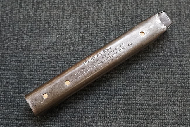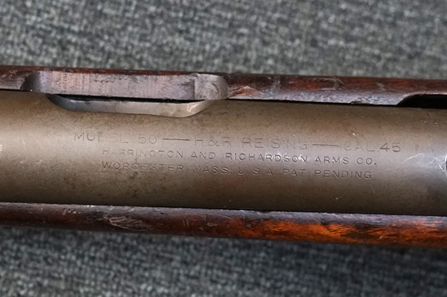本品のレシーバー上面には「MODEL 50 - H&R REISING - CAL.45 HARRINGTON AND RICHARDSON ARMS CO. WORCESTER, MASS, U.S.A. PAT. PENDING」のモデル名及びアドレス刻印が打刻されています。 レシーバー右側面にはL2596のシリアルNo.が入っています。