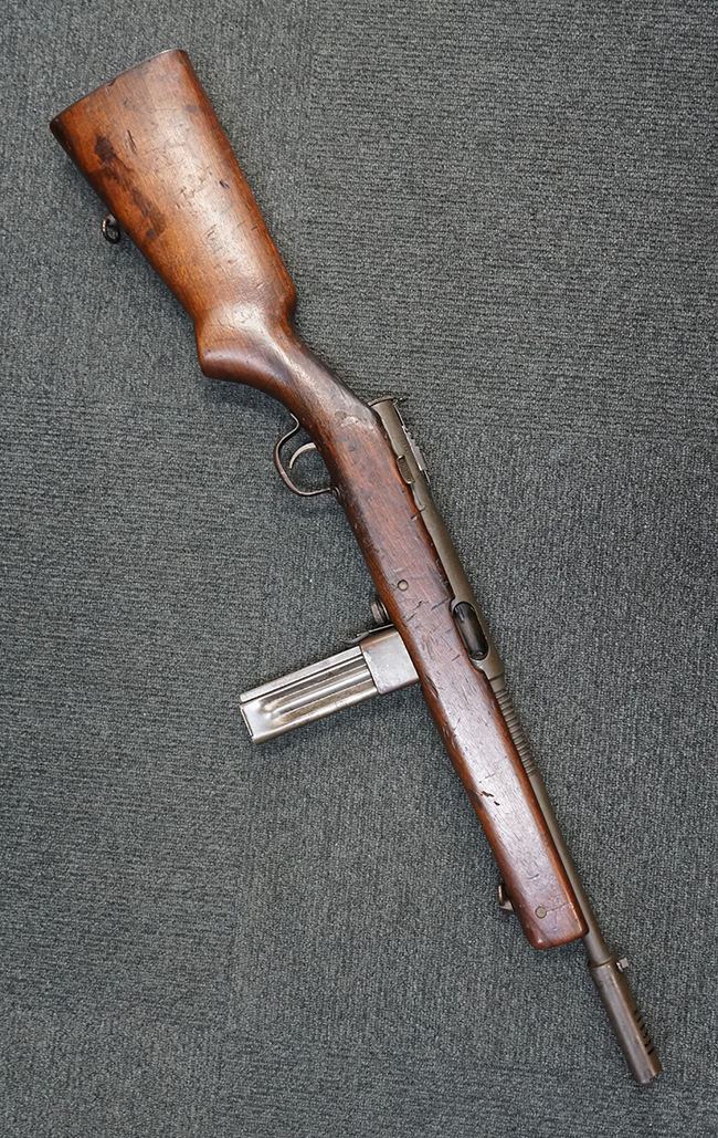 第二次世界大戦中、米海兵隊ではトンプソンM1A1短機関銃の需要に供給が追いつかなくなり、その供給不足を解消するため陸軍とは別ルートでの装備調達を画策し、安価で高性能な新型短機関銃の開発を進めていました。 ハーリントン&リチャードソン社は1940年に試作銃の開発に成功し、翌年の選考テストにおいて.45ACP弾を使用する短機関銃としては軽量な本体と高い命中率が評価され採用となりました。