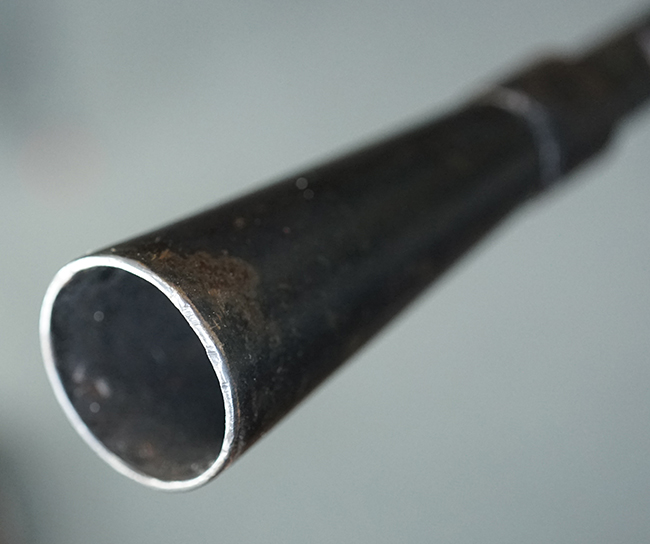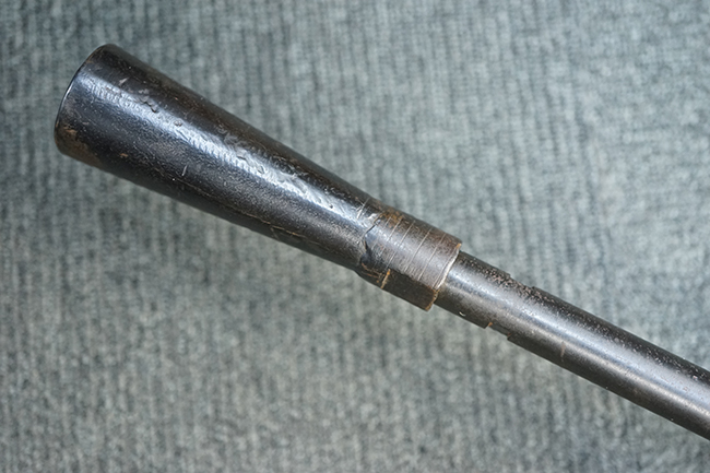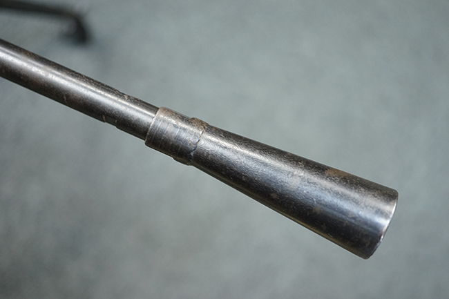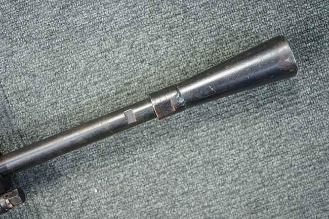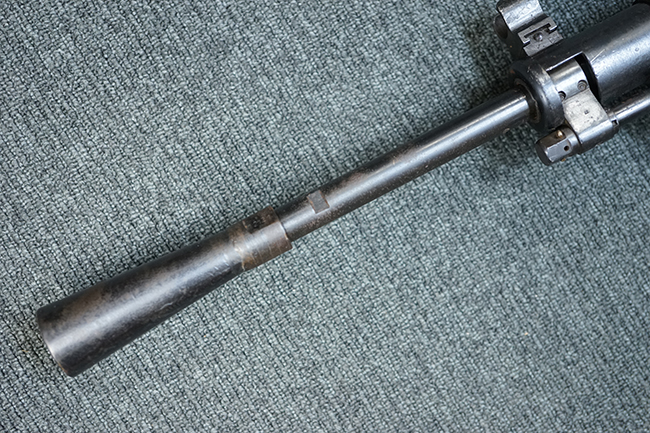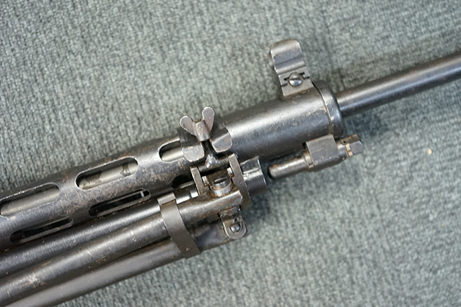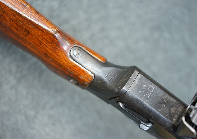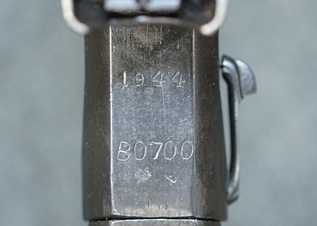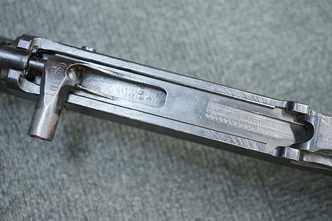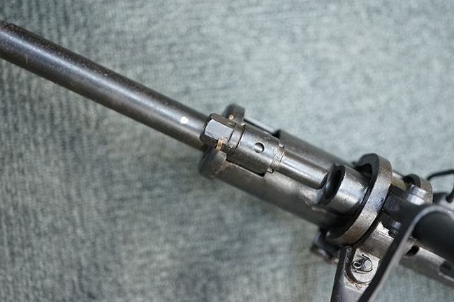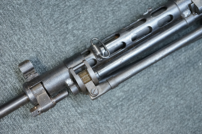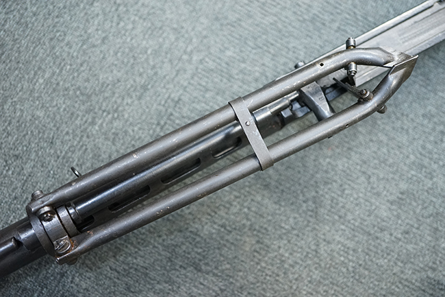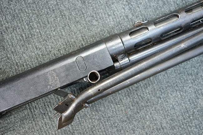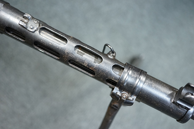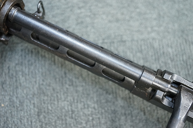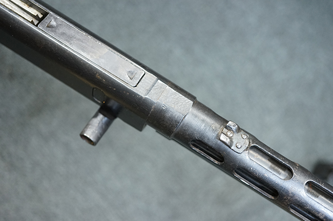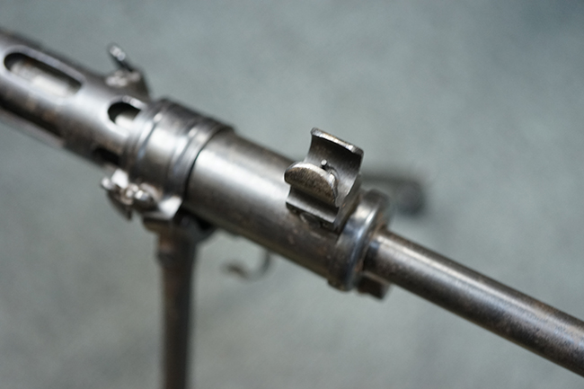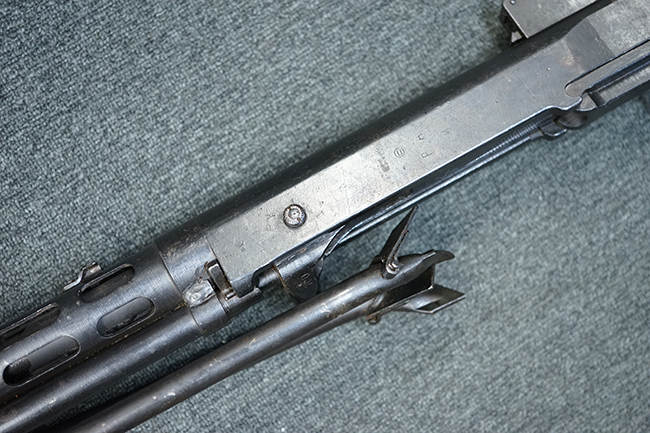 本品のアッパー・レシーバー後部上面にはシリアルNo.700の他、コブロフ第2工場を示す砲弾に矢印の刻印や製造年を示す「1944」の刻印が入っています。 シリアルNo.は、アッパー/ロア・レシーバー、コッキング・ハンドル基部、バット・ストックでマッチしています。 本品はDP軽機関銃としては後期の生産品で、冷却フィンの省略された銃身が付属しており、バレル・ジャケットに設けられた冷却穴の数が減らされています。 尚、バット・ストックは合板製となっています。