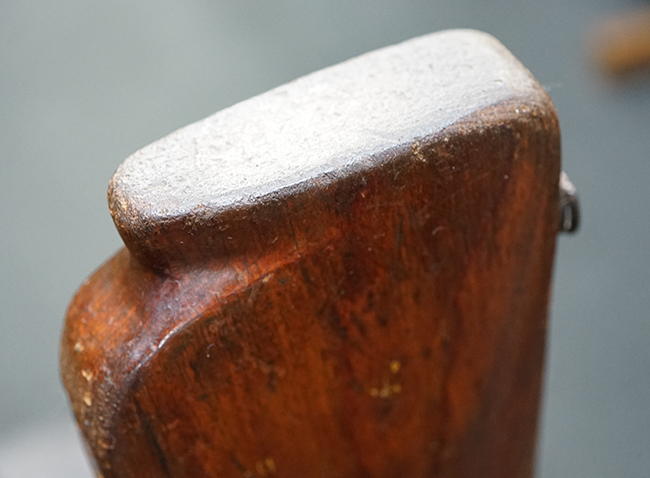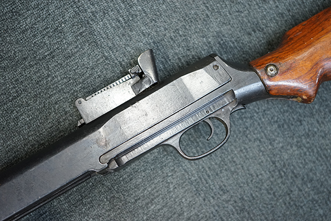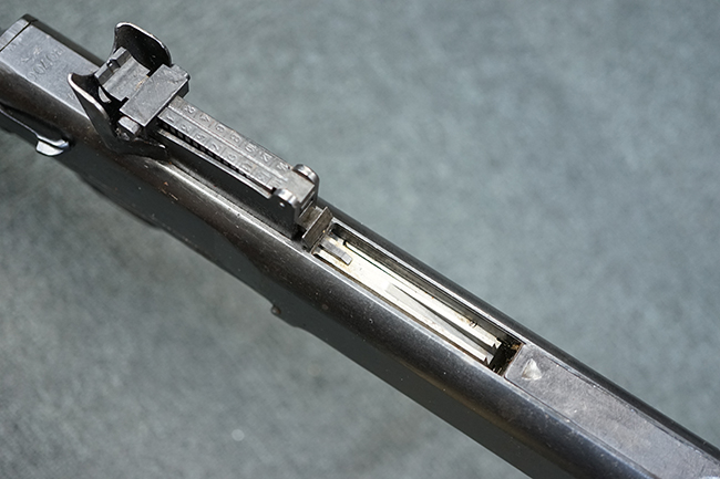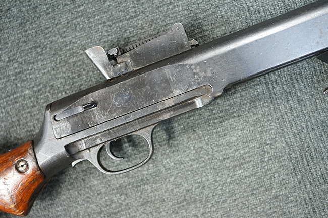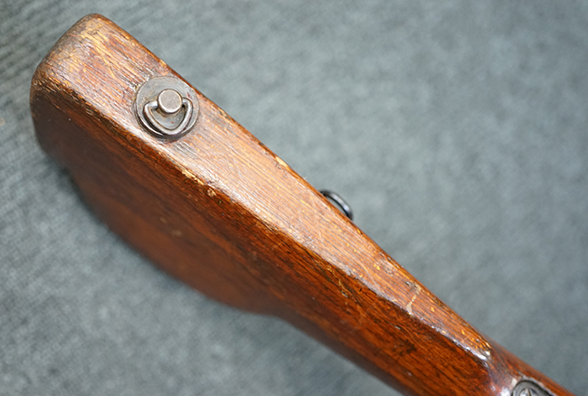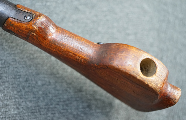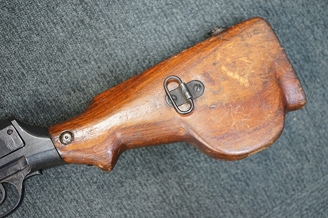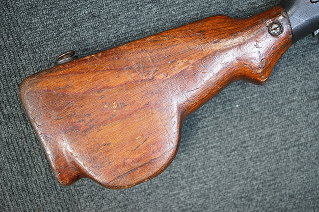 本品は全体にやや使用感が見受けられ、金属部には小傷や擦れ、若干の表面錆が散見されるものの、表面仕上は大部分に残っています。 木製バット・ストックについても、やや打ち傷や線傷は見られますが、光沢の仕上げがしっかりと残っており、目立った破損等は見られません。 傷み易いバット・プレート部分は僅かな打ち傷や角の部分の若干の摩耗が見受けられる程度で、バット・ストック後方上部のオイラー・ブラシについても付属しています。 付属のパン・マガジンについては、概ね本体と同様の状態で、やや経年による褪色や表面錆痕が見られますが、大きな変形は見られません。尚、マガジン・スプリングは入っていません。 二脚の展開やパン・マガジンの着脱、リア・サイトの調整操作、給弾孔ダスト・カバーの開閉等については問題なく行う事が可能です。