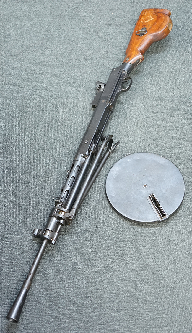作動方式はガス圧利用式で、ロッキング・フラップによる閉鎖機構を備えています。 本銃の使用弾薬である7,62mm×54Rはリムド・カートリッジのため、マガジンは強いアーチを描くバナナ・マガジン形状となりますが、その延長として生まれたと言われる円盤型の47連パン・マガジンが本銃の最大の特徴となっています。 また、銃身から機関部にかけての細身の外観も独特で、銃身の取り外しが難しい初期型と、機関部側面に銃身ロックを設け銃身交換を容易にした後期型があります。