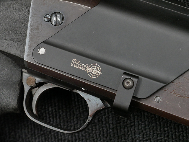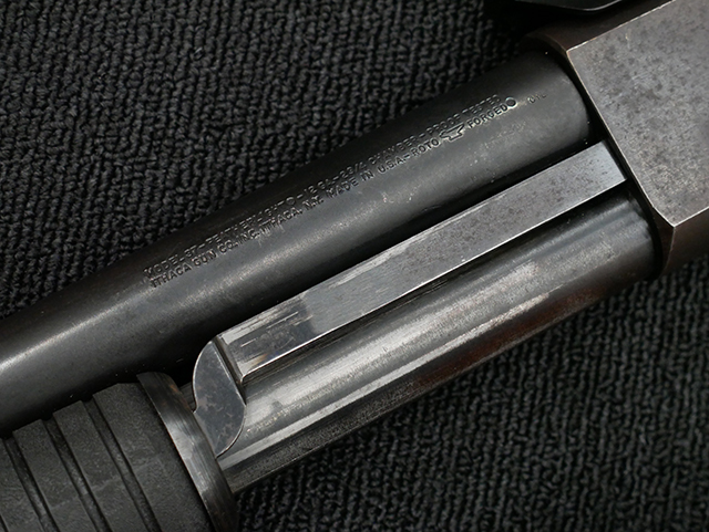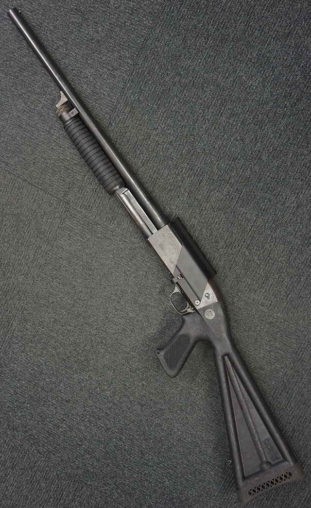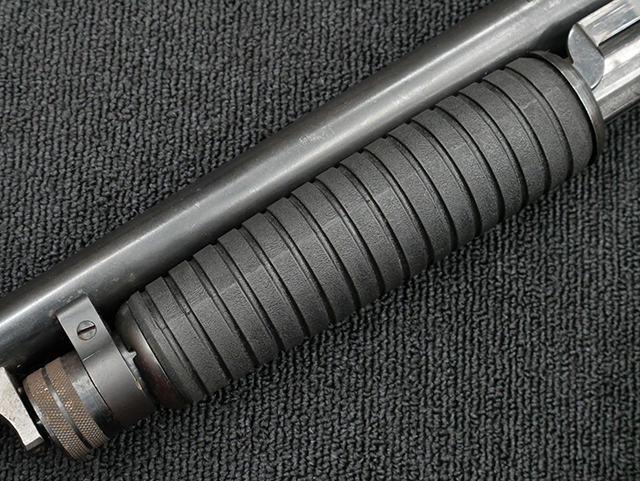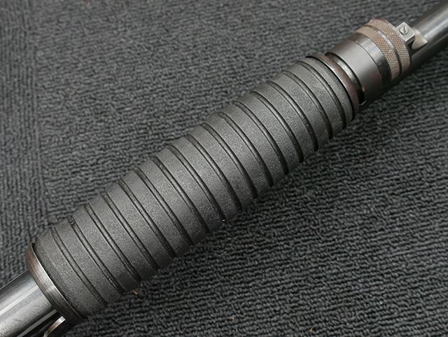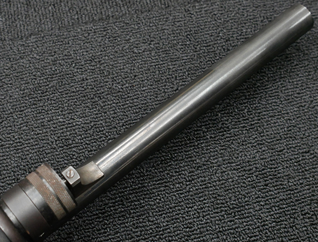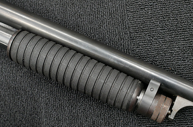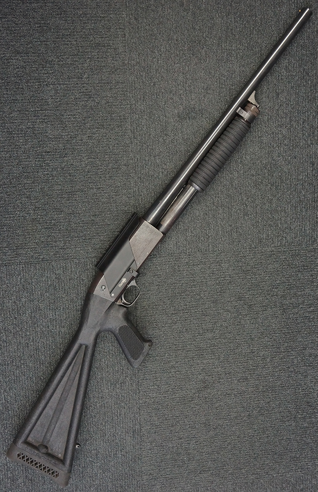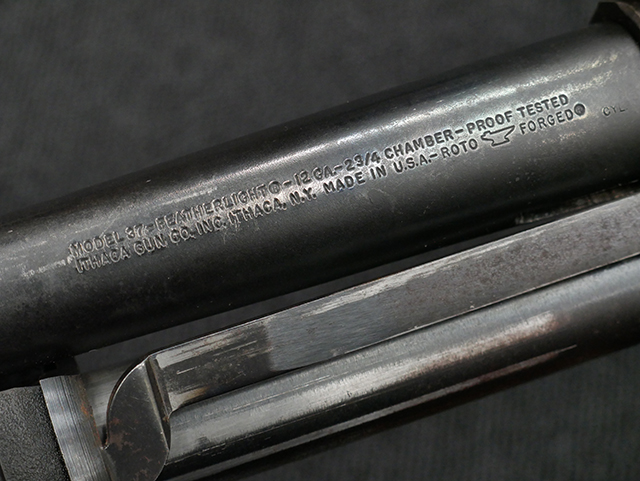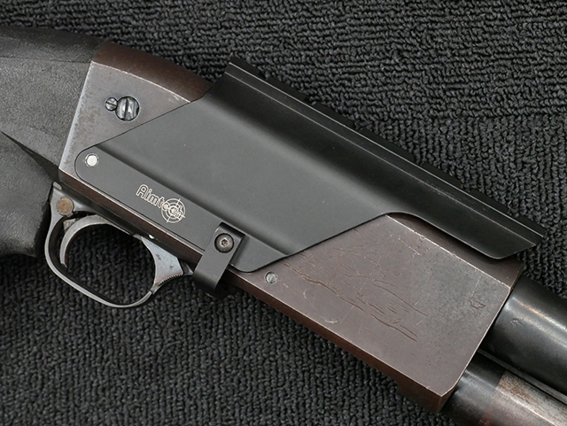 本品は12GAモデルのイサカ M37 ショットガンで、銃身長は約20インチとなっております。 銃身にはモデル名や口径表示の他、「ITHACA GUN CO. INC. ITHACA. N.Y. MADE IN U.S.A.」のメーカー刻印が入っています。 本品には樹脂製のフォア・エンドやCHOATE TOOL CORP製のピストル・グリップ一体型のストックの他、Aimtech製のマウントが取り付けられています。