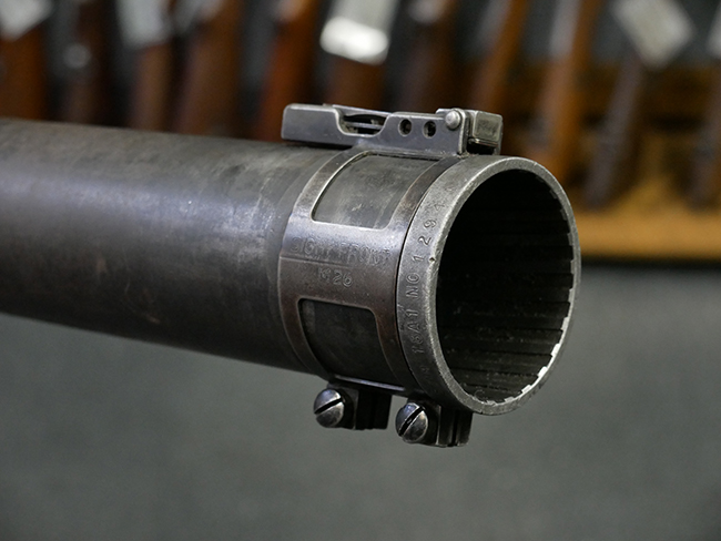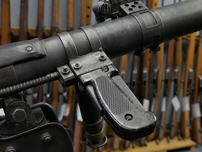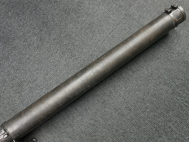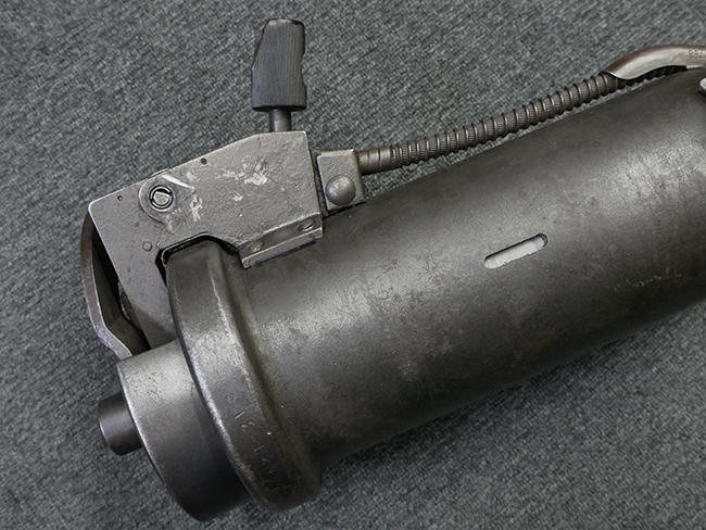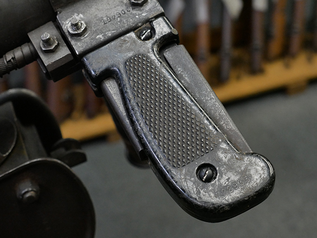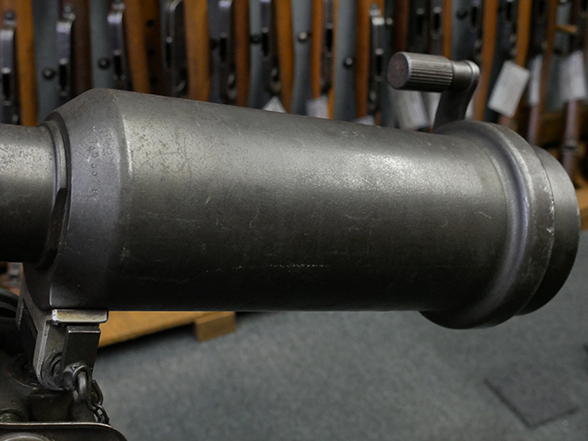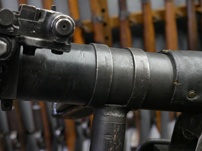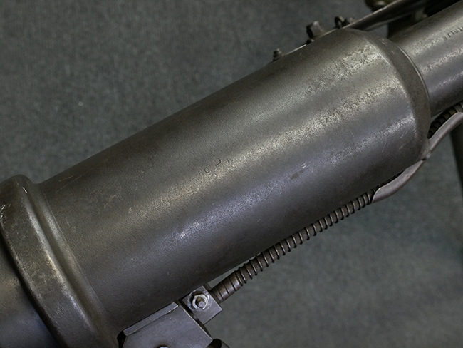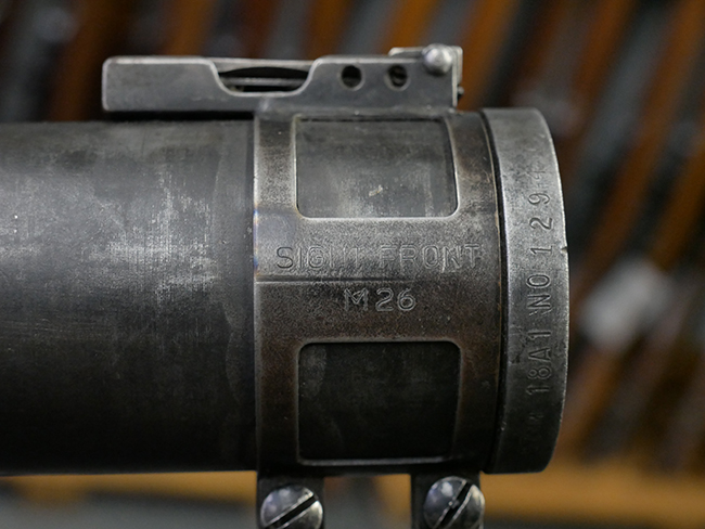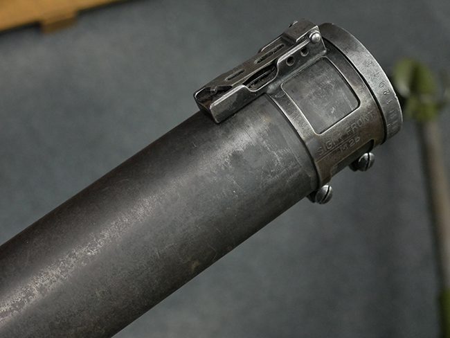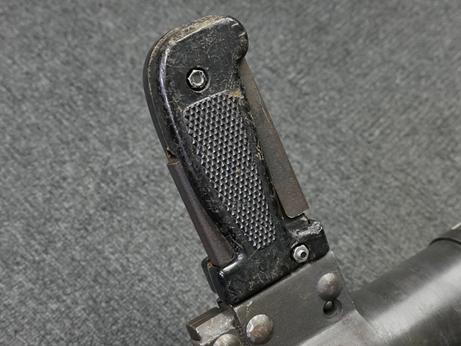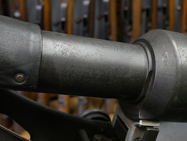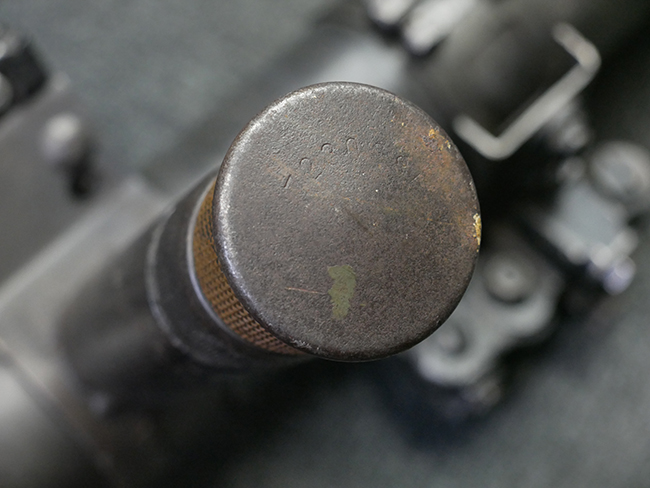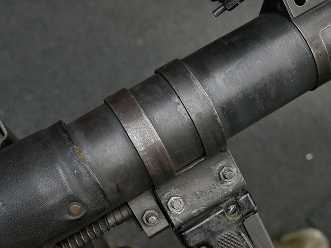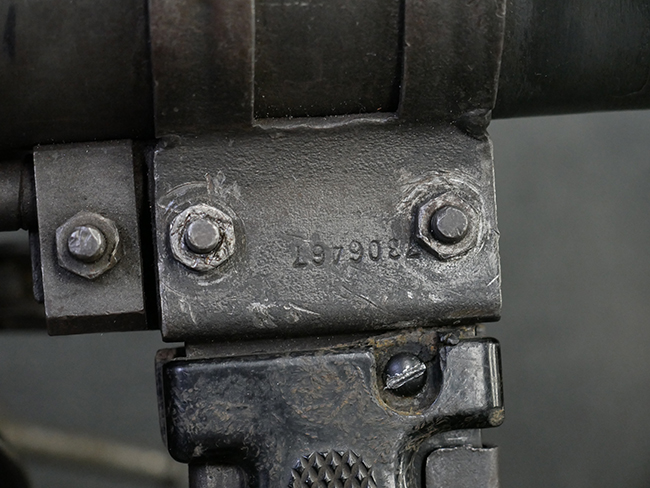 本品は軍からの放出時に一度解体され、その後第三国で無可動に加工された品であり、各部にその痕跡が見受けられます。 本品は全体にやや使用感が見られ、金属部は全体に経年による褪色や表面錆痕が見受けられ、一部に仕上げが落ちて金属の地肌が表れています。 グリップ・フレームについても一度切断され、現状ダミーのグリップ・フレームが溶接により取り付けられており、その上にオリジナルのグリップ・パネルが取り付けられています。 これに伴い、トリガー機構は除去されています。 革製のチーク・パッドについてはやや傷や擦れ、一部に破れが見られますが、全体としては比較的しっかりとした状態が保たれています。 前後サイトの起倒や一脚の伸縮については問題なく行う事が可能です。