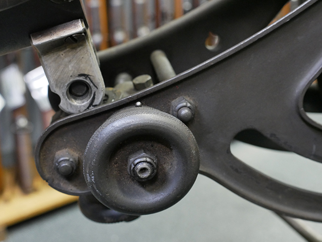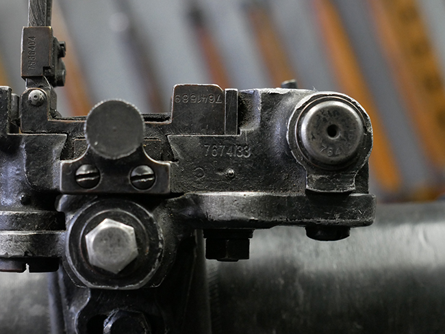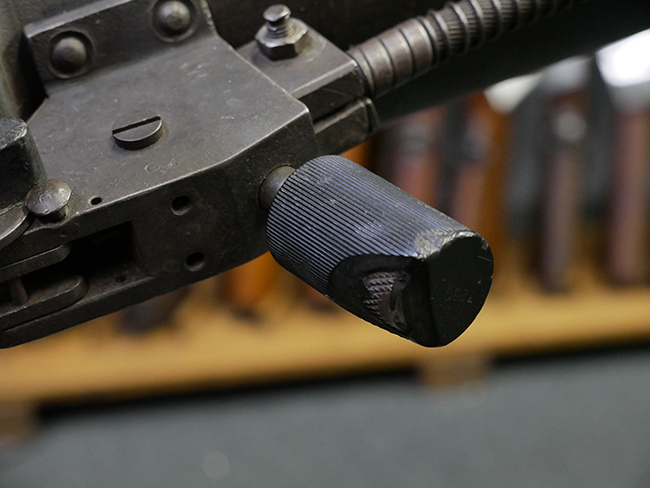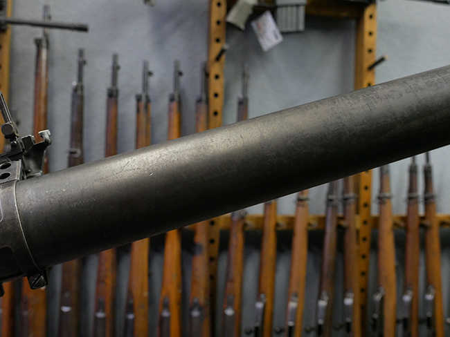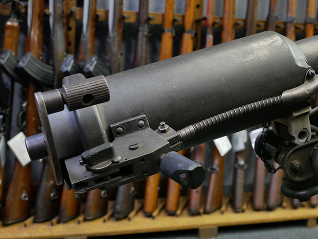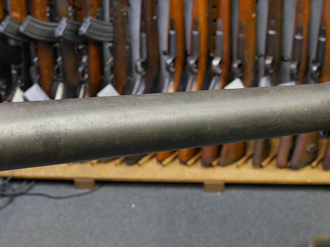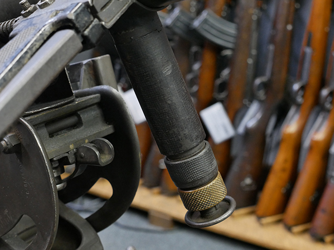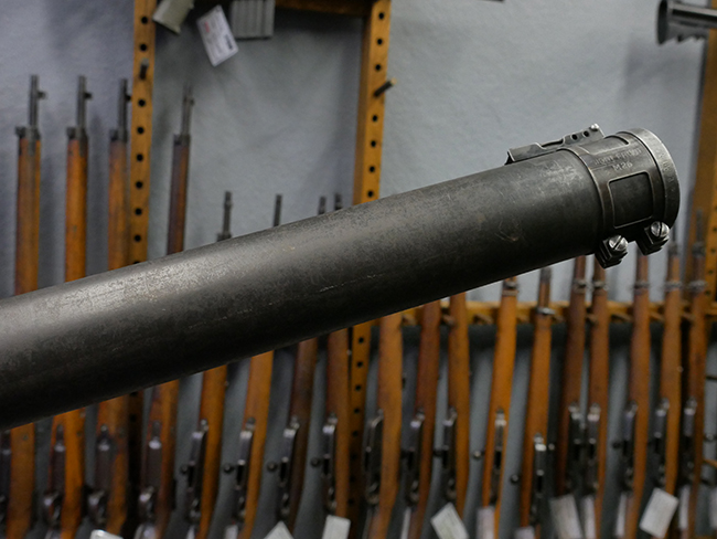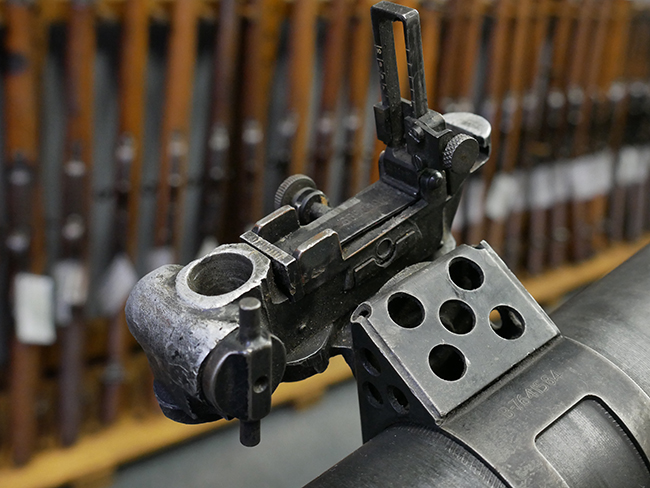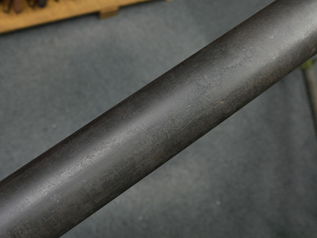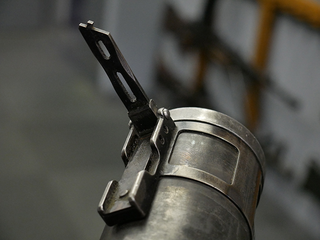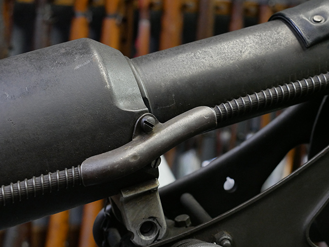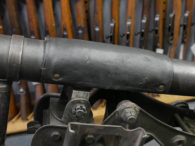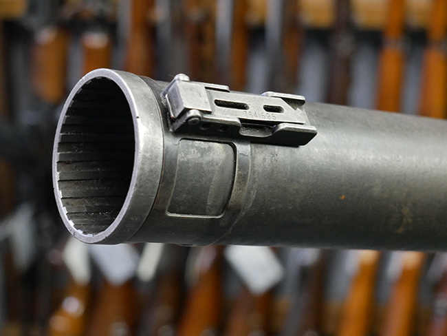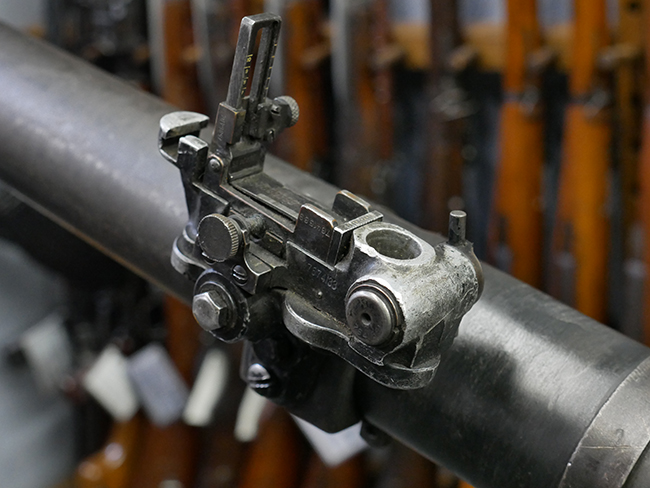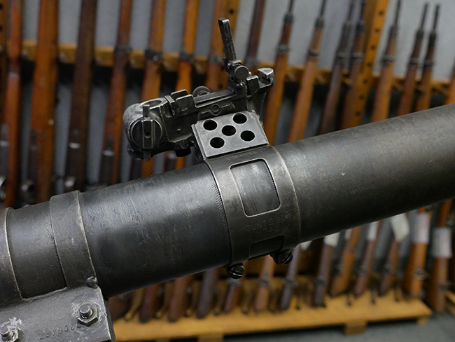 本品は軍からの放出時に一度解体され、その後第三国で無可動に加工された品であり、各部にその痕跡が見受けられます。 本品は全体にやや使用感が見られ、金属部は全体に経年による褪色や表面錆痕が見受けられ、一部に仕上げが落ちて金属の地肌が表れています。 グリップ・フレームについても一度切断され、現状ダミーのグリップ・フレームが溶接により取り付けられており、その上にオリジナルのグリップ・パネルが取り付けられています。 これに伴い、トリガー機構は除去されています。 革製のチーク・パッドについてはやや傷や擦れ、一部に破れが見られますが、全体としては比較的しっかりとした状態が保たれています。 前後サイトの起倒や一脚の伸縮については問題なく行う事が可能です。