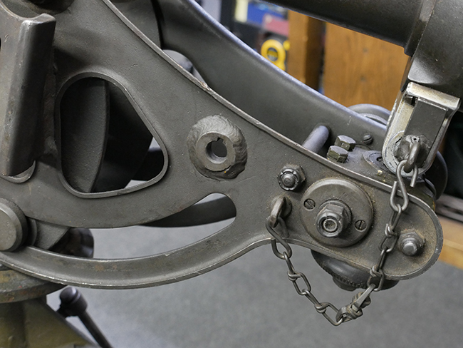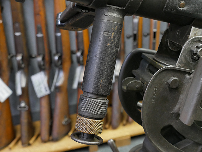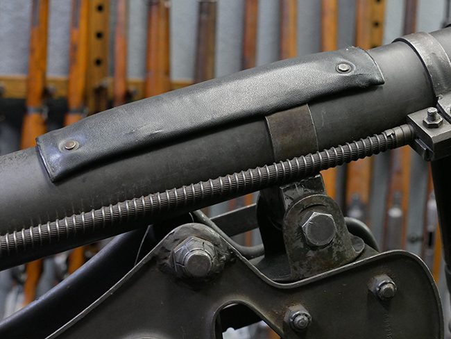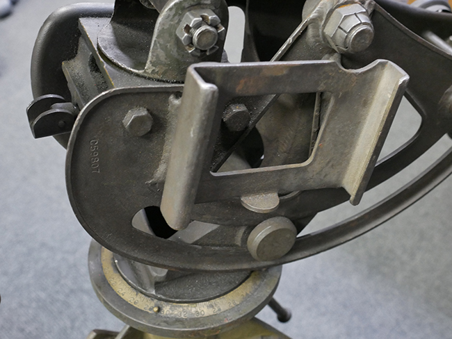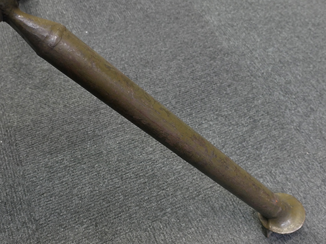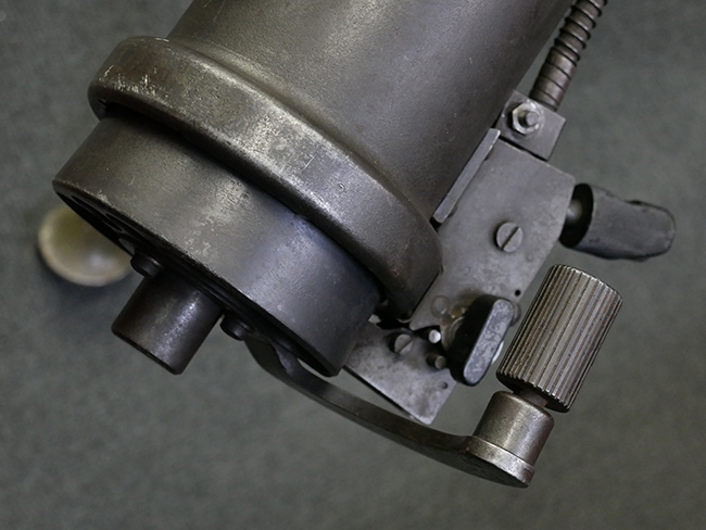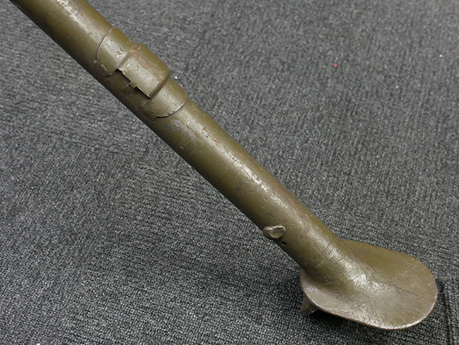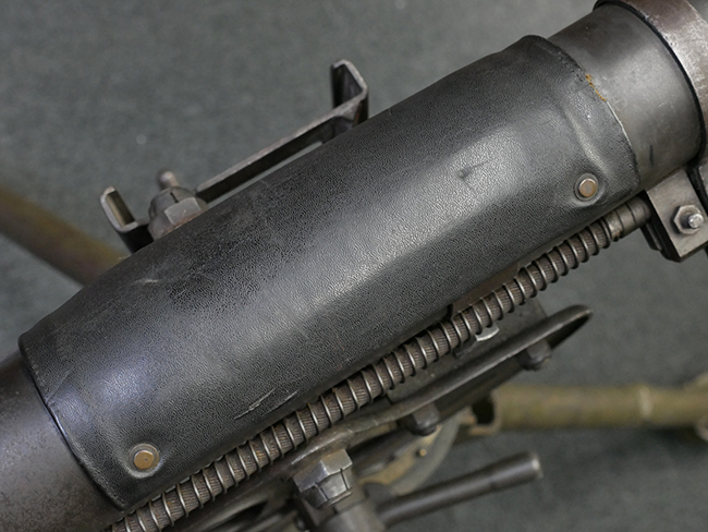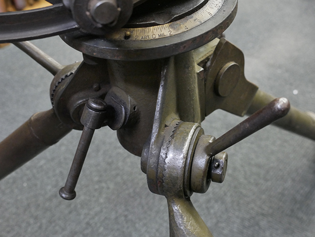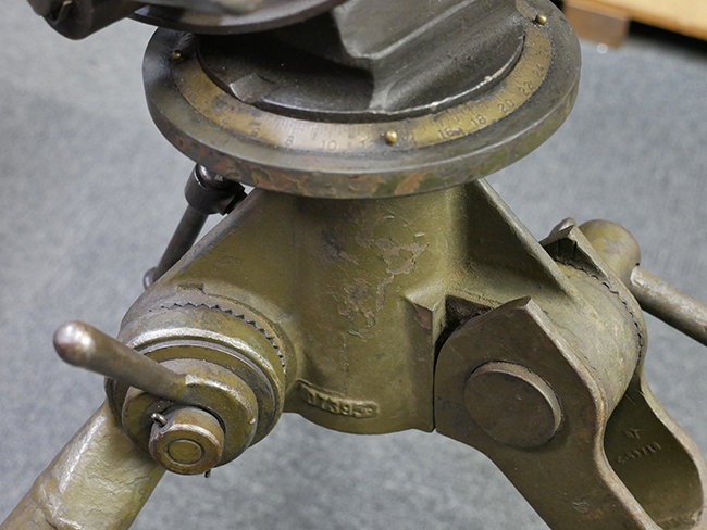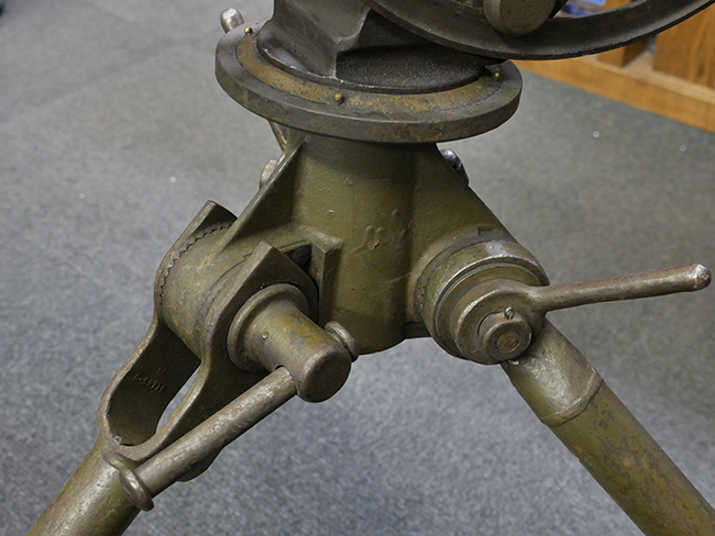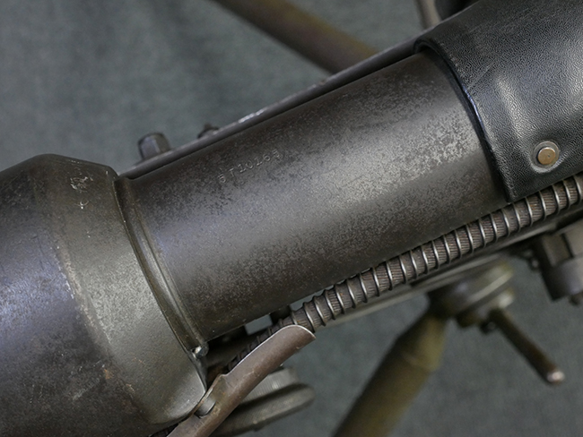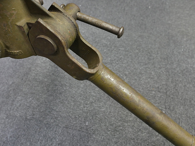 ブローニングM1917水冷式重機関銃と共用のM1917A1三脚が付属致します。 クレイドル基部には「U.S. M1917-A1」の刻印及びフレーミング・ボムの刻印が確認出来ます。 三脚については全体に適度な使用感が見受けられ、やや表面錆痕や仕上げの剥落が見受けられるものの、各部の調整等については問題なく行う事が可能です。 尚、三脚後脚の革製ストラップは欠品しています。 (KK)