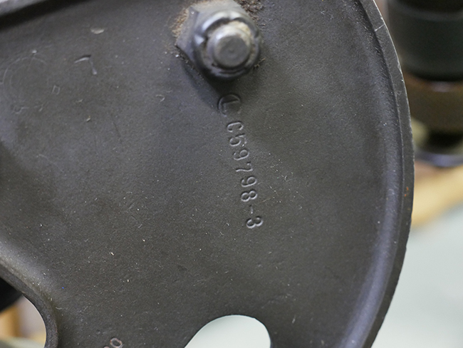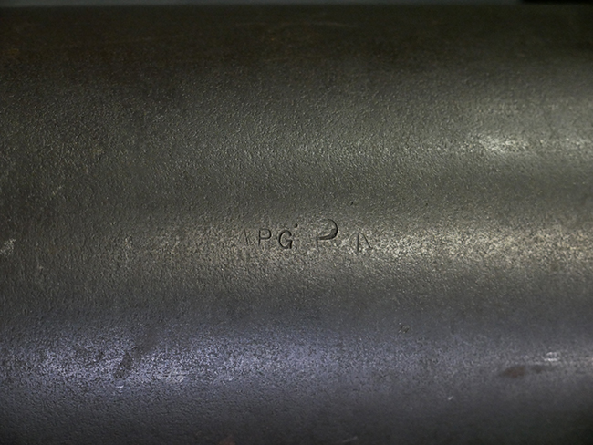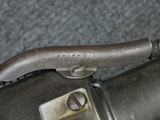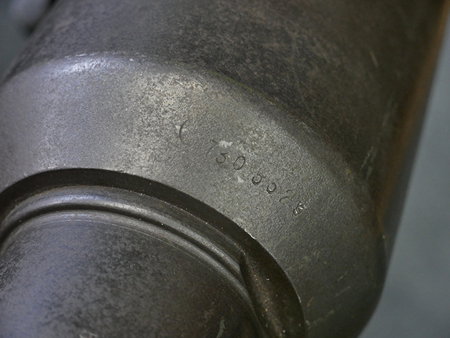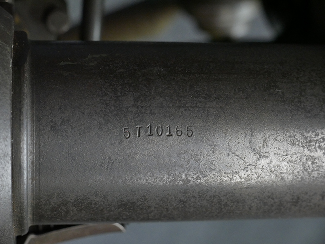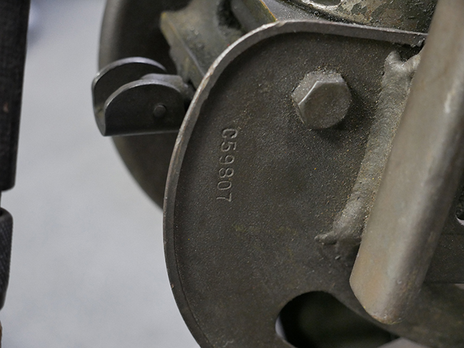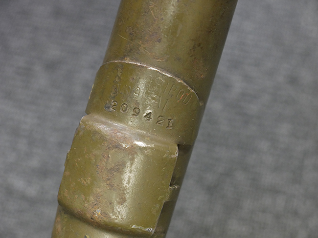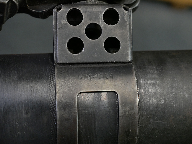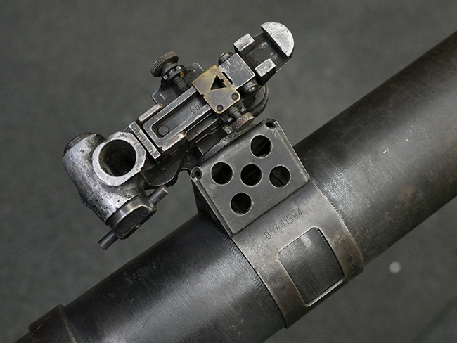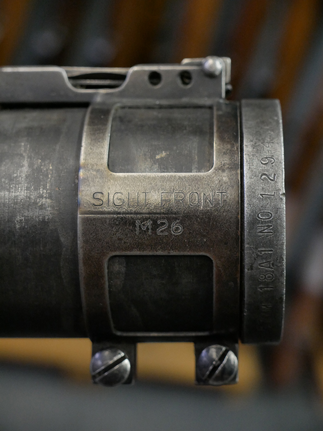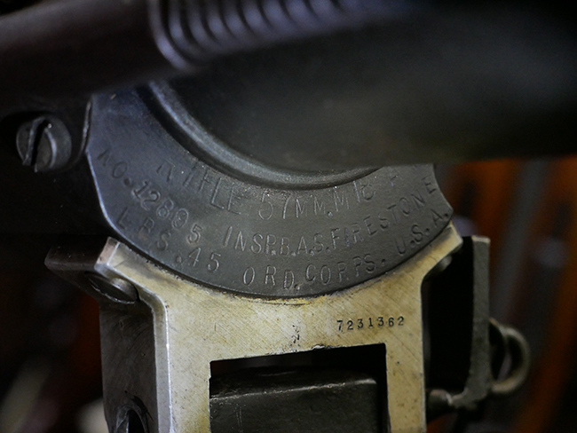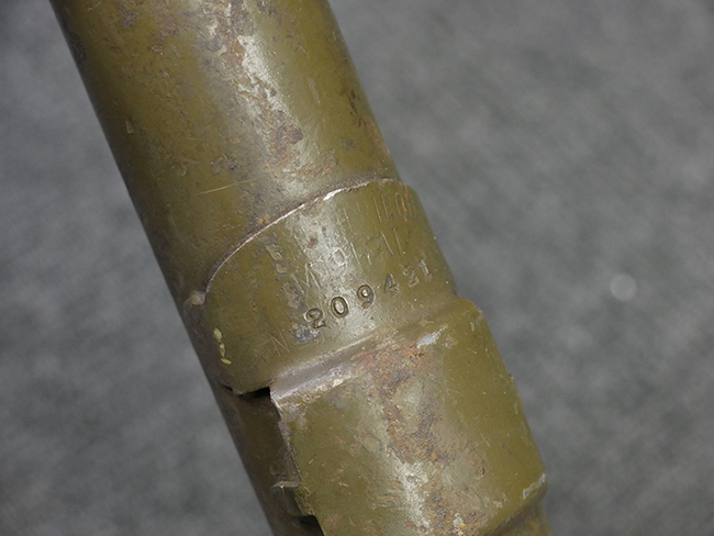 本品の砲身後部の薬室部前面には「RIFLE 57MM. M18 A1」のモデル名及び「INSP. B.A.S. FIRESTONE ORD. CORPS. U.S.A.」の検査刻印、シリアルNo.12895が入っています。 また、砲口部には「RIFLE 57MM 18A1」のモデル名及び12941のシリアルNo.が確認出来ます。 その他、フロント・サイトのリング部分に「SIGHT FRONT M26」の刻印が見られる他、各部品にパーツ番号が入っています。