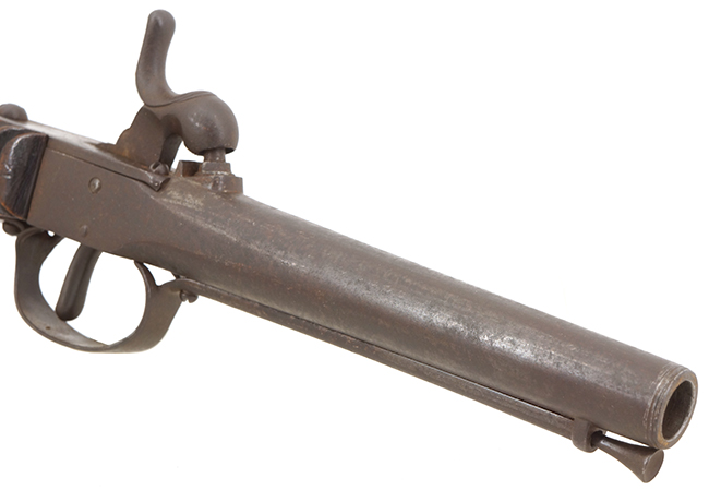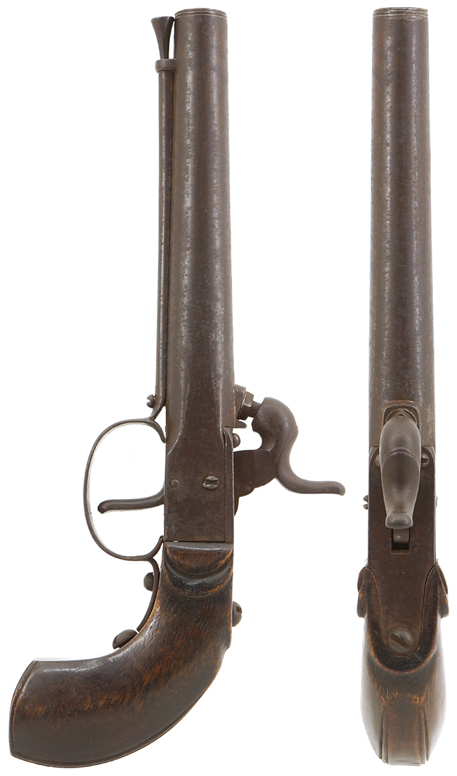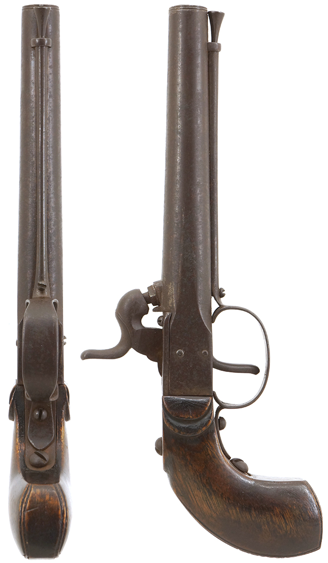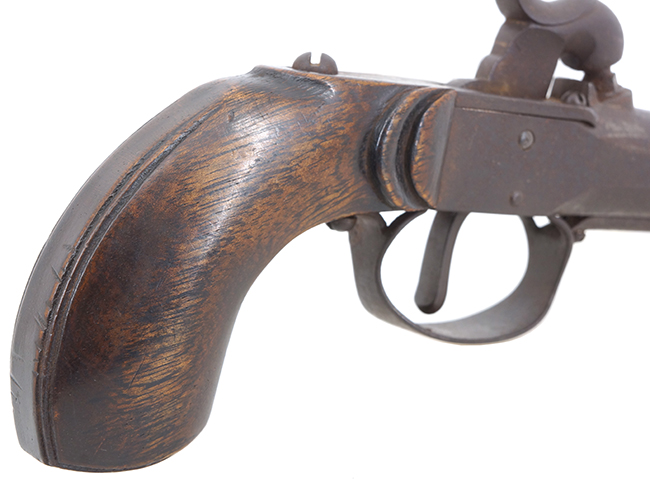 幕末に雷管式小銃が欧米から輸入されるようになってから、国内でもゲベール銃などの模作が盛んに行われました。 和製の小銃はオリジナルと大きな違いはありませんが、短銃は日本独自の形状になりました。 本品は短銃と呼ぶより火縄銃からの流れを汲む短筒と呼ぶ方が相応しいような独特の形状をした品です。 携帯する時は帯に差した十手のような使い勝手ではなかったでしょうか。 本体の左側面に帯に差す際の突起が銃身と平行に付いています。 西洋でもこのような突起 (ベルト・フック) が付いた品は存在しますが、和製のドントル銃ほど、必ず備えられるものではありませんでした。 また、銃口下部にはさく杖 (ラム・ロッド) を固定する為のスイング式の金具 (ラム・ロッド・スイベル) を備え、銃身下部にさく杖の取り付けが可能となっている品も多く見られます。 このような短銃は当時「ドントル銃」と呼ばれました。