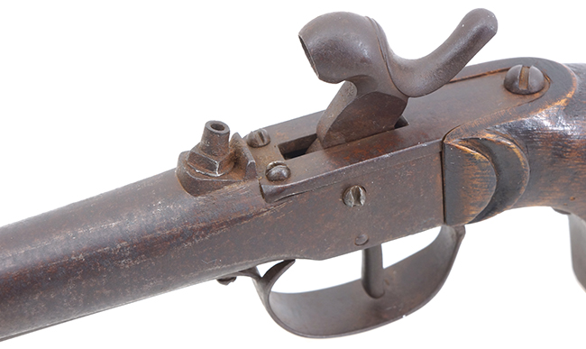 ドントル銃には銃身と本体が真鍮により製作された品が多く見られますが、本品は真鍮製に比べて珍しい鉄製銃身及び機関部を備えた品です。 銃身下部にはさく杖の取り付けが可能となっており、用心金前方と一体となった銃身下部の筒状の金具によってさく杖を保持する構造となっています。 銃身は後方に向かって緩やかにテーパーがかかったラウンド・バレルで、銃身内にライフリングのない滑腔銃身となっています。 尚、ドントル銃では銃口部に火縄銃のような柑子が付いた品が多く見られますが、銃口部には柑子は設けられていません。