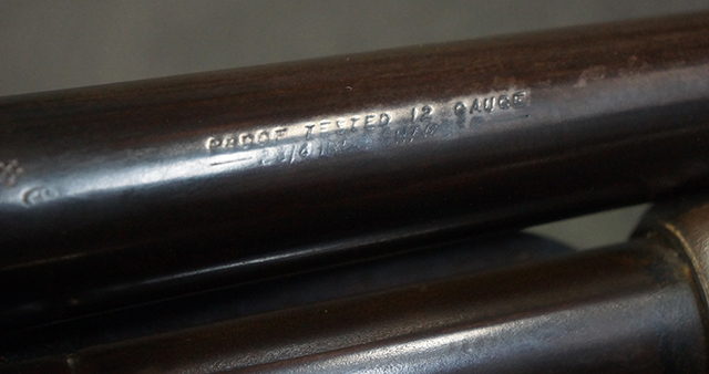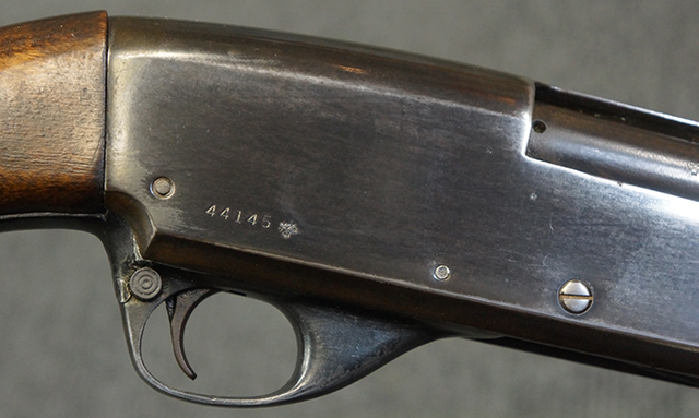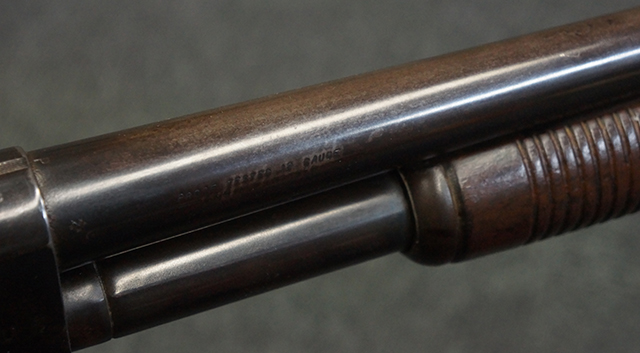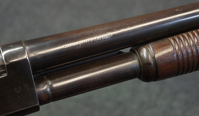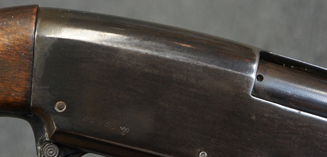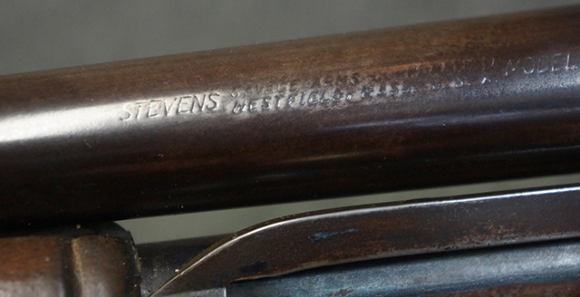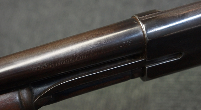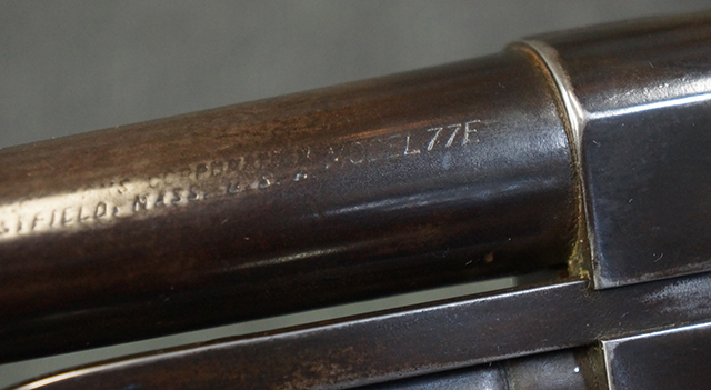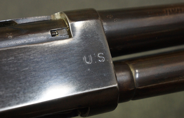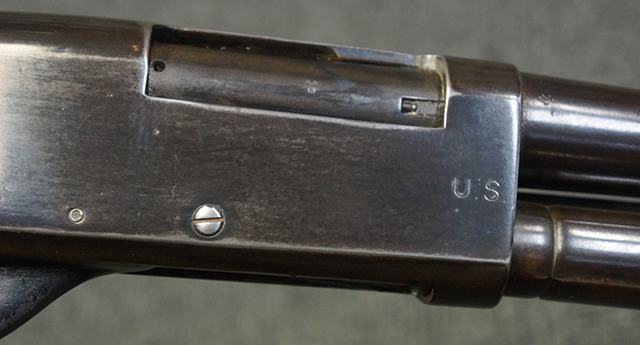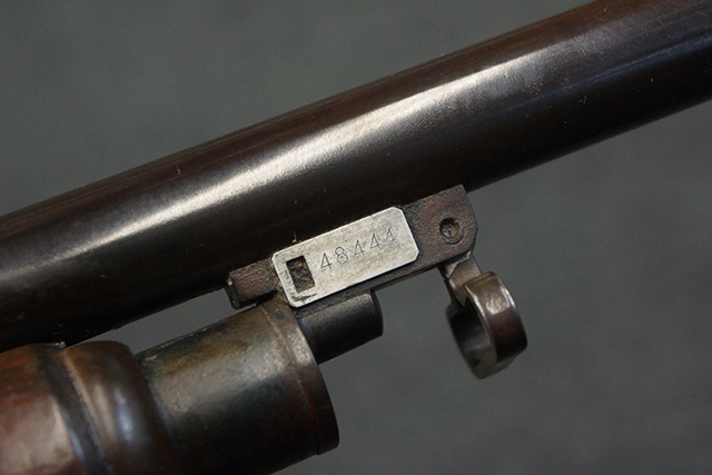 本品の銃身基部左側面にはやや薄くなっていますが、スティーブンスのメーカー・アドレス刻印に加えて、「MODEL 77E」のモデル名刻印が入っています。 また、銃身右側面にはこちらも薄くなっていますが、「PROOF TESTED 12 GAUGE 2 3/4 INCH CHAMBER」の刻印が確認出来ます。 機関部右側面前部には「U.S.」の刻印が確認出来ます。 機関部右側面には44145のシリアルNo.が打刻されており、マガジン・チューブ前部と銃身の接続部右側面には48444の番号が打刻されたプレートが取り付けられています。