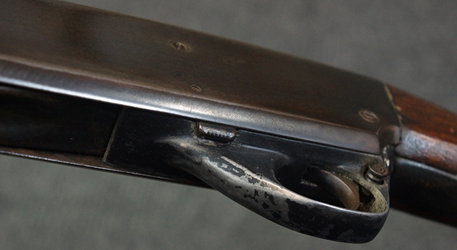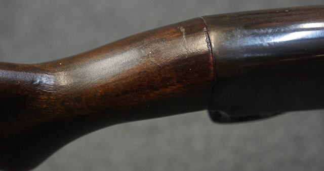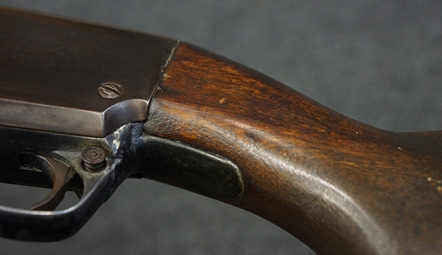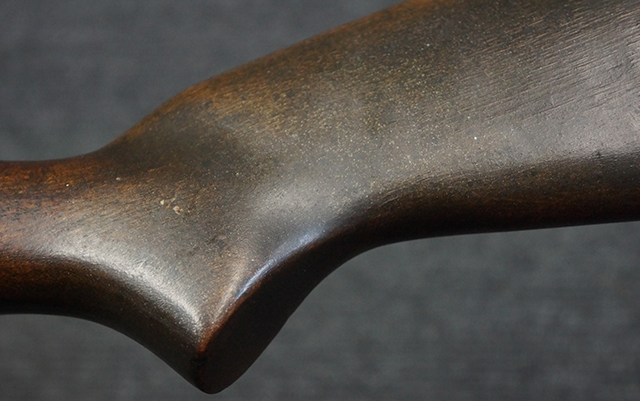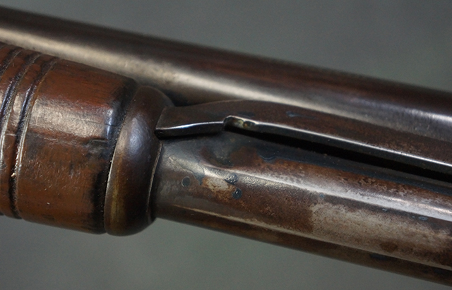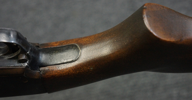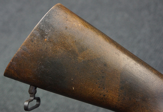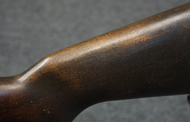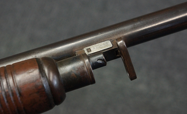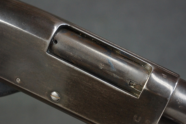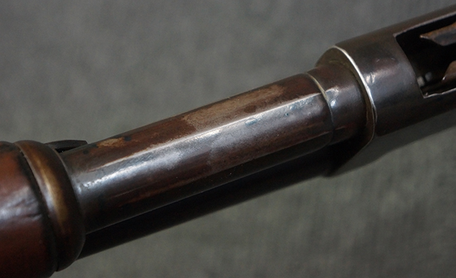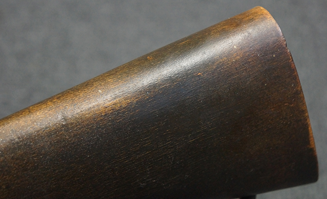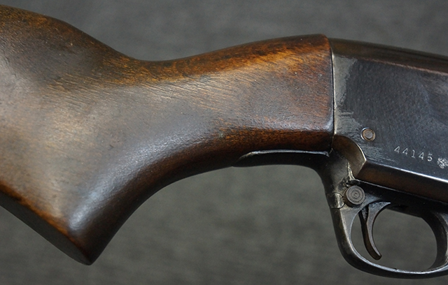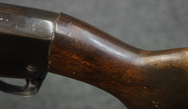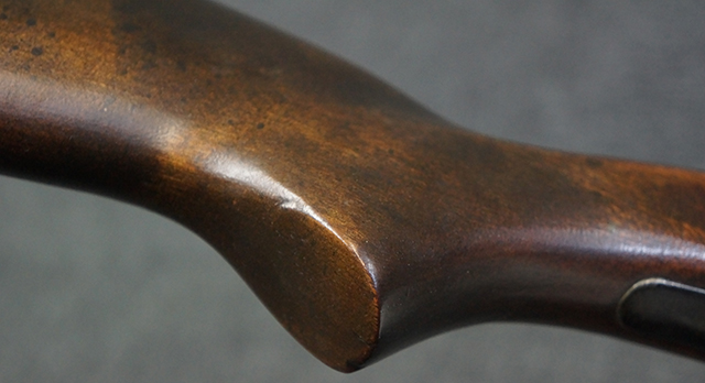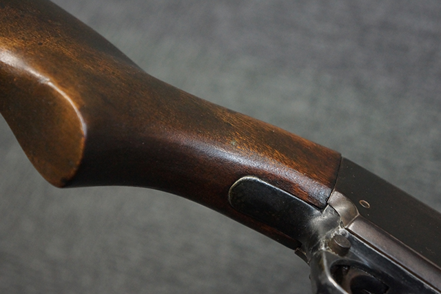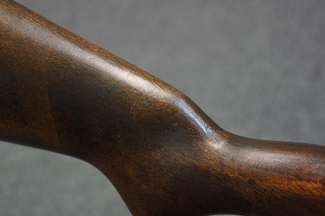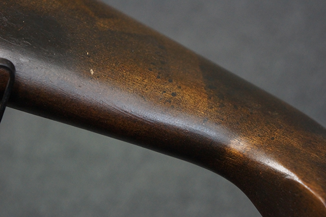 本品の機関部や銃身といった金属部は全体に仕上げ直しが施されており、打ち傷や擦れ、経年による褪色の他、一部に朽ち込み痕が見受けられます。 また、マガジン・チューブに一部凹みが見られる他、トリガー・ガード後部に補修痕が見受けられます。 木製のフォア・エンドやバット・ストックについても、打ち傷や線傷が見受けられますが、現状大きな割れ等は見受けられず、概ねしっかりとした強度が保たれており、各部の取り付けにも目立ったがたつきなどは見られません。 尚、フロント・サイト及びバット・プレートは欠品しています。 フォア・エンドは無可動加工により固定されています。 セーフティ・ボタンの切り替えについては問題なく、安全位置でトリガーがロックされます。