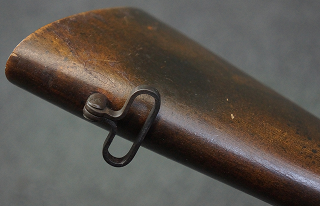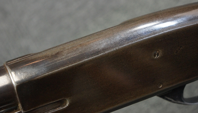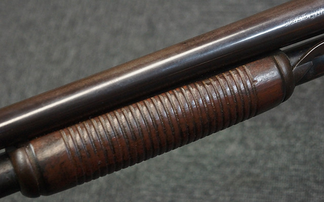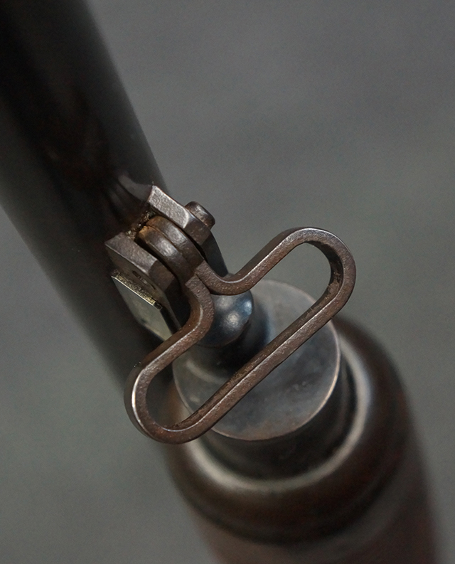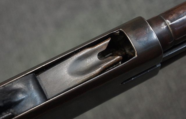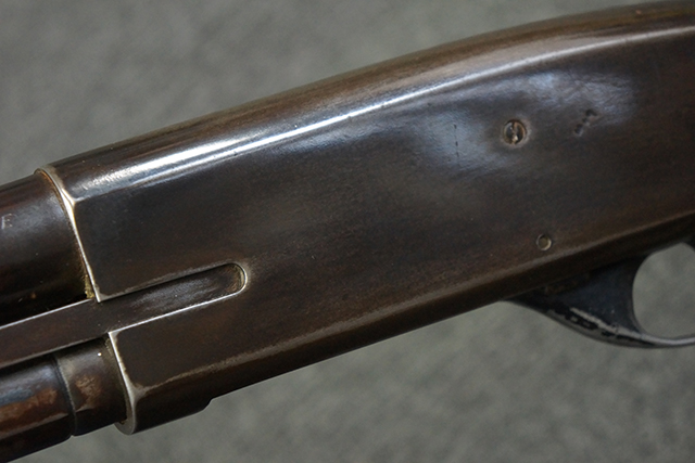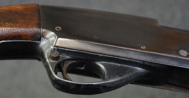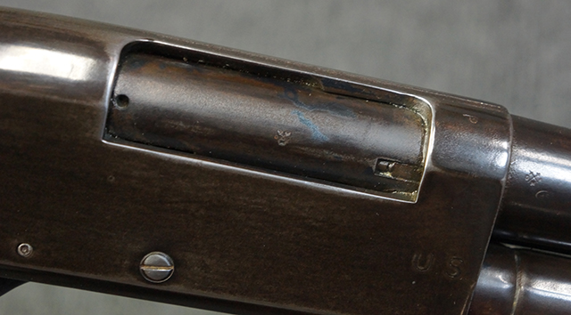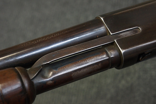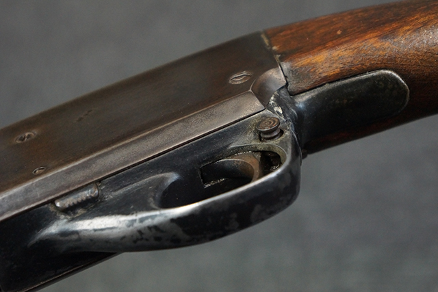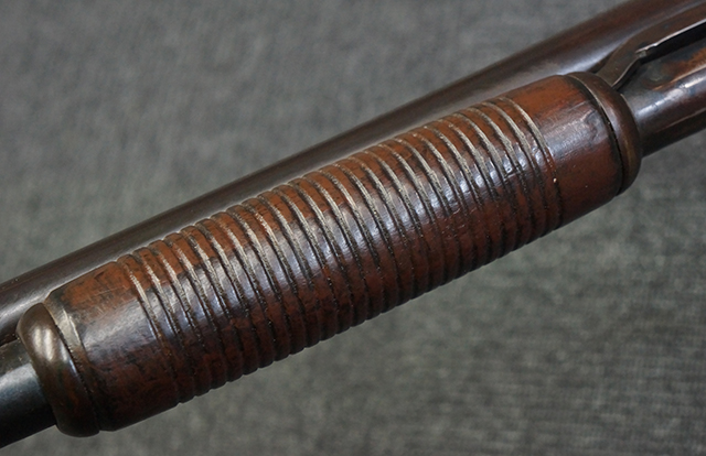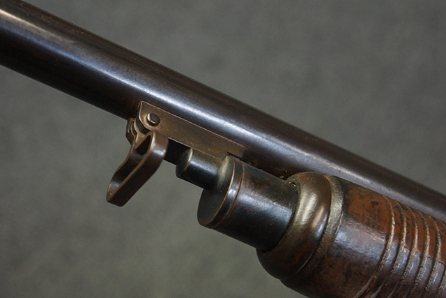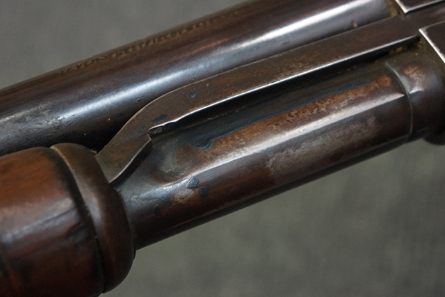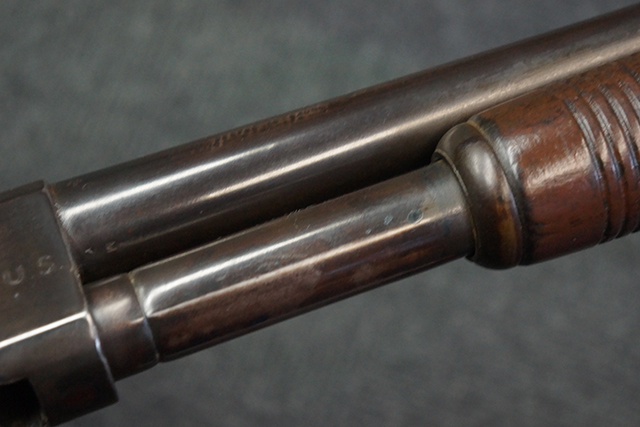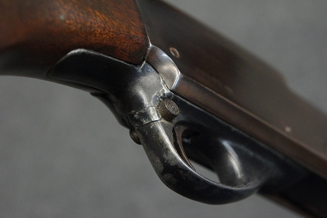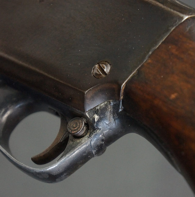 本品の機関部や銃身といった金属部は全体に仕上げ直しが施されており、打ち傷や擦れ、経年による褪色の他、一部に朽ち込み痕が見受けられます。 また、マガジン・チューブに一部凹みが見られる他、トリガー・ガード後部に補修痕が見受けられます。 木製のフォア・エンドやバット・ストックについても、打ち傷や線傷が見受けられますが、現状大きな割れ等は見受けられず、概ねしっかりとした強度が保たれており、各部の取り付けにも目立ったがたつきなどは見られません。 尚、フロント・サイト及びバット・プレートは欠品しています。 フォア・エンドは無可動加工により固定されています。 セーフティ・ボタンの切り替えについては問題なく、安全位置でトリガーがロックされます。