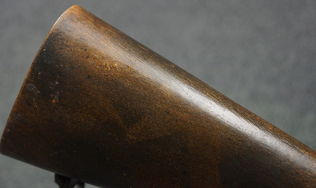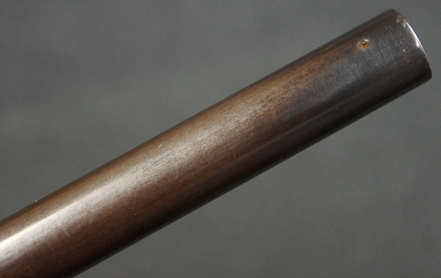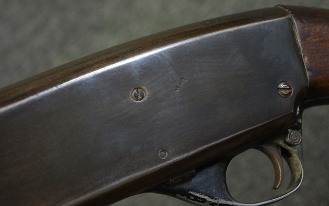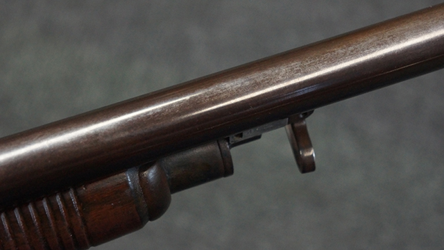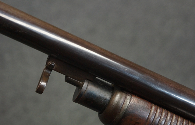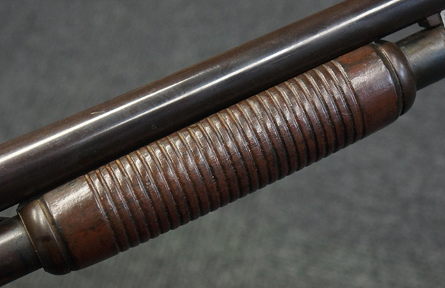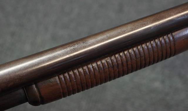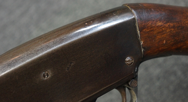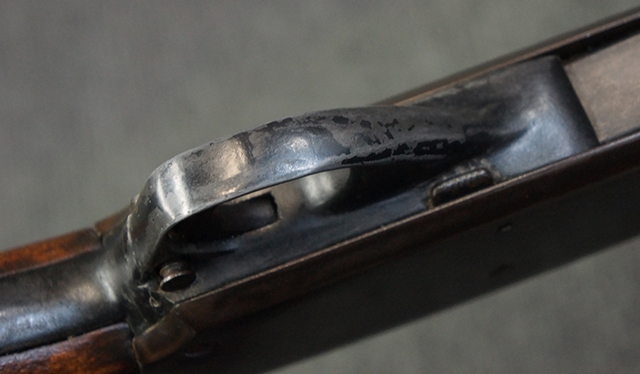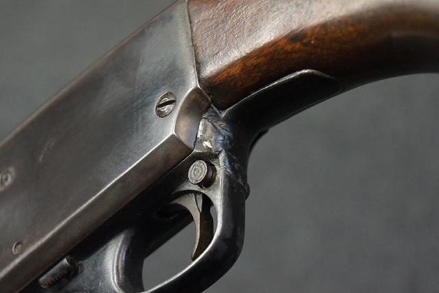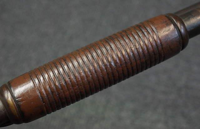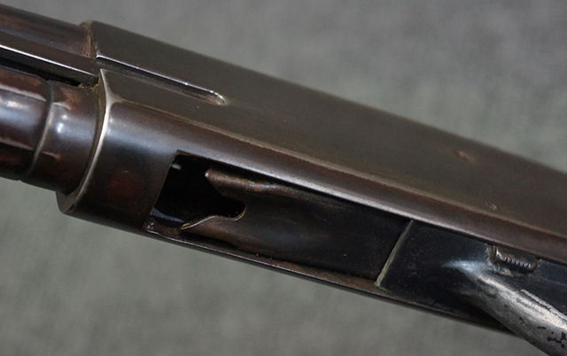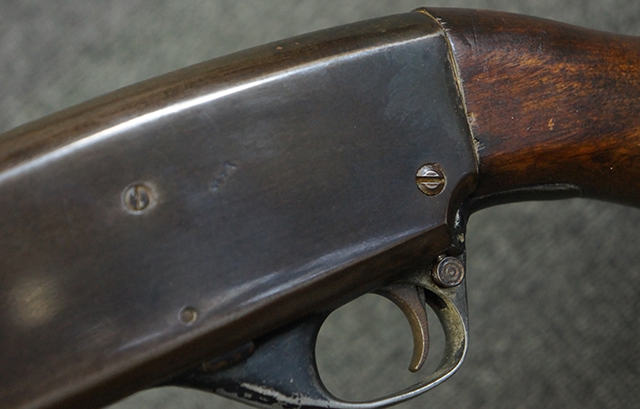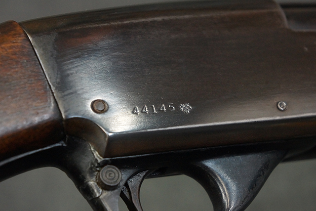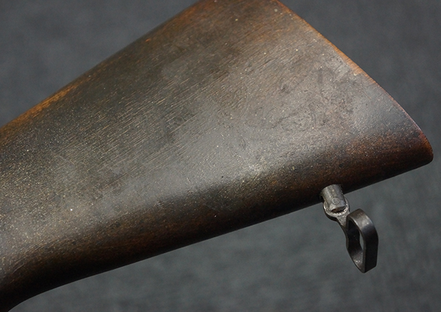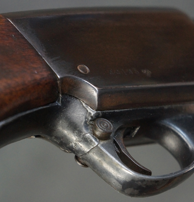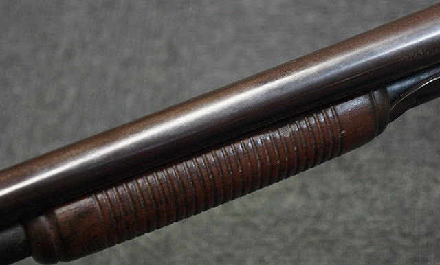 本品の機関部や銃身といった金属部は全体に仕上げ直しが施されており、打ち傷や擦れ、経年による褪色の他、一部に朽ち込み痕が見受けられます。 また、マガジン・チューブに一部凹みが見られる他、トリガー・ガード後部に補修痕が見受けられます。 木製のフォア・エンドやバット・ストックについても、打ち傷や線傷が見受けられますが、現状大きな割れ等は見受けられず、概ねしっかりとした強度が保たれており、各部の取り付けにも目立ったがたつきなどは見られません。 尚、フロント・サイト及びバット・プレートは欠品しています。 フォア・エンドは無可動加工により固定されています。 セーフティ・ボタンの切り替えについては問題なく、安全位置でトリガーがロックされます。