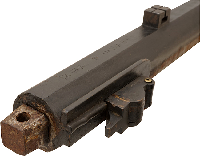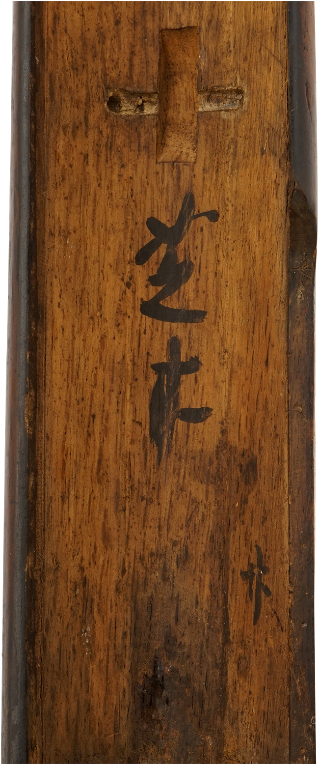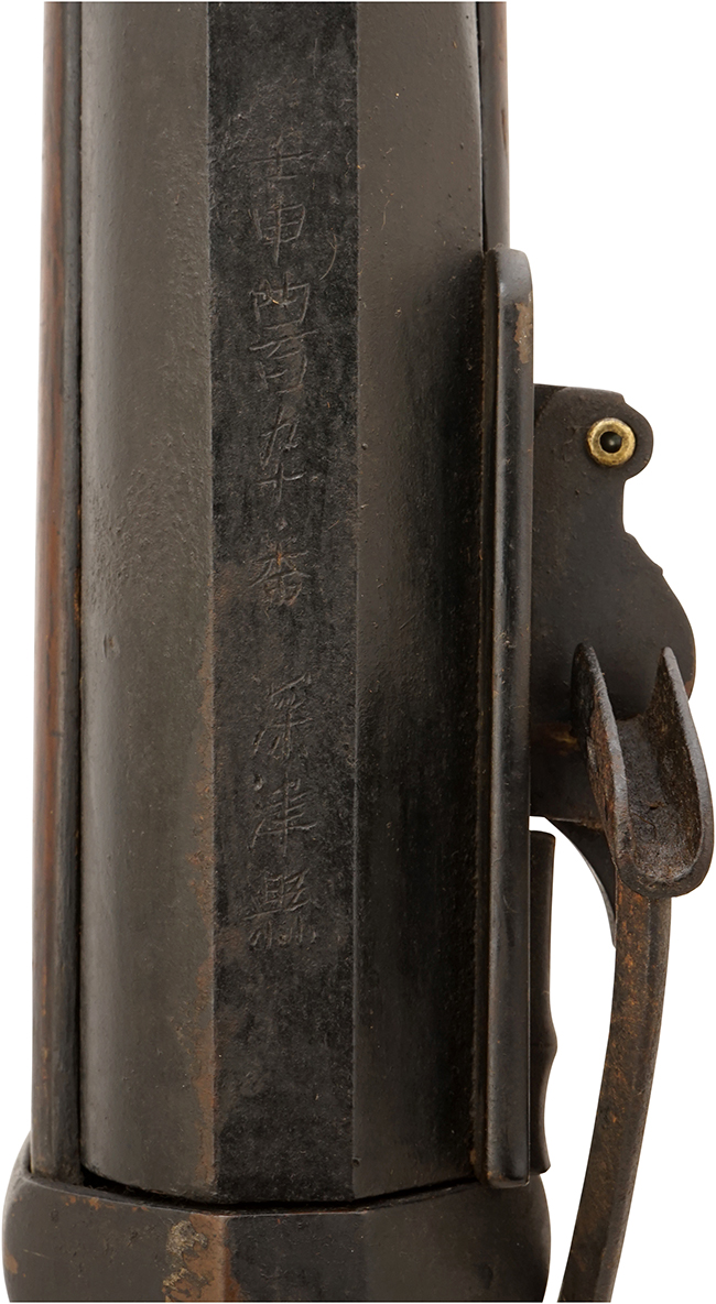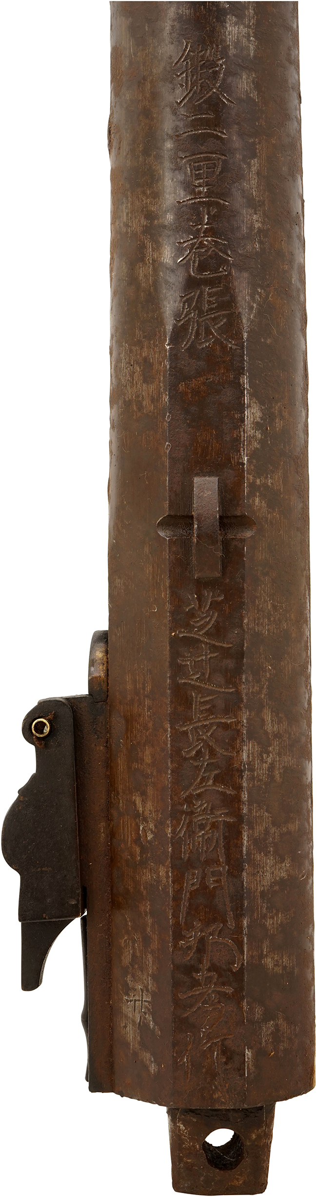 本品は在銘で、銃身下面には「鍛二重巻張 芝辻長左衛門邦考作」の銘が切られています。 全国鉄砲鍛冶名鑑 P.186「全国鉄砲鍛冶銘地域別分類」P.238にその銘が摂州堺 (=摂津国、現在の大阪府堺市) 住の鉄砲鍛冶として掲載されています。 「芝辻長左衛門邦考」の現存品の中で「嘉永二年(1849年)」の年記が入った品があるので江戸時代後期の鉄砲鍛冶であることが判ります。