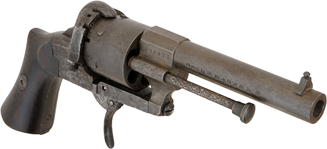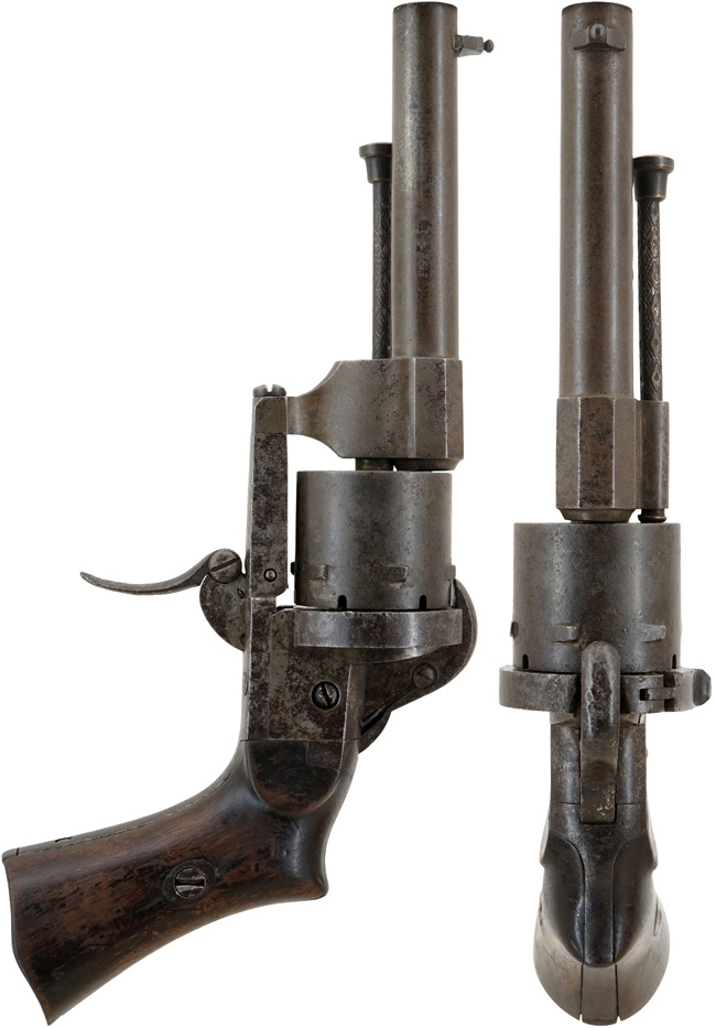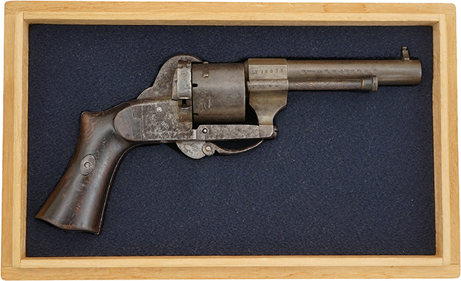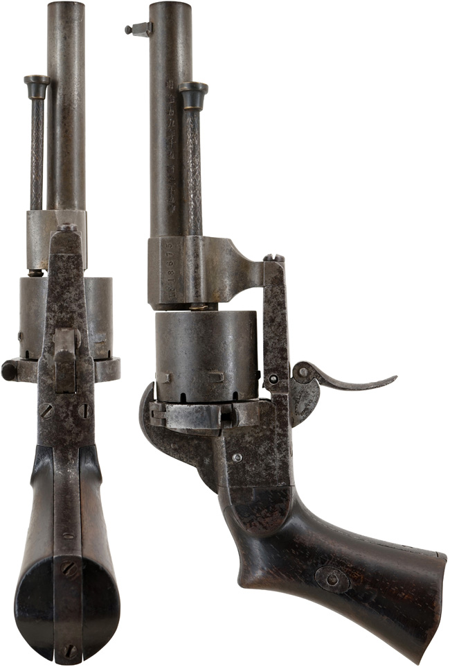 ルフォーショー (Lefaucheux) リボルバーは、フランスのガンスミスであったカジミール・ルフォーショー (Casimir Lefaucheux, 1802-1852) によって発明されたピン・ファイア式 (カニ目打ち式) の金属製薬莢を使用するリボルバーで、フランス人のユージーン・ルフォーショー (Eugene Lefaucheux) によって1854年に考案され、フランス及びベルギーでパテントが取得された後、1860-70年代頃にかけて多種多様な製品が製造されました。 ピン・ファイア式は従来のパーカッション (管打ち) 式に比べて装薬や弾頭、そして雷管が脱落する心配がなく、迅速に装填が可能といった長所がありました。 ルフォーショー・リボルバーはドイツ、英国、スペインなどでも極少数が製造され、1854年にはM1854としてフランス軍初の金属製薬莢を使用するリボルバーとして採用されました。