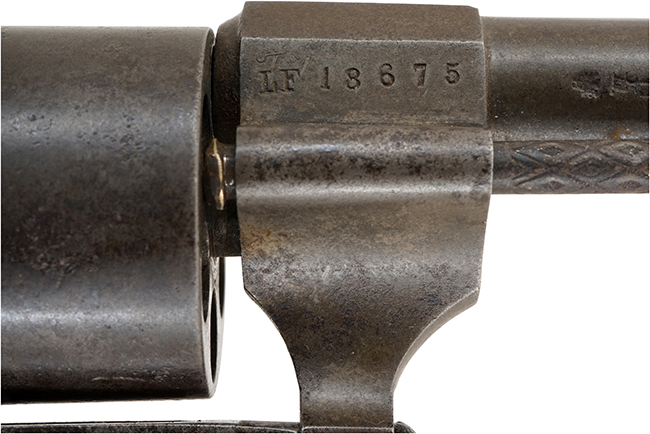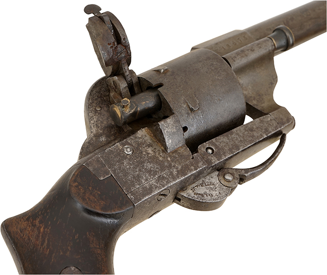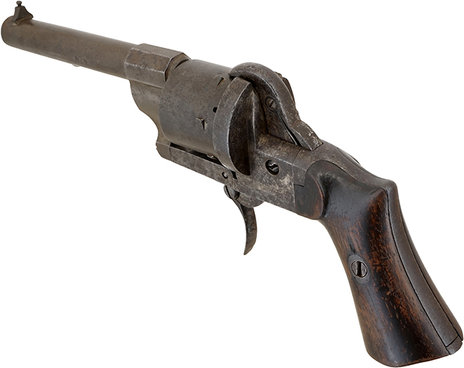 ピン・ファイア式リボルバーは、ヨーロッパではスタンダードな種類でしたが、パテントの関係か、アメリカでは殆ど生産されませんでした。 当時ルフォーショーはピン・ファイア拳銃の代名詞となっており、その後リムファイア方式が登場した後も生産が続けられ、センター・ファイア式が普及する頃までヨーロッパで多種多様な品が作られました。 これらのルフォーショー・リボルバーはヨーロッパを始め、アメリカなど世界各国に輸出されましたが、特に幕末期には多くの種類のルフォーショー拳銃が日本国内に輸入されました。 本品には日本の刻印は入っていませんが幕末に国内に輸入された品と思われます。
