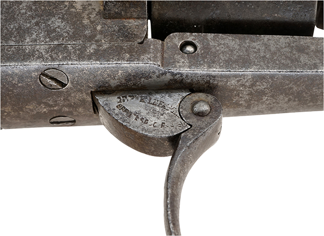 本品の銃身基部右側面にはLF18675のシリアルNo.に加えて、非常に薄くなっていますが、フランス製の本家ルフォーショー社製の品だけに打刻されたプルーフ刻印である中折れ式古式銃のロゴが確認できます。 また、トリガー基部にも非常に薄くなっていますが、「INVON E. LEFAUCHEUX BREVETE SGDG (PARIS)」の刻印の一部が確認出来ます。