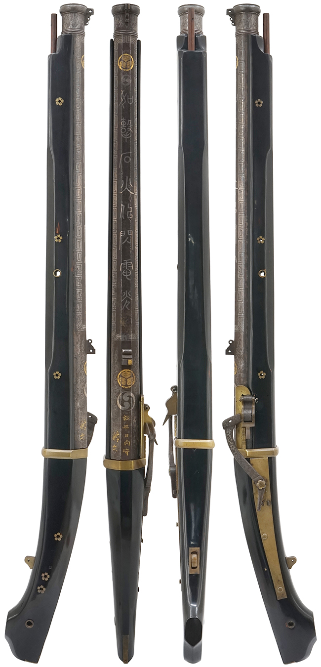 弊社は日本唯一の古式銃専門店として数多くの火縄銃を扱っておりますが、本品はその中でも「扱った事のない各種の沢山の象嵌が施された中筒」です。 このような火縄銃の象嵌や象嵌の文様の研究があまり進んでいませんので、これからの研究が期待される分野の品です。 銃身に施された多くの象嵌を始め黒漆塗りの銃床と見所の多い品です。 本品を使用した武家は特定できておりませんが、これ程の品を使用したのは相当な家柄であったのではないでしょうか? 実戦用ではなく装飾に重点を置いた飾太刀の様に家格を誇示するために作られた逸品と思います。 (MM)