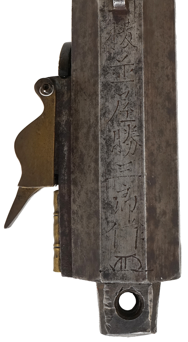 本品は在銘品で、筒 (銃身) 下面に「榎並屋勝三郎(えなみや かつさぶろう)[花押]」の銘が切られています。 榎並屋勝三郎は摂州・堺の鉄砲鍛冶で、「全国鉄砲鍛冶銘鑑」P.48及び「全国鉄砲鍛冶銘地域別分類」P.201に「摂州住」と掲載されています。