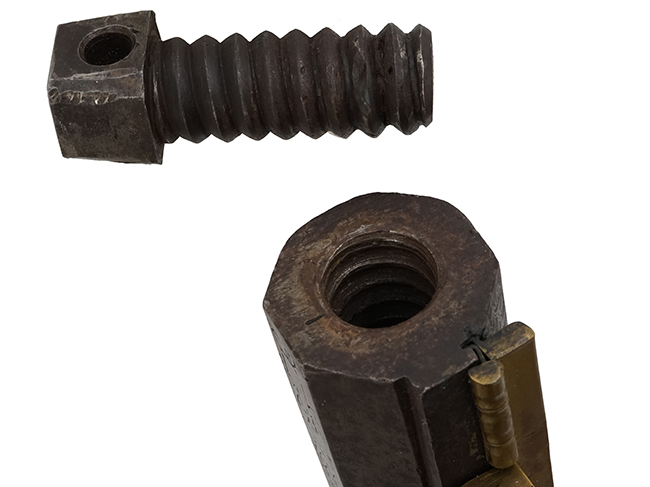 本品は口径が約19mm (十匁)、全長が873mmm、銃身長が583mmmと口径の割には細っりとした中筒ですが、実用と言うよりは儀式用ではないかと思います。