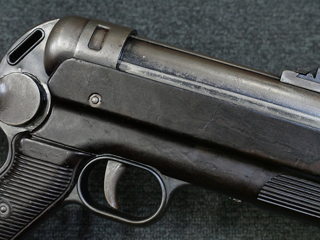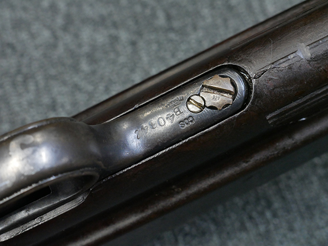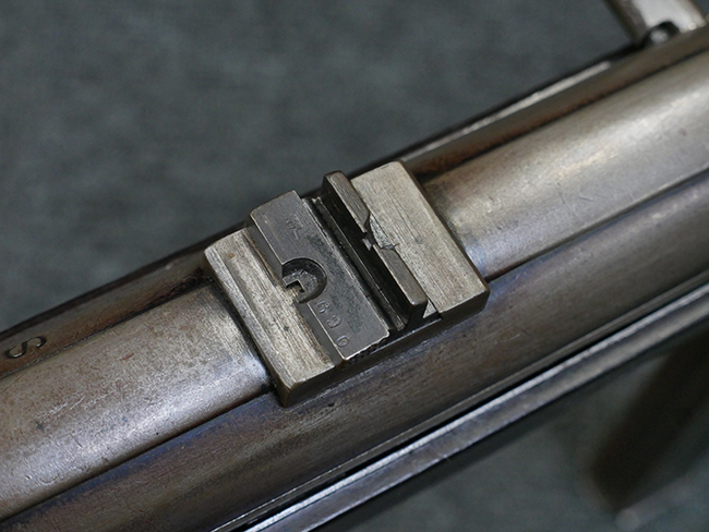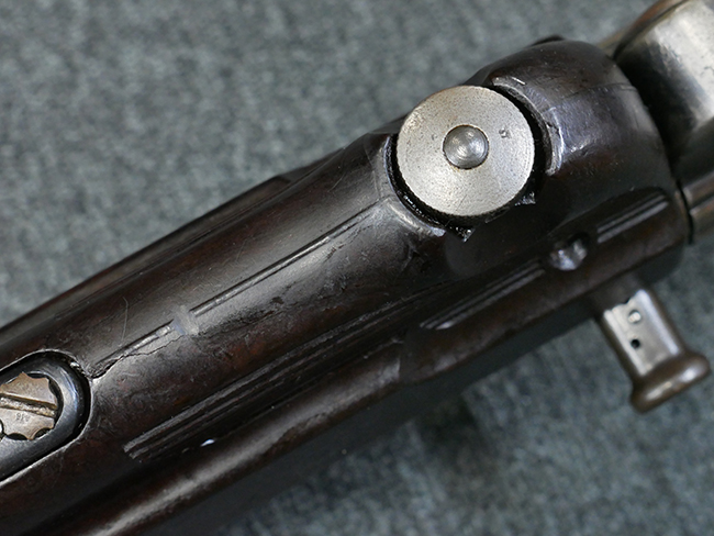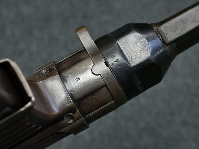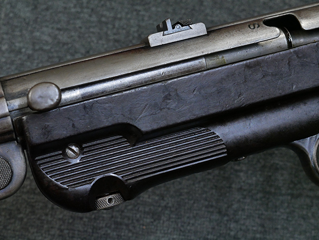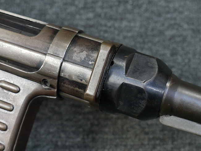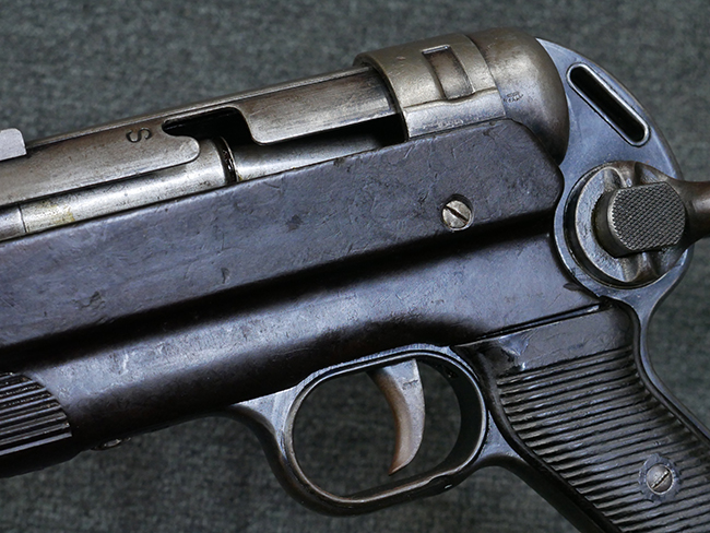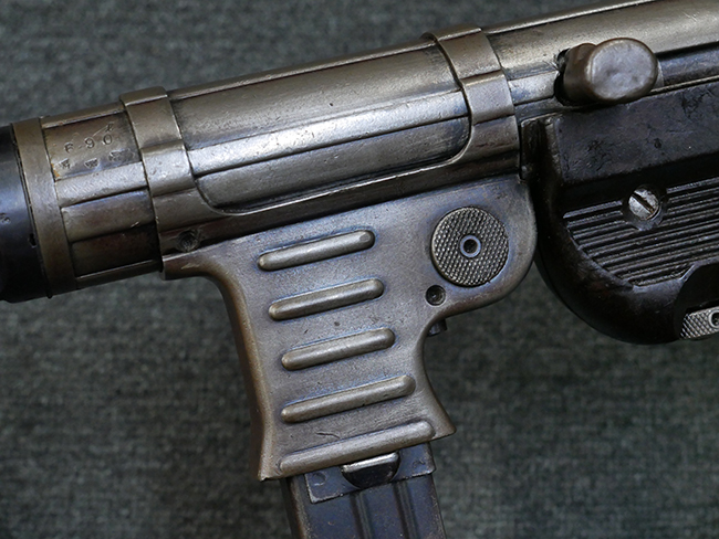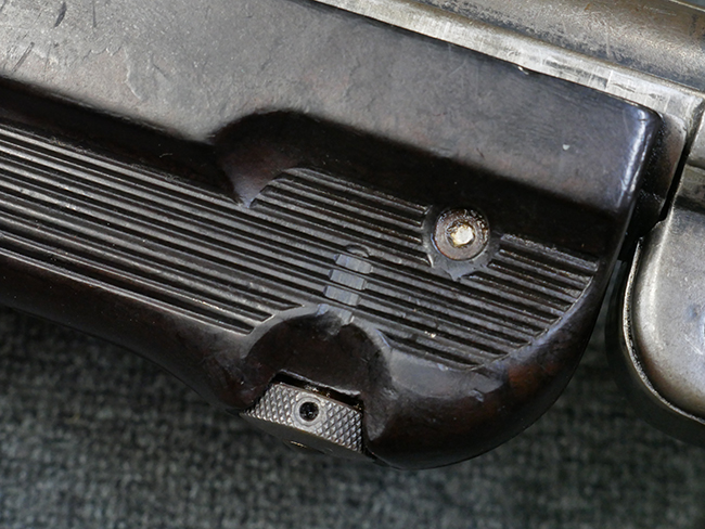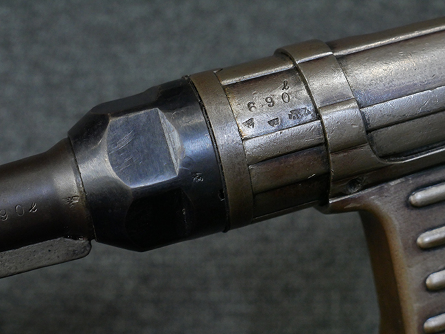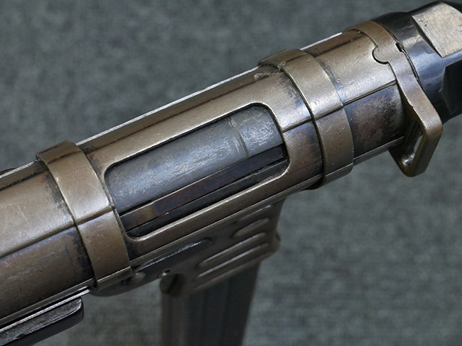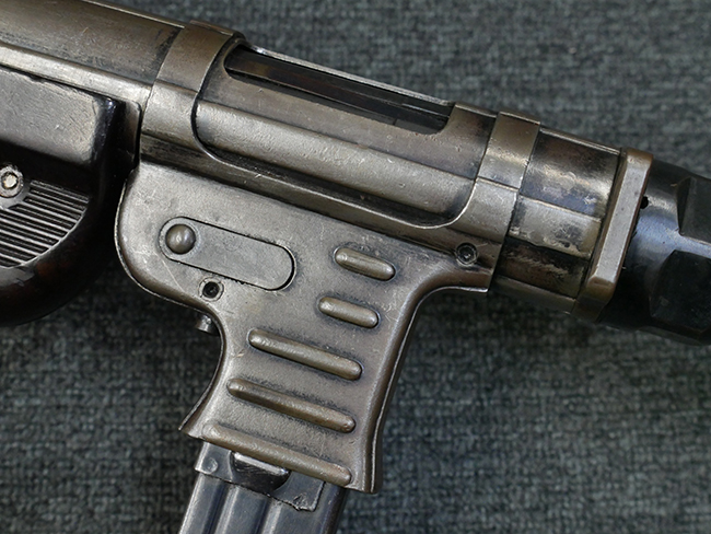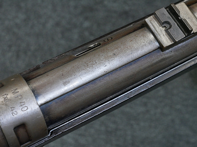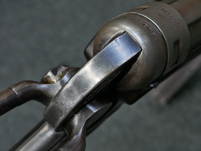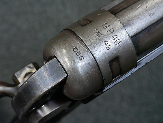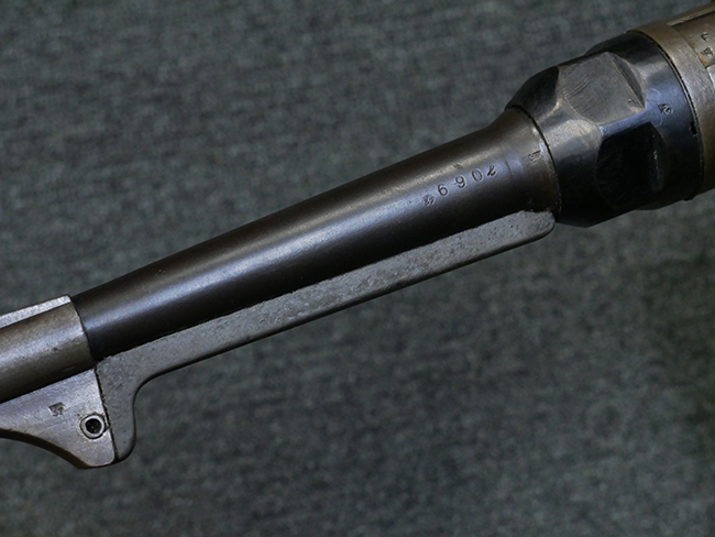 本品のレシーバー・エンド・キャップ上面には1942年 C.G.ハーネル社製を示す「MP40 fxo 42」の刻印が入っています。 マガジン・ハウジングは両面に5本の強化リブが追加されたタイプとなっています。 シリアルNo.はアッパー・レシーバー、フロント・サイト・ガード、銃身、リア・サイトでマッチしています。 その他の部分のシリアルNo.については、トリガー・ガードが4064l、ストックのロック解除ボタンが64、折り畳みストックが064、リコイル・スプリング・アッセンブリが337となっています。 その他、各部にはアムト刻印が見られます。 マズル・リングは後期型の中央に溝のあるH型、バレル・ナットは六角型、バレル・レストは樹脂製となっており、コッキング・ハンドルは1942年半ば以降に本格的に導入されたボルト・セーフティ機能を備えた2ピース・タイプが装備されています。