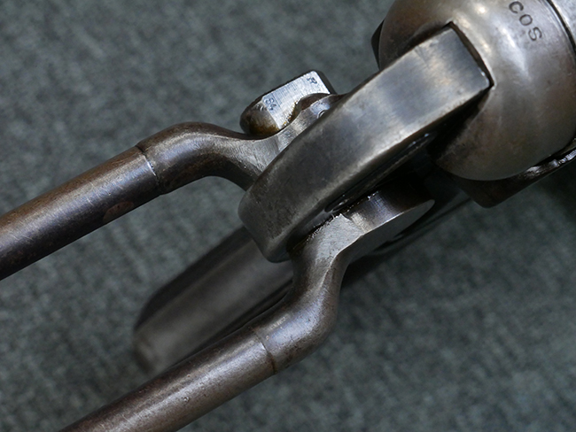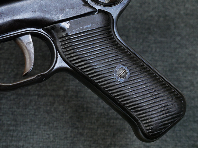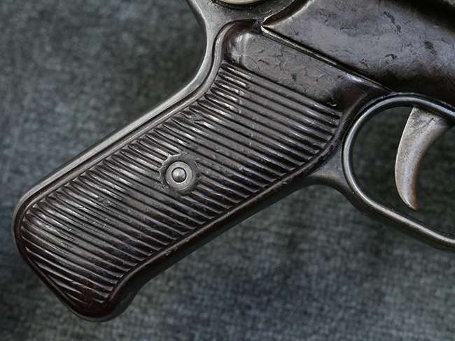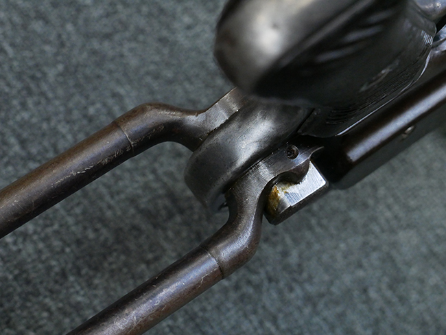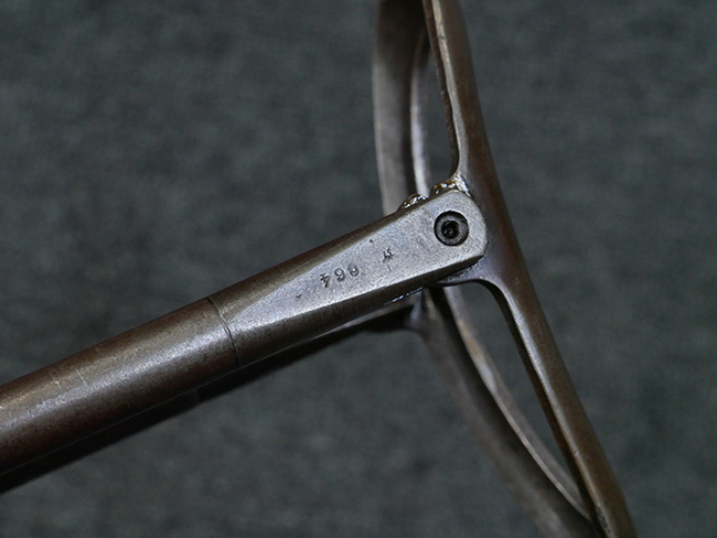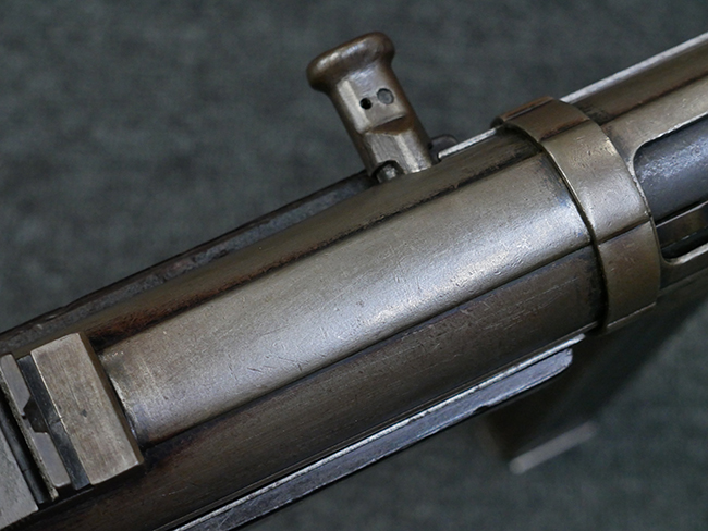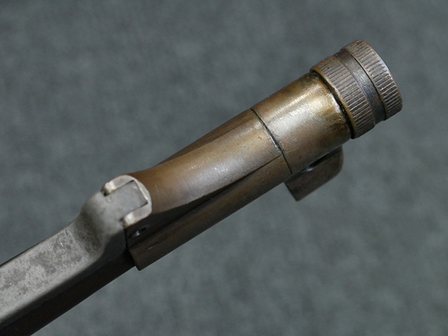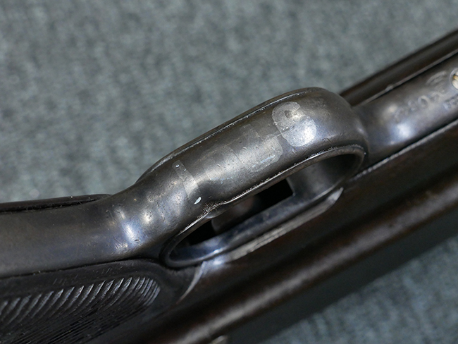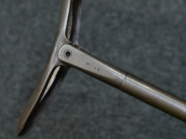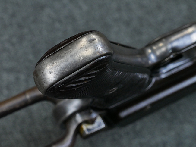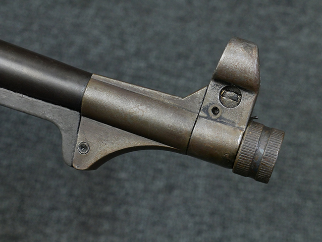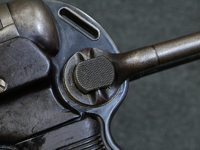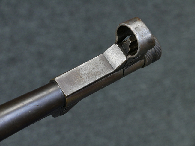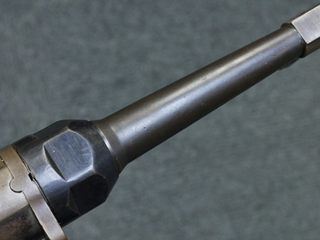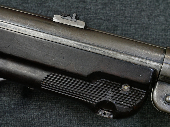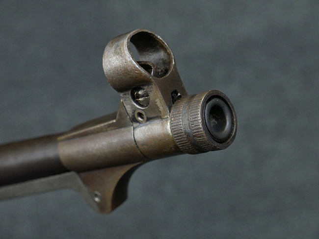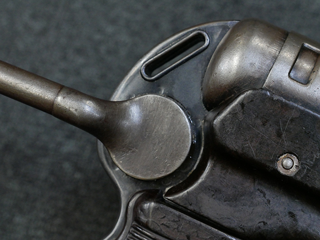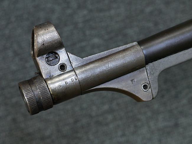 本品のレシーバー・エンド・キャップ上面には1942年 C.G.ハーネル社製を示す「MP40 fxo 42」の刻印が入っています。 マガジン・ハウジングは両面に5本の強化リブが追加されたタイプとなっています。 シリアルNo.はアッパー・レシーバー、フロント・サイト・ガード、銃身、リア・サイトでマッチしています。 その他の部分のシリアルNo.については、トリガー・ガードが4064l、ストックのロック解除ボタンが64、折り畳みストックが064、リコイル・スプリング・アッセンブリが337となっています。 その他、各部にはアムト刻印が見られます。 マズル・リングは後期型の中央に溝のあるH型、バレル・ナットは六角型、バレル・レストは樹脂製となっており、コッキング・ハンドルは1942年半ば以降に本格的に導入されたボルト・セーフティ機能を備えた2ピース・タイプが装備されています。
