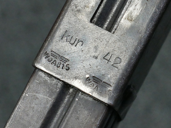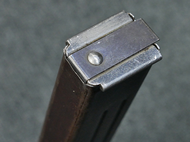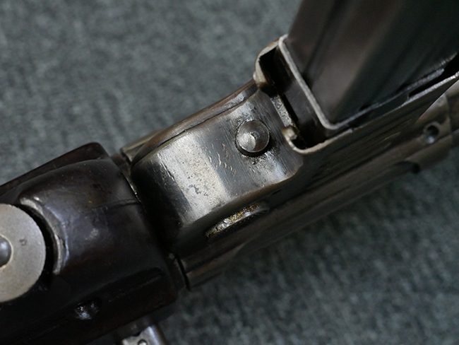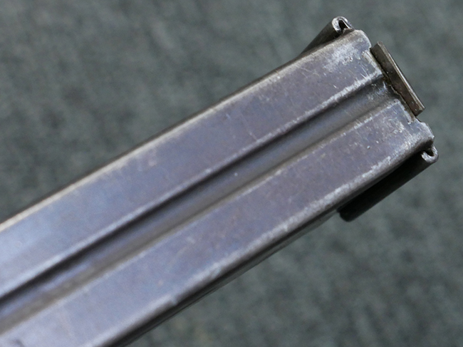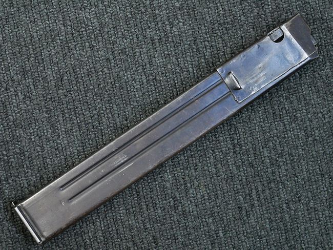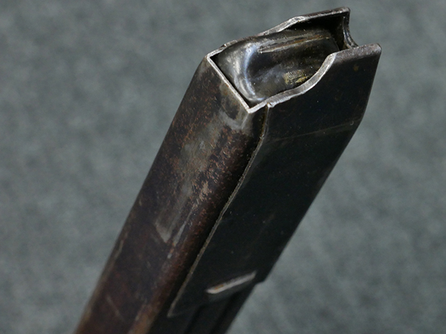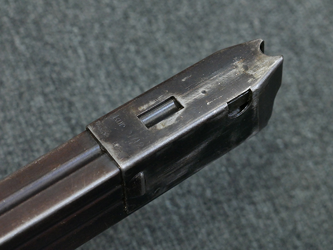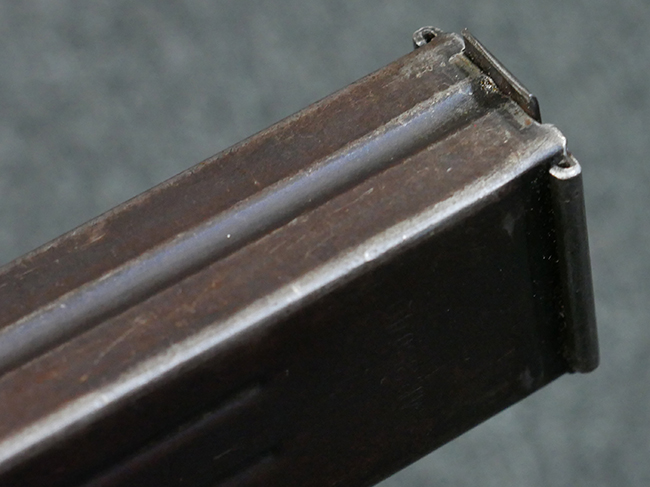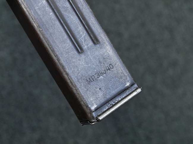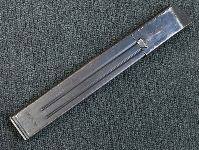 本品の金属部はやや打ち傷や擦れ、若干の表面錆や経年による褪色が見られるものの、現状目立った欠損等は見られません。 フロント・サイト、アッパー・レシーバー、レシーバー・エンド・キャップは表面仕上げが落ちて地の金属色が露出している状態です。 一方で銃身やバレル・ナット、ボルトやロアー・レシーバーには比較的ブルー仕上げが残っています。 上下レシーバーの取り付けにやや遊びが見られる他、トリガー・ガードには1カ所凹みが見られ、9701とペイントされていた痕が残っています。 フロント・サイト・ガードに若干の歪みが見られますが、あまり気にならないレベルのものです。 樹脂製のハンドガードやグリップ・パネル、バレル・レストについては、やや打ち傷や線傷、摩耗は見られるものの、大きな破損等は見られず、概ねしっかりとした状態が保たれています。 グリップ・パネルは左右の色味もほぼマッチしており、違和感は感じられません。 マガジンは取り付け時に前後にやや遊びが見られるものの、固定自体はしっかりとしています。 リア・サイトの切り替えやストックの展開・折り畳み操作については問題なく行う事が可能です。 ストックは展開時及び折り畳み時に遊びが見られますが、ロック機能に問題はありません。 付属のマガジンには「M.P.38 u 40」及び1942年 ステアー・ダイムラー・プフ社製を示す「kur 42」の刻印が入っています。 マガジン右側面にごく浅い凹みが見られますが、フォロアーの動きはスムーズです。 ボトム・プレート固定用の板バネ折り返し部分に欠損が見られますが、マガジン・スプリングのテンションが掛かっているため勝手に脱落してしまうことはありません。 その他、マガジン外装にはやや小傷や表面仕上げの褪色、若干の表面錆痕が見られるものの、大きな変形等は見られず、比較的しっかりとした状態が保たれています。 マガジン・スプリングは入っています。