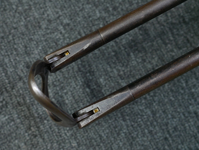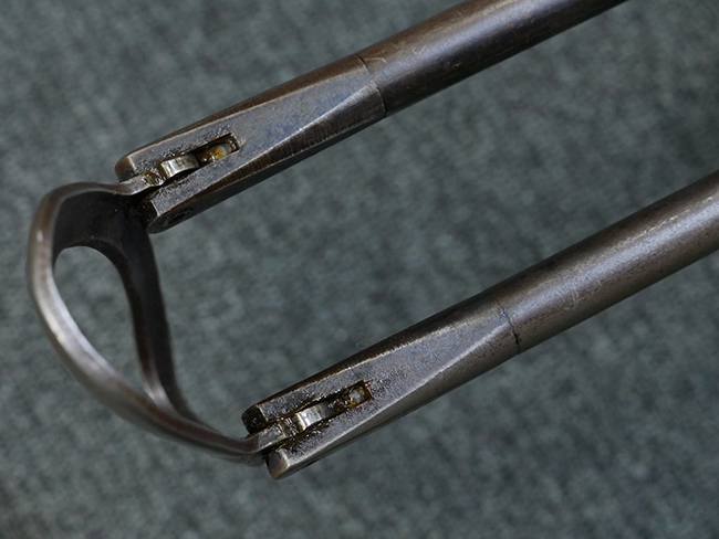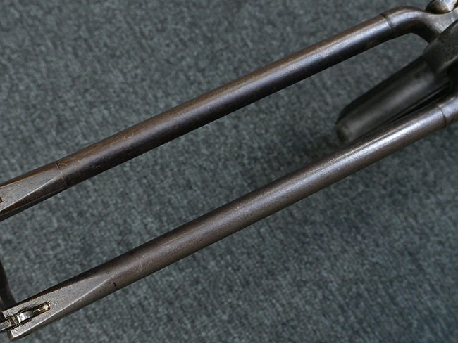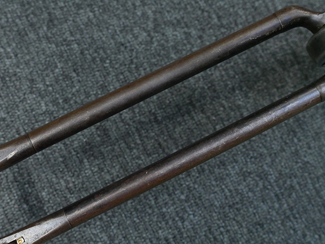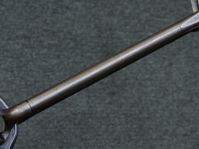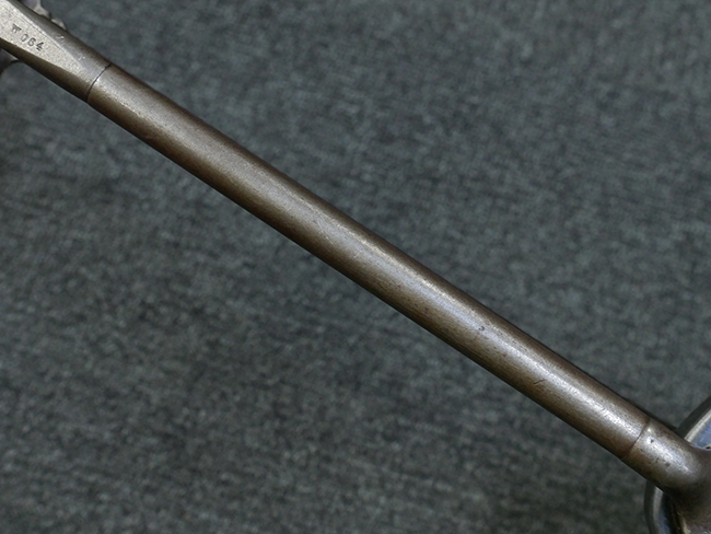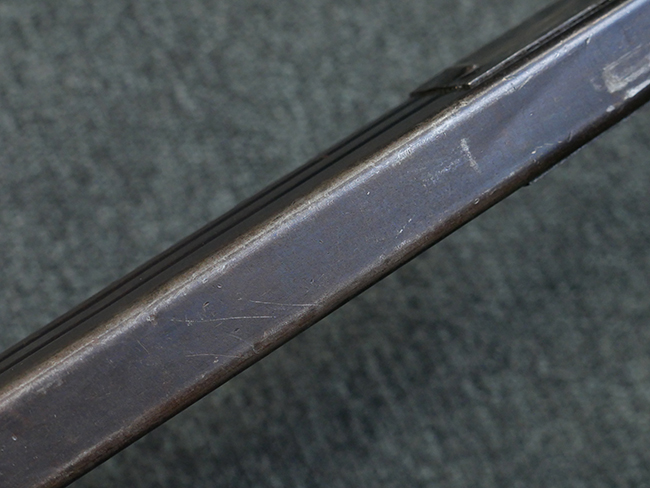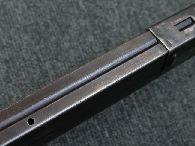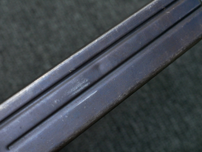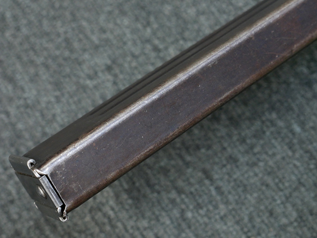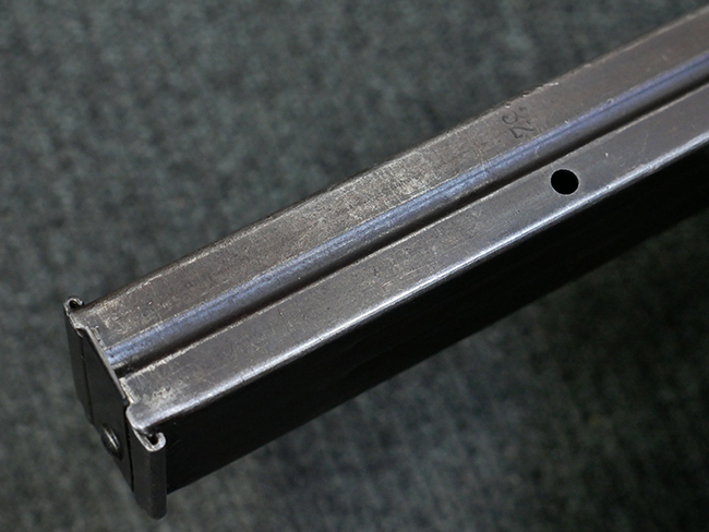 本品の金属部はやや打ち傷や擦れ、若干の表面錆や経年による褪色が見られるものの、現状目立った欠損等は見られません。 フロント・サイト、アッパー・レシーバー、レシーバー・エンド・キャップは表面仕上げが落ちて地の金属色が露出している状態です。 一方で銃身やバレル・ナット、ボルトやロアー・レシーバーには比較的ブルー仕上げが残っています。 上下レシーバーの取り付けにやや遊びが見られる他、トリガー・ガードには1カ所凹みが見られ、9701とペイントされていた痕が残っています。 フロント・サイト・ガードに若干の歪みが見られますが、あまり気にならないレベルのものです。 樹脂製のハンドガードやグリップ・パネル、バレル・レストについては、やや打ち傷や線傷、摩耗は見られるものの、大きな破損等は見られず、概ねしっかりとした状態が保たれています。 グリップ・パネルは左右の色味もほぼマッチしており、違和感は感じられません。 マガジンは取り付け時に前後にやや遊びが見られるものの、固定自体はしっかりとしています。 リア・サイトの切り替えやストックの展開・折り畳み操作については問題なく行う事が可能です。 ストックは展開時及び折り畳み時に遊びが見られますが、ロック機能に問題はありません。 付属のマガジンには「M.P.38 u 40」及び1942年 ステアー・ダイムラー・プフ社製を示す「kur 42」の刻印が入っています。 マガジン右側面にごく浅い凹みが見られますが、フォロアーの動きはスムーズです。 ボトム・プレート固定用の板バネ折り返し部分に欠損が見られますが、マガジン・スプリングのテンションが掛かっているため勝手に脱落してしまうことはありません。 その他、マガジン外装にはやや小傷や表面仕上げの褪色、若干の表面錆痕が見られるものの、大きな変形等は見られず、比較的しっかりとした状態が保たれています。 マガジン・スプリングは入っています。