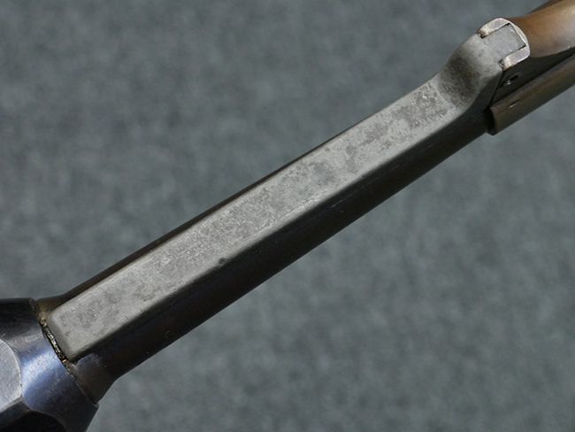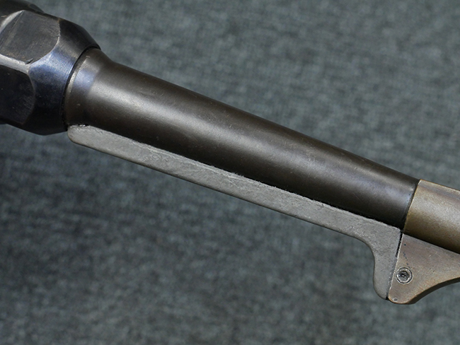 1943~1944年頃にステアー社で製造されたMP40短機関銃の最終型では、レシーバー・エンド・キャップとロア・レシーバーをプレスにより一体成型しているのが特徴です。 このタイプでは、プレスにより鋼板を折り込む方法でロア・レシーバー全体を成形しており、エンド・キャップ上面からロア・レシーバーの外縁部にかけて補強板のように見える板状の継ぎ目が見られます。 バレル・レストは1943年にエルマ社で製造されたタイプと同様にプレス製となっています。