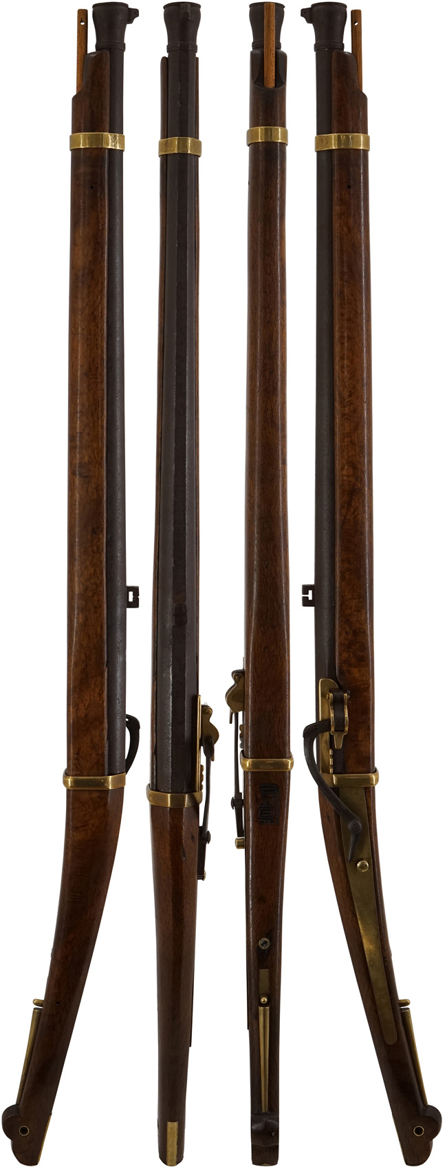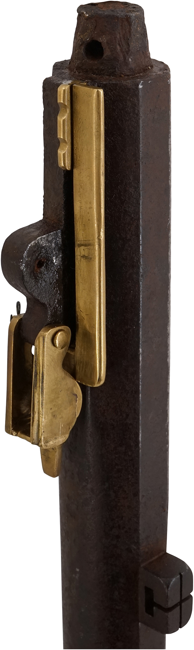 尾栓は現状では固着していますが、ねじ込み部分の基部には大きな錆は出ておらず、外れそうに見えます。 カラクリの作動については至極完全で、火挟を起こした際のロックはしっかりと掛かり、火挟が起きた状態で引金を引くと、火挟が力強く落ちます。 木製のカルカ (さく杖) が付属致します。(MM)
