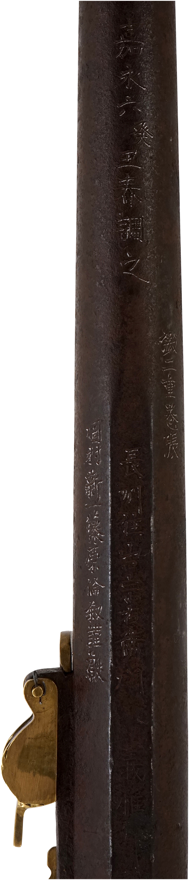 本品は長銘の在銘で、銃身下面には「鍛二重巻張 嘉永六癸丑春調之 長州住山口宗右衛門義惟作 岡村新一藤原倫叙謹戯」の銘が切られています。 「長州住山口宗右衛門義惟作」の部分が鉄砲鍛冶の銘で「山口宗右衛門義惟」は「全国鉄砲鍛冶名鑑 」のP.291に、「全国鉄砲鍛冶銘地域別分類」のP.183にその銘が長州 (=長門国、現在の山口県) 住の鉄砲鍛冶として掲載されています。