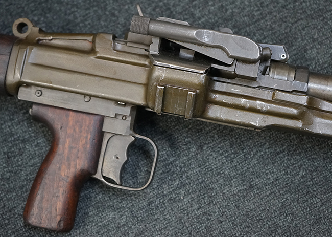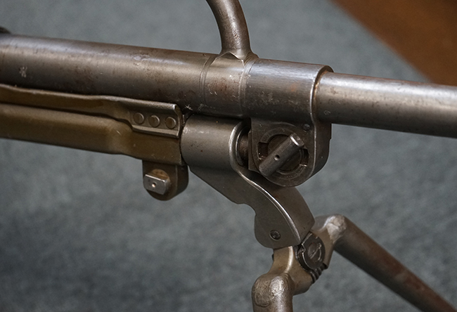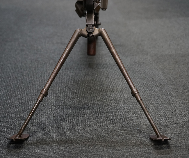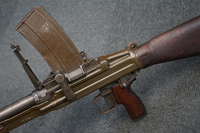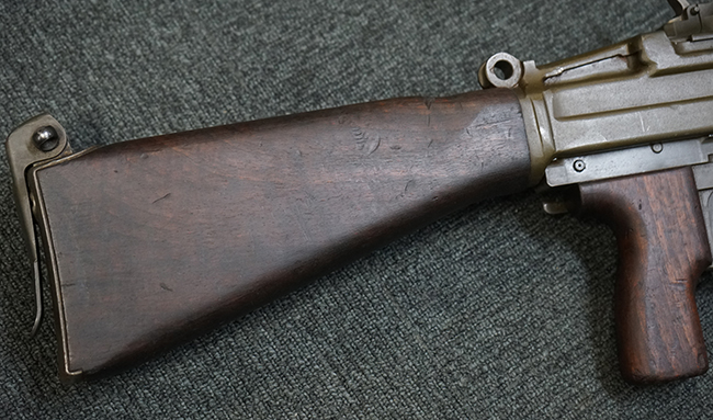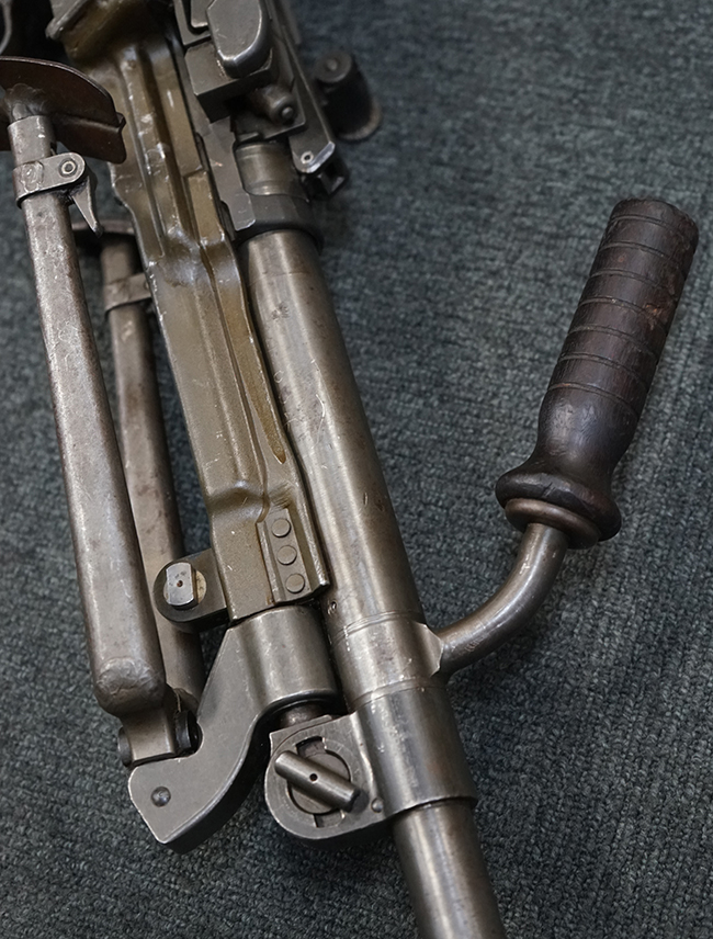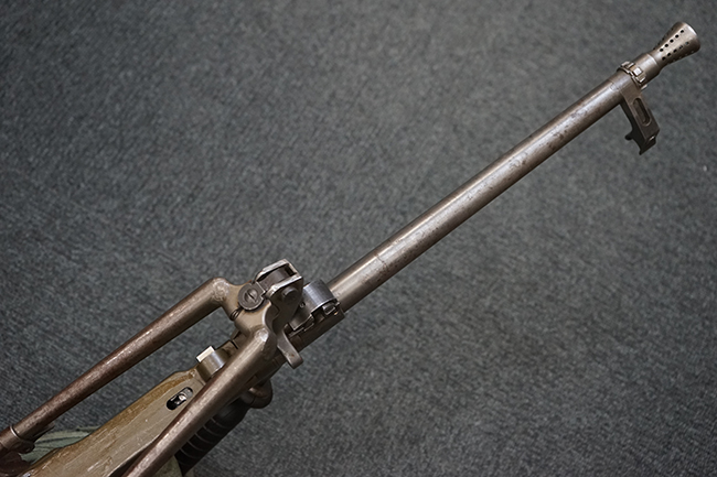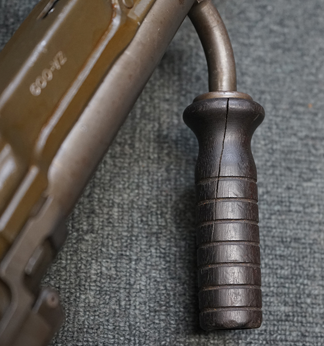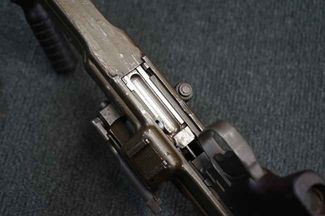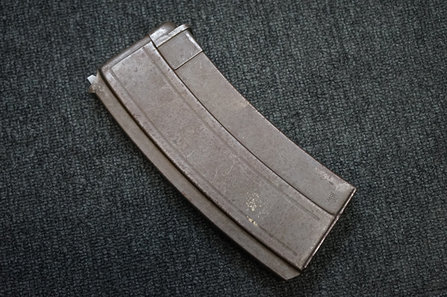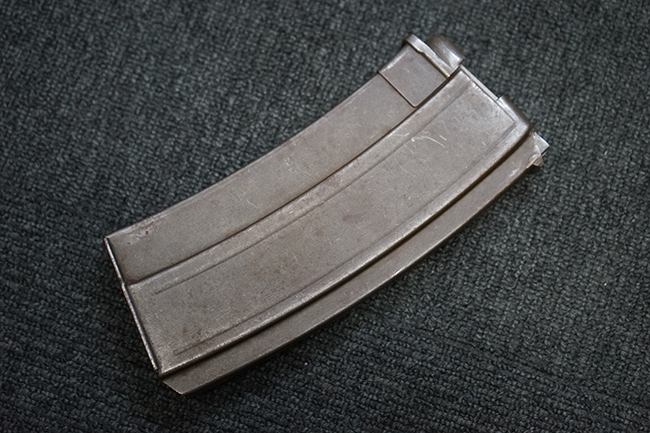 本品は全体に適度な使用感が見受けられ、機関部や銃身といった金属部はやや打ち傷や擦れ、経年による褪色の他、一部に時代錆が表れているものの、目立った欠損や朽ち込み等は見受けられず、概ねしっかりとした状態が保たれています。 グリップ、バット・ストック、キャリング・ハンドルといった木部についても、やや打ち傷や線傷が見られる他、キャリング・ハンドル下部に長さ7cm程度のひびが見られるものの、全体としては大きな欠損等は見られず、各部の取り付けもがたつきもなくしっかりとしています。 リア・サイトの調整や二脚の展開・伸縮、マガジンの着脱、マガジン挿入口のカバー及びフィード・カバーの開閉、ショルダー・レストの展開操作については問題なく行う事が可能です。 また、内部との連動は有りませんが、グリップ左側面のレバーを押し下げる事により、グリップを前後させる独特の操作も楽しむ事が可能です。 付属のマガジンについても全体に使い込まれたコンディションとなっており、全体にやや仕上げが薄くなり、一部に時代錆や若干の凹みが見受けられます。 尚、マガジン・スプリングは入っていません。