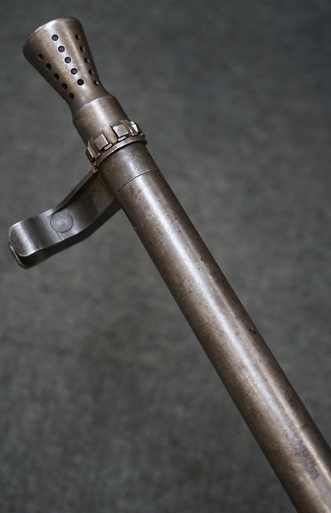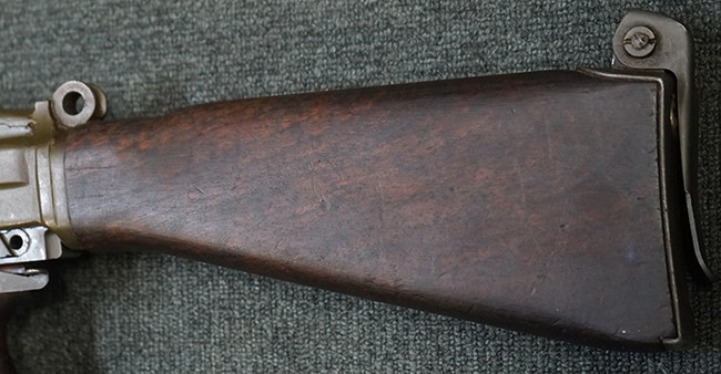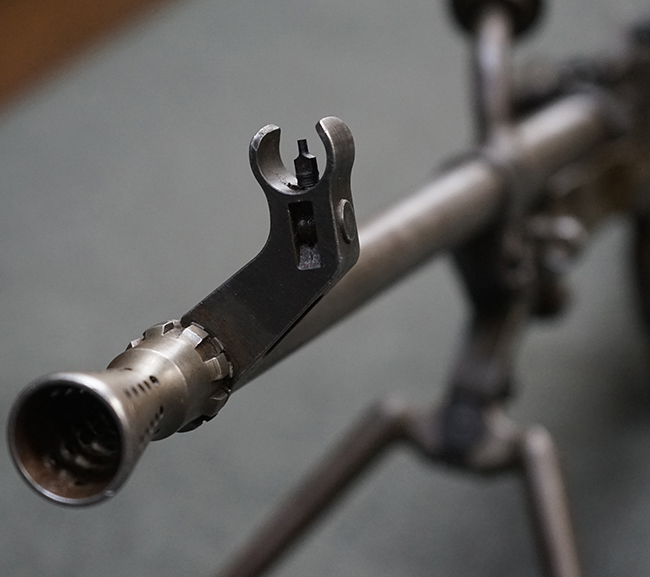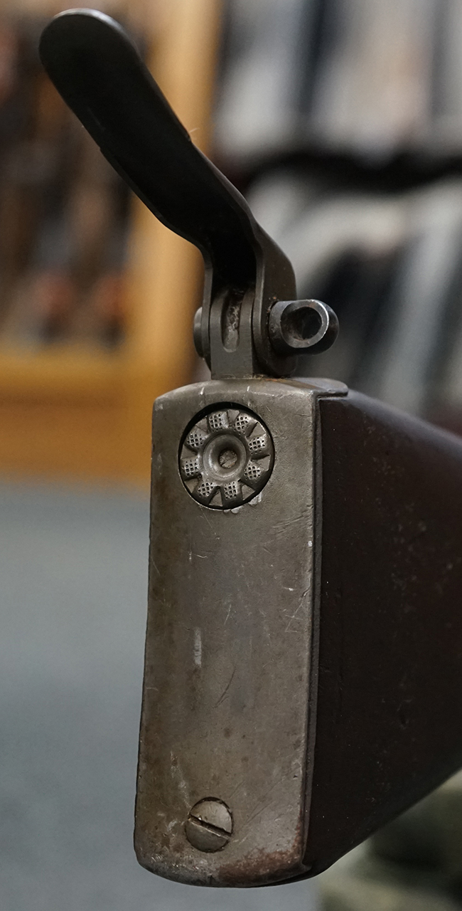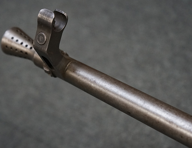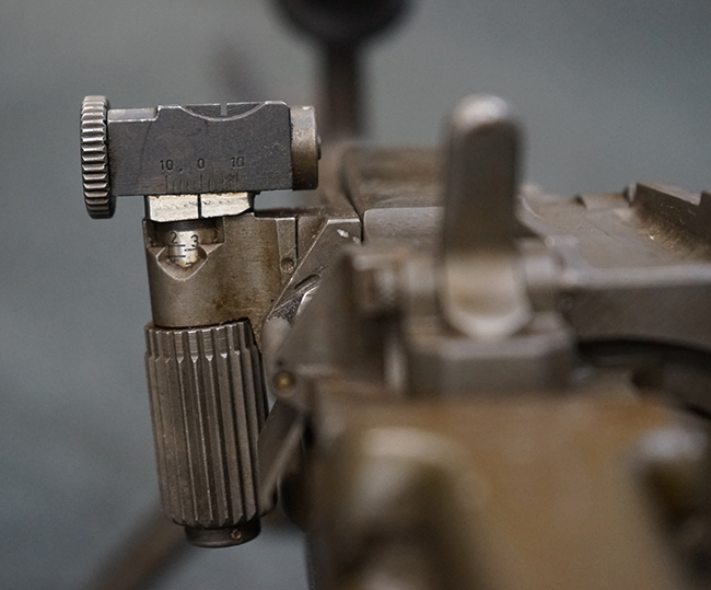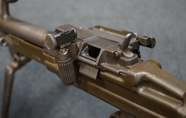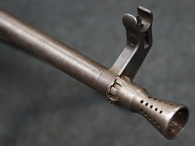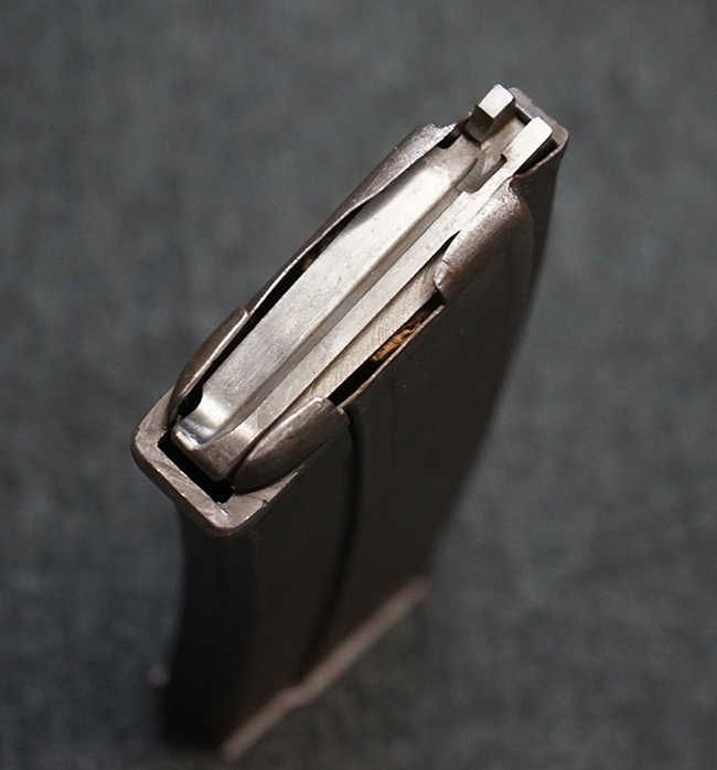 本品は全体に適度な使用感が見受けられ、機関部や銃身といった金属部はやや打ち傷や擦れ、経年による褪色の他、一部に時代錆が表れているものの、目立った欠損や朽ち込み等は見受けられず、概ねしっかりとした状態が保たれています。 グリップ、バット・ストック、キャリング・ハンドルといった木部についても、やや打ち傷や線傷が見られる他、キャリング・ハンドル下部に長さ7cm程度のひびが見られるものの、全体としては大きな欠損等は見られず、各部の取り付けもがたつきもなくしっかりとしています。 リア・サイトの調整や二脚の展開・伸縮、マガジンの着脱、マガジン挿入口のカバー及びフィード・カバーの開閉、ショルダー・レストの展開操作については問題なく行う事が可能です。 また、内部との連動は有りませんが、グリップ左側面のレバーを押し下げる事により、グリップを前後させる独特の操作も楽しむ事が可能です。 付属のマガジンについても全体に使い込まれたコンディションとなっており、全体にやや仕上げが薄くなり、一部に時代錆や若干の凹みが見受けられます。 尚、マガジン・スプリングは入っていません。