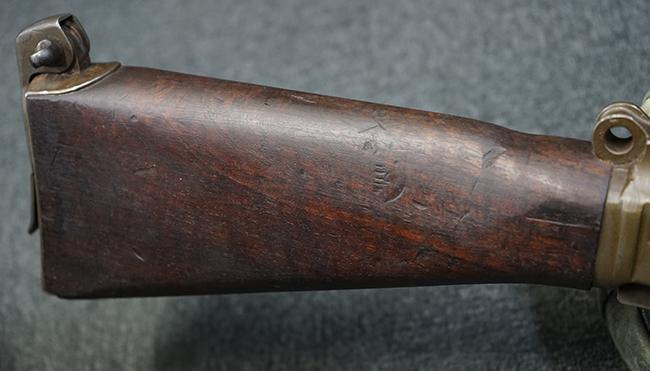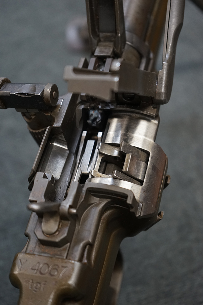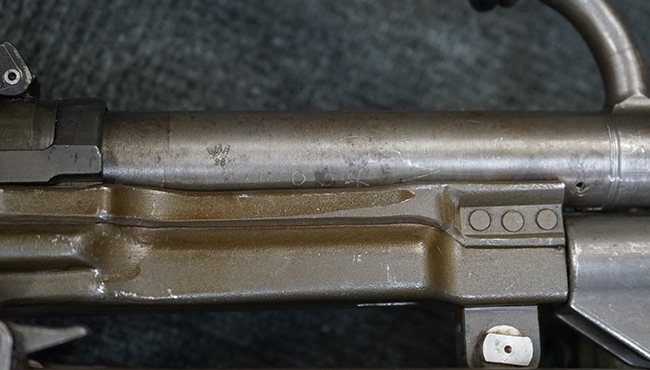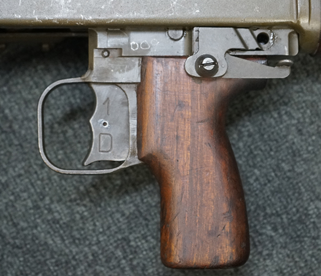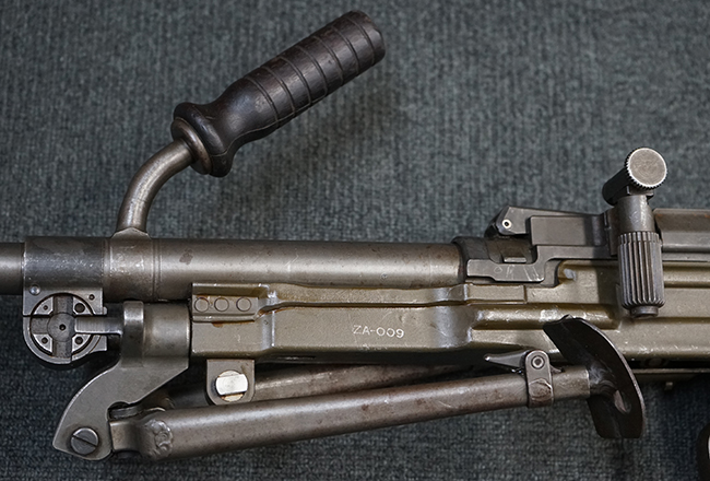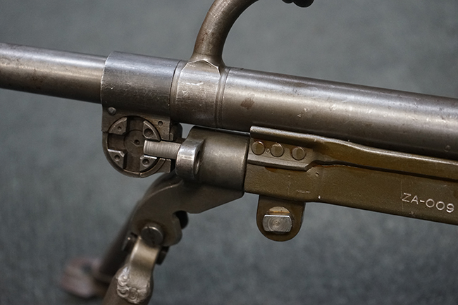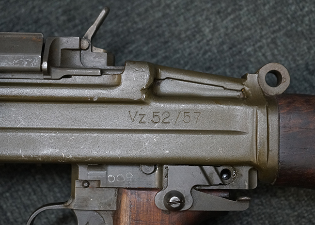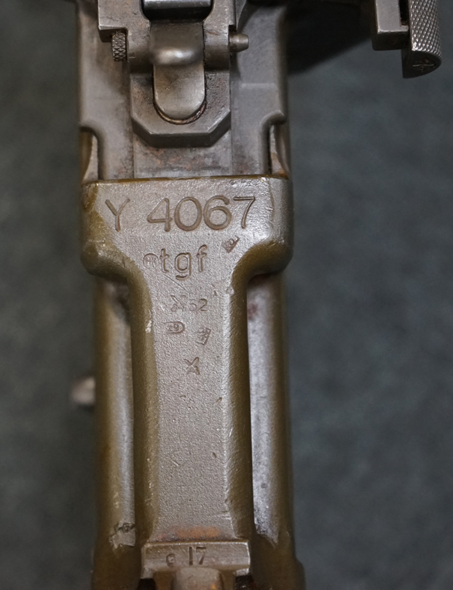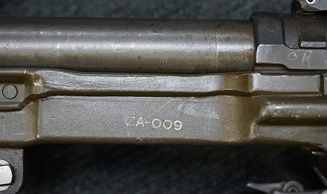 本品の機関部後部左側面には「Vz.52/57」のモデル名刻印が入っており、機関部上面にはY4067のシリアルNo.の他、ズブロヨフカ・ブルーノ (Zbrojovka Brno) を示す「tgf」のコードが入っています。 その他、機関部左側面前部にZA-009の番号が打刻されており、グリップ・フレーム左側面に009、銃身基部右側面にZA-004の番号が手彫りにより入っています。