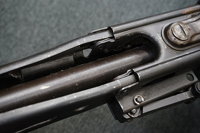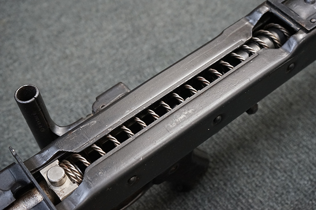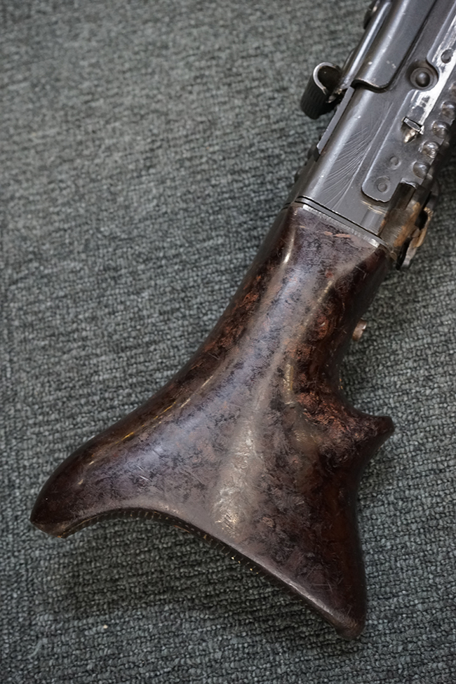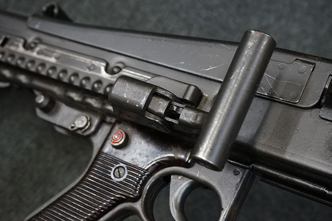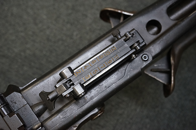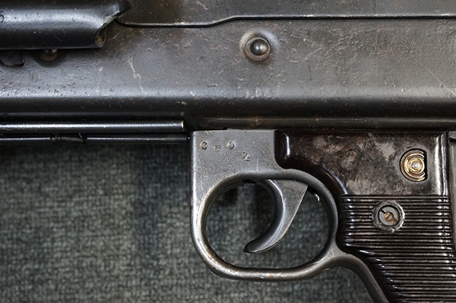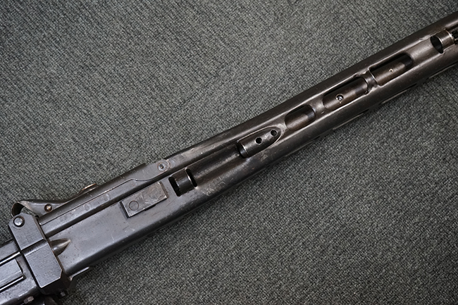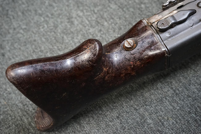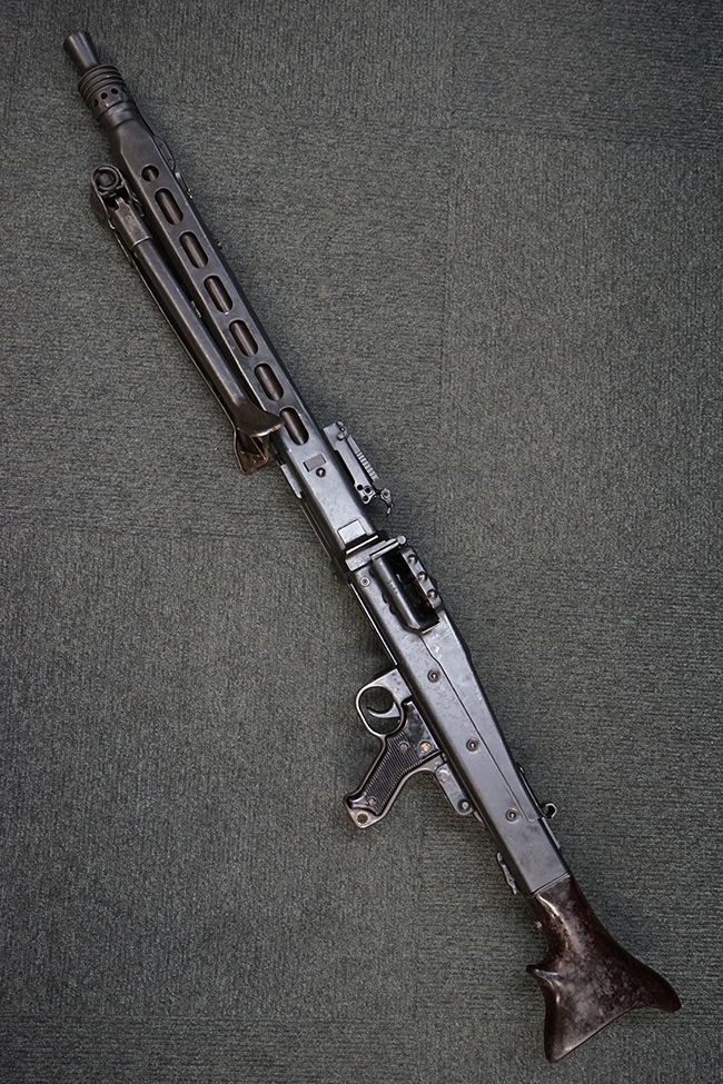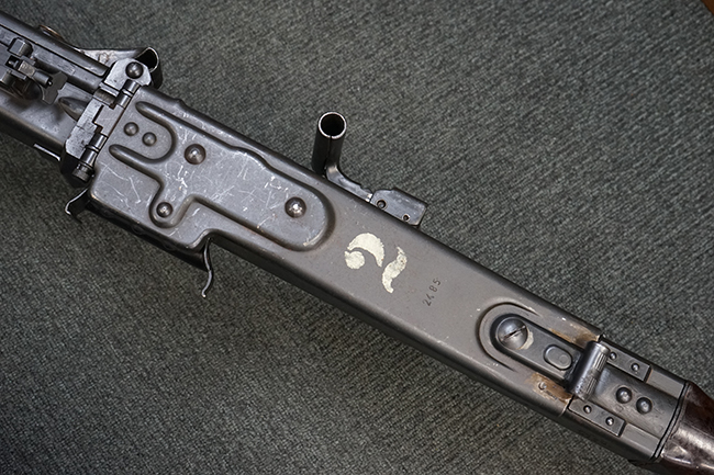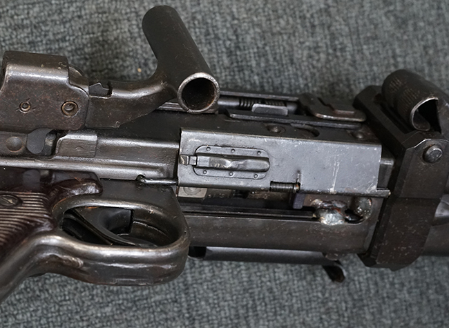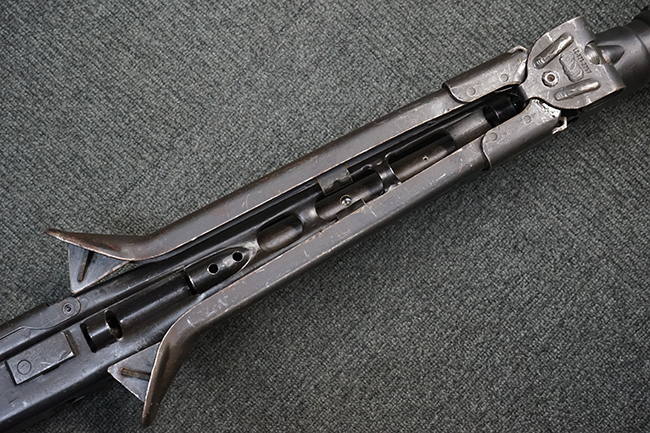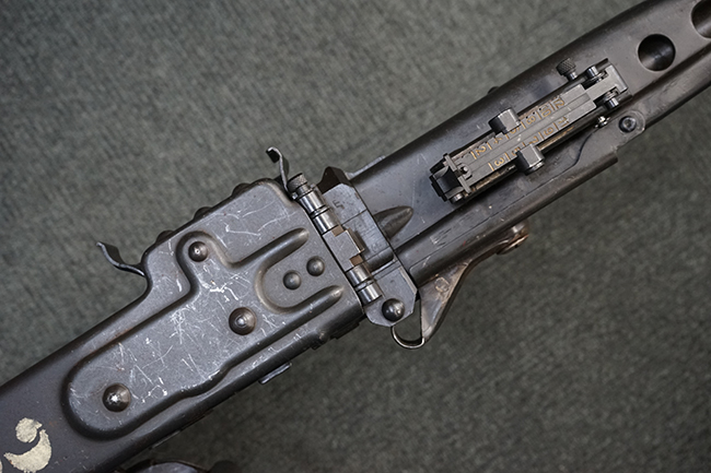 レシーバー左後方側面にはシリアルNo.及びグストロフ社製を示すdfbの刻印が入っており、小部品には大戦中の刻印が打たれています。 また、フィード・カバーにはMG2への改造を示すと思われる「2」のマーキングが施されています。 二脚やフィード・カバー、前後のサイトの起倒は問題ありません。 機関部下面の排莢カバーの開閉やセーフティの切り替えについては問題なく行う事が可能です。 銃身交換ラッチは開く事ができますが、銃身を引き出すハンドが切断されています。 本品は元々フランスの無可動加工が施されていた品で、銃身交換ラッチ周辺やフィード・カバー後端、レシーバー後端下部付近に溶接痕が見受けられます。 バット・ストックは捻じり方向にぐらつきがありますが、MG42の仕様とも言える状態です。