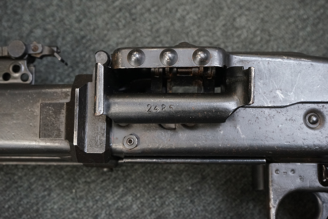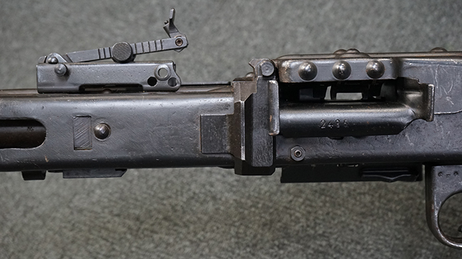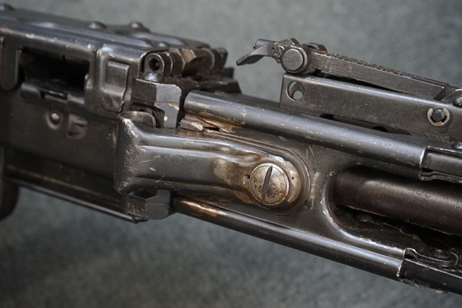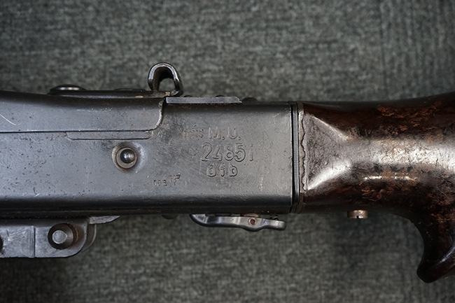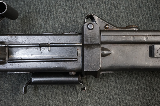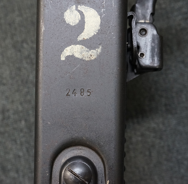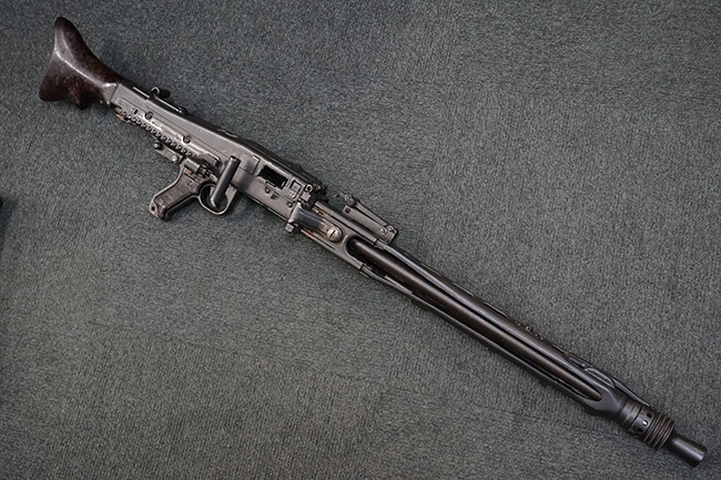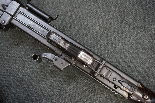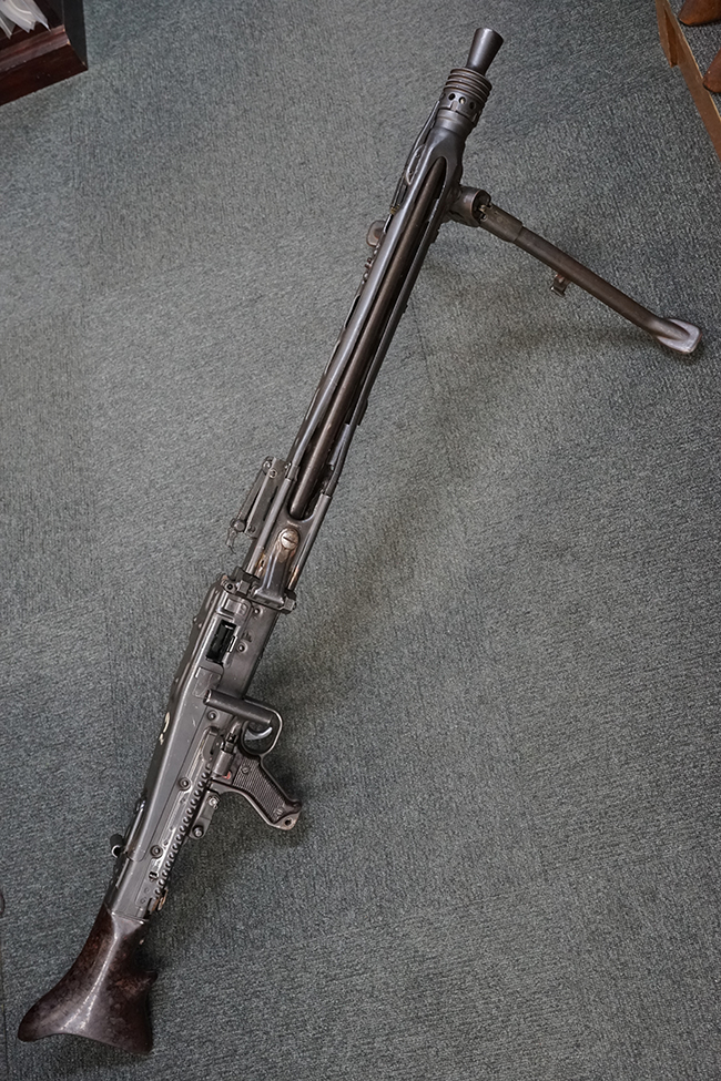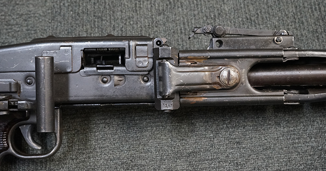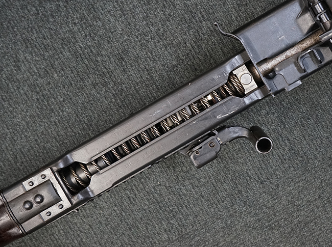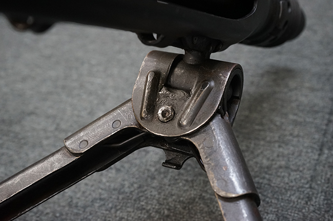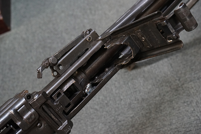 レシーバー左後方側面にはシリアルNo.及びグストロフ社製を示すdfbの刻印が入っており、小部品には大戦中の刻印が打たれています。 また、フィード・カバーにはMG2への改造を示すと思われる「2」のマーキングが施されています。 二脚やフィード・カバー、前後のサイトの起倒は問題ありません。 機関部下面の排莢カバーの開閉やセーフティの切り替えについては問題なく行う事が可能です。 銃身交換ラッチは開く事ができますが、銃身を引き出すハンドが切断されています。 本品は元々フランスの無可動加工が施されていた品で、銃身交換ラッチ周辺やフィード・カバー後端、レシーバー後端下部付近に溶接痕が見受けられます。 バット・ストックは捻じり方向にぐらつきがありますが、MG42の仕様とも言える状態です。